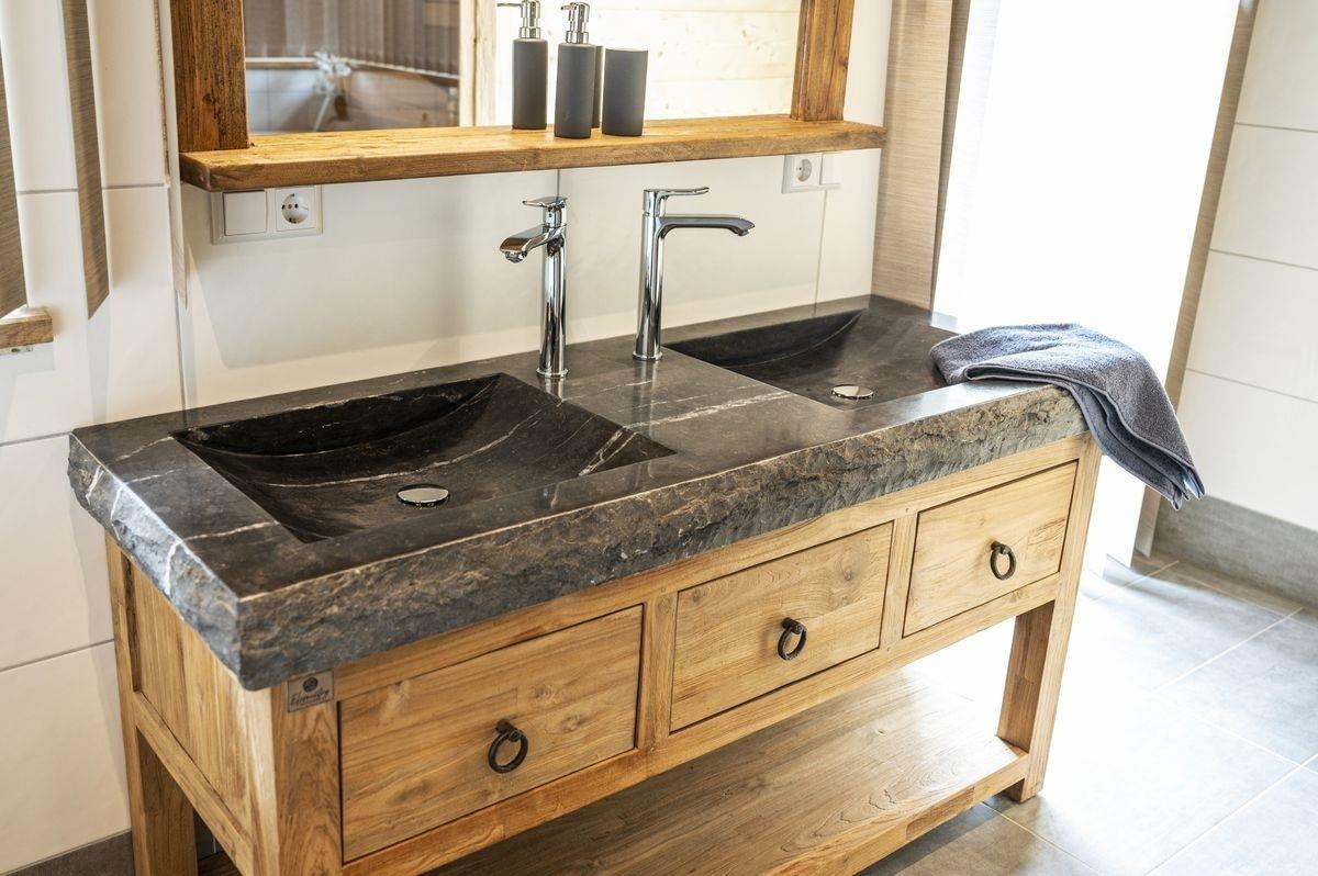 Die Einrichtungsgegenstände und Möbel wie z.B. Eckbank, Esstisch, Garderobe, Türen usw. sind in unseren Almdorf Auszeit Fageralm Premium Chalets aus über 100 Jahre altem recyceltem Teak Holz!