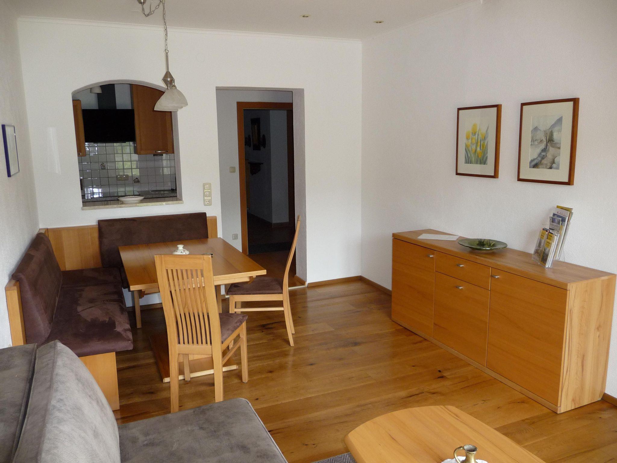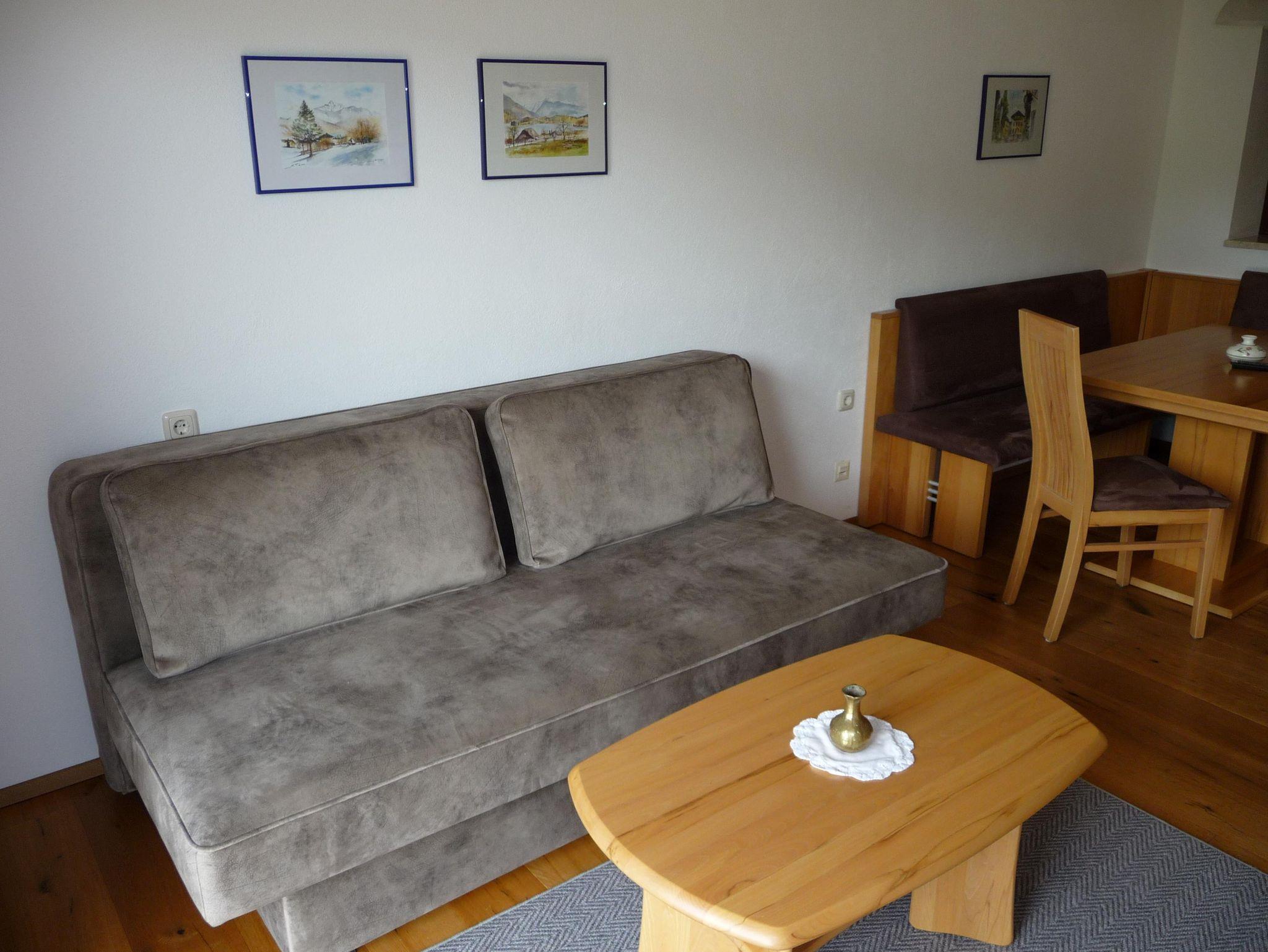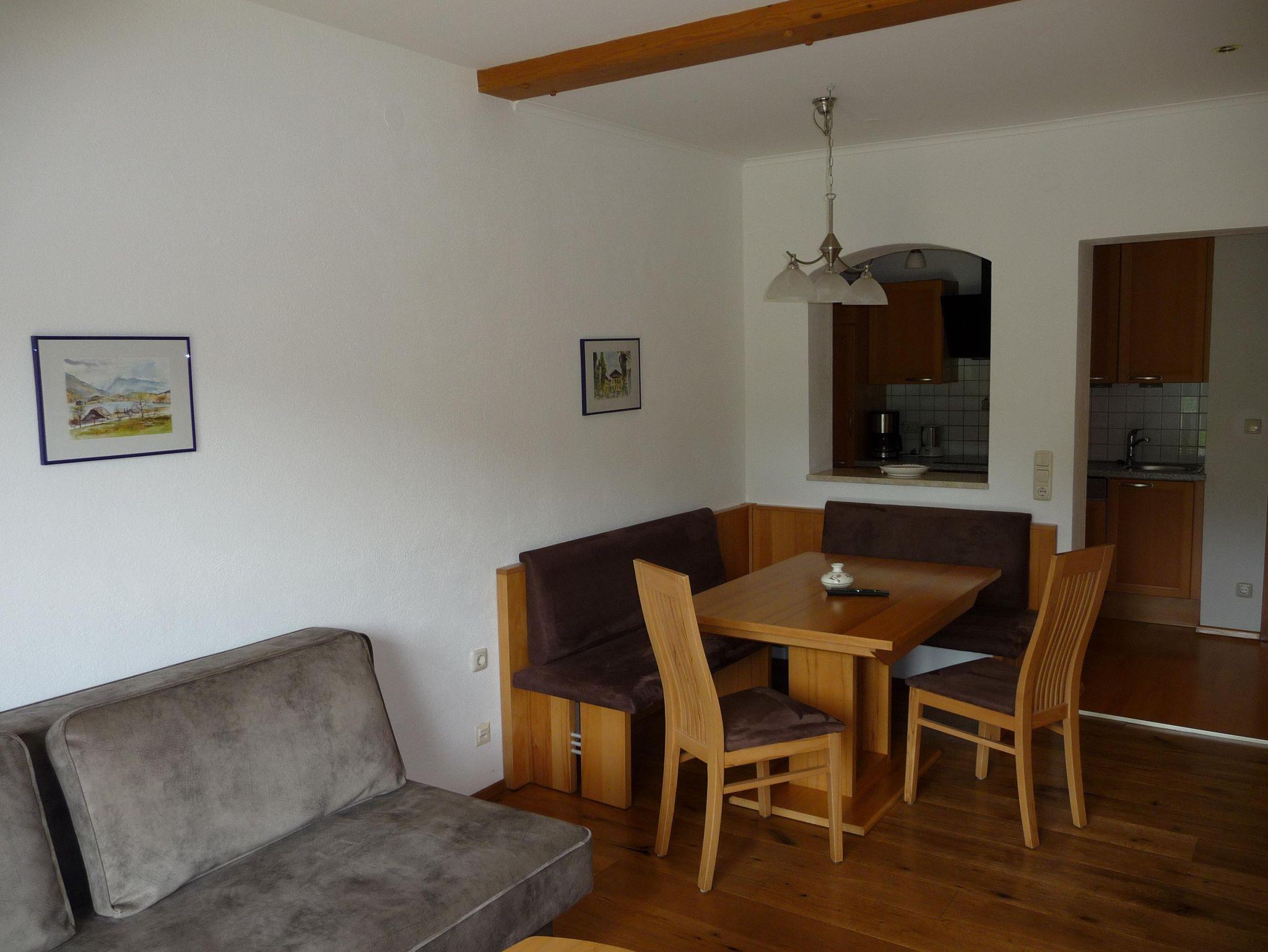 Wohnraum mit Essecke und Stühlen, Flat-TV, ein zweiter TV im Schlafzimmer.