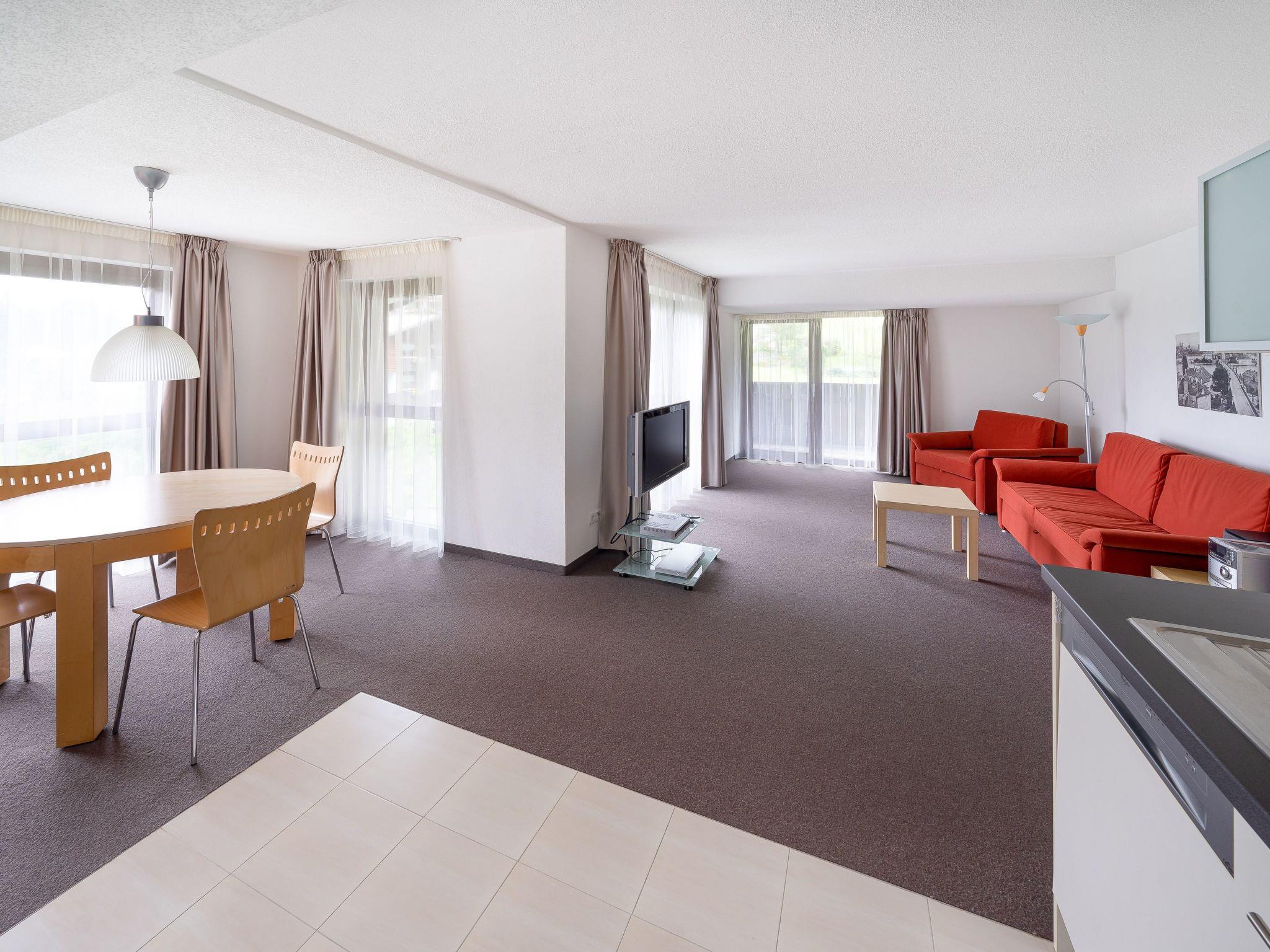Type 2: 2-5 persons (61 m²) with a separate living room and bedroom. The flat is generously proportioned and equipped with every comfort and has satellite TV, radio with CD player, DVD player, telephone and FREE internet connection (network/WLAN connection). The bathroom has a bathtub, double washbasin and a separate WC with washbasin. The kitchen is equipped with a dishwasher, microwave, coffee machine, cooker with oven and kettle.
