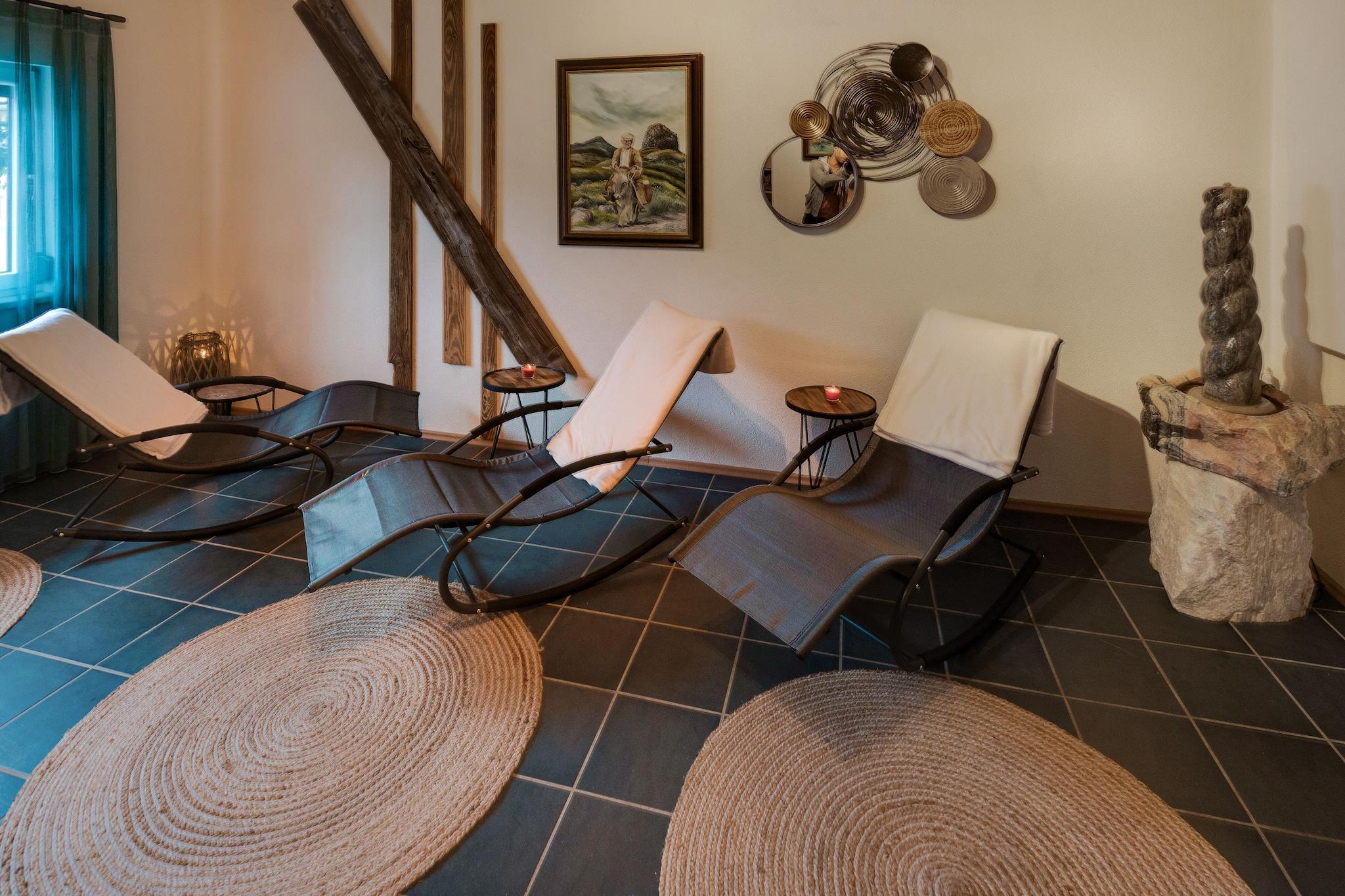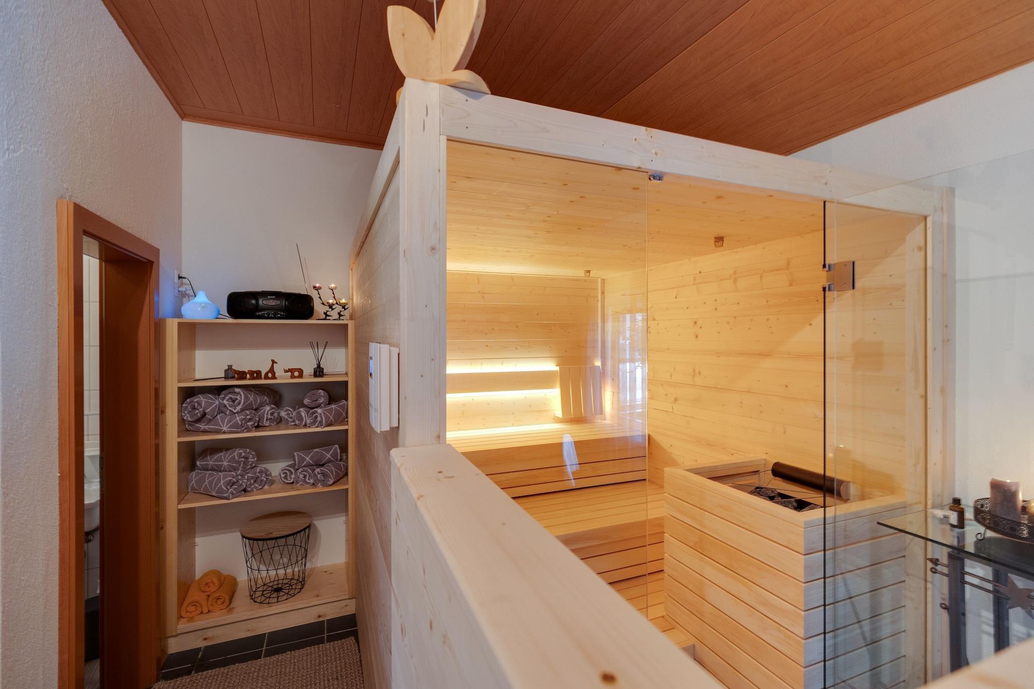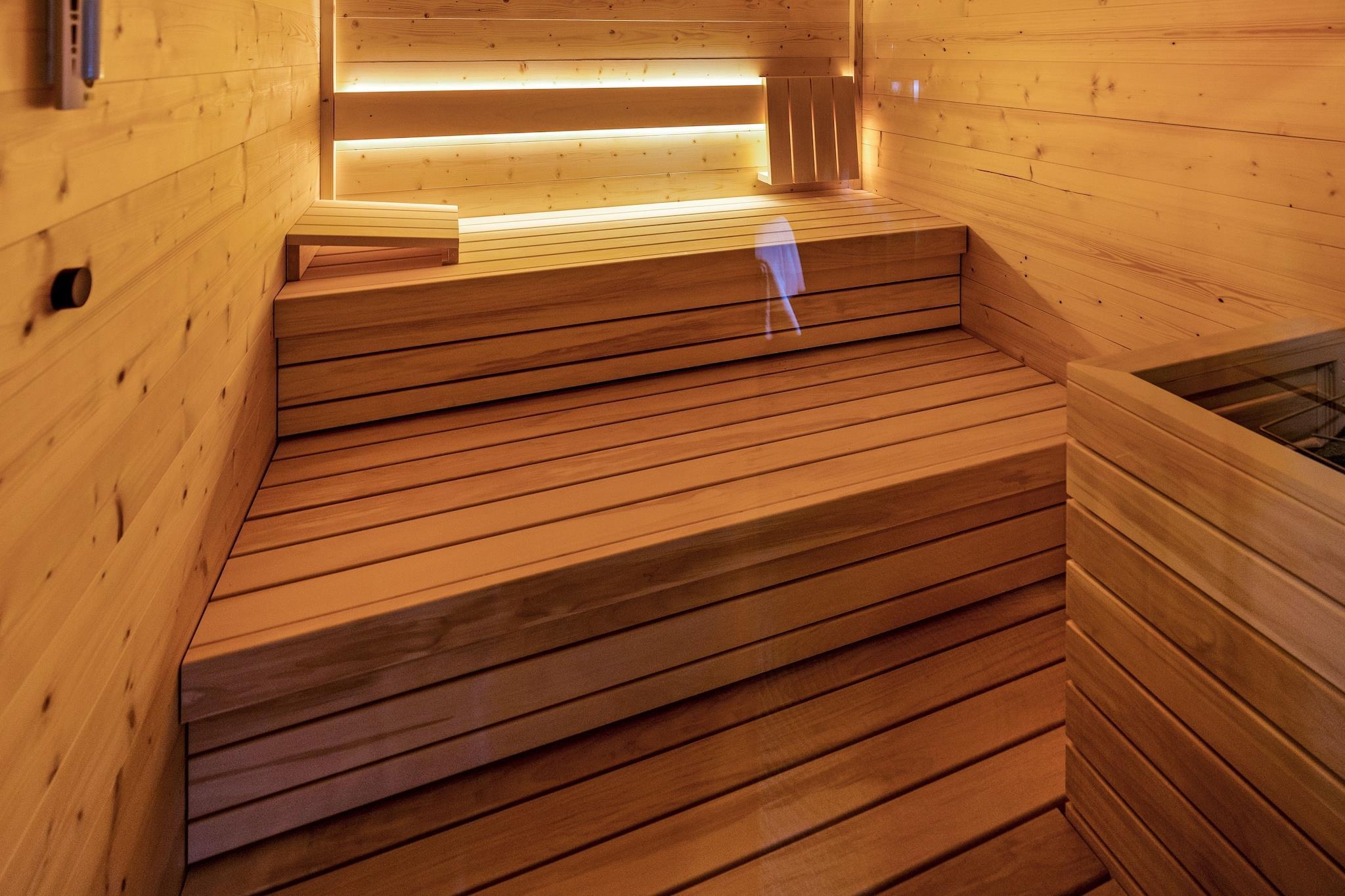 Stueetage: (Stue(dobbeltsovesofa(140 x 200 cm), Fjernsyn(parabol)), åbent køkken(komfur, kaffemaskine, ovn, mikrobølgeovn, opvaskemaskine , køle-fryseskab, håndvask), soveværelse(king size-seng(180 x 200 cm)), badeværelse(badekar, håndvask), badeværelse(håndvask, toilet)) sauna(deles med andre gæster, 6 personer), vaskemaskine(deles med andre gæster), varme(central), terrasse, have(deles med andre gæster), havemøbler, grill, parkering, trampolin, swimmingpool(deles med andre gæster, opvarmet), legeredskaber, dart, cykler til rådighed
