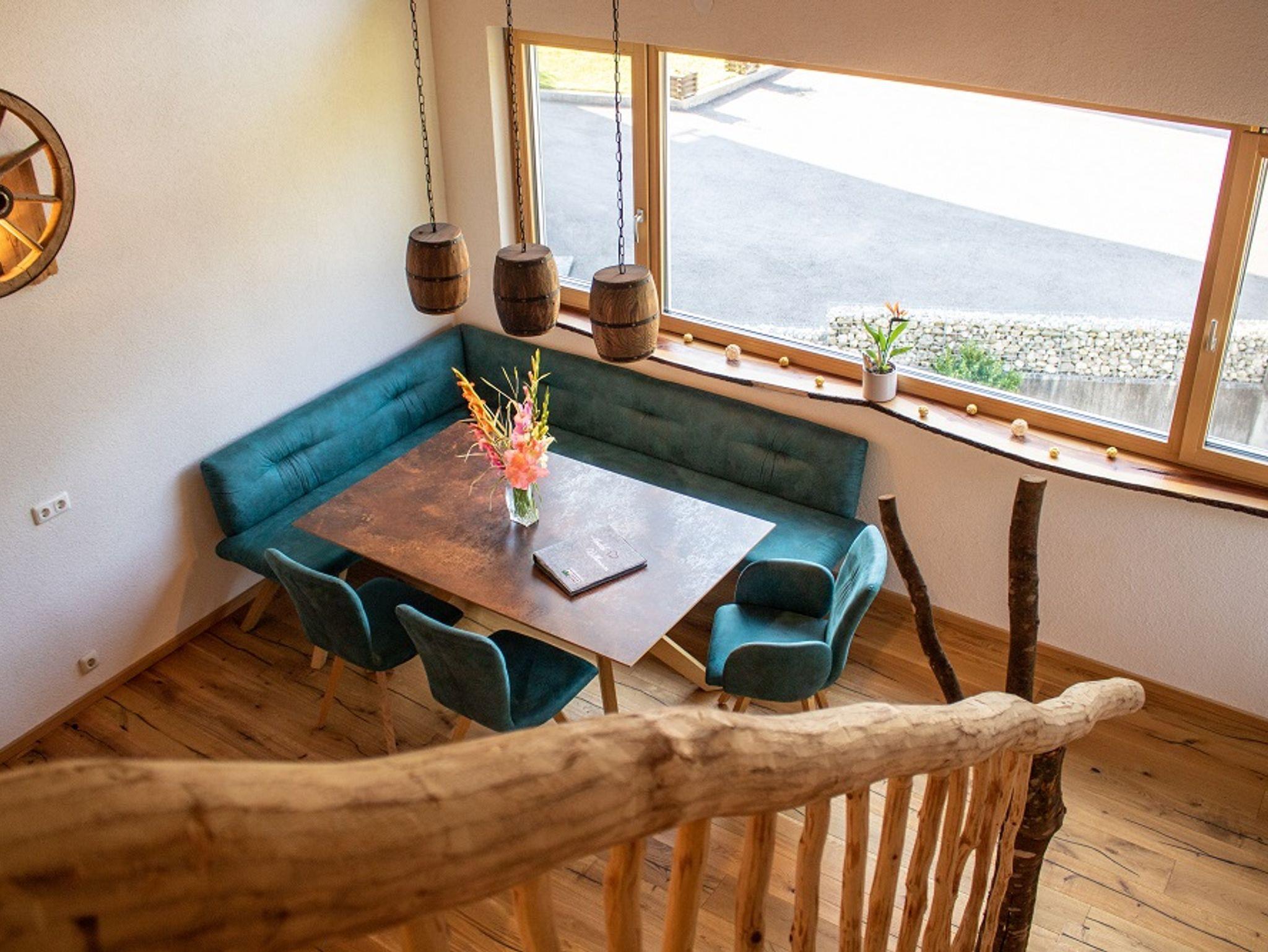 Unsere im Frühjahr 2019 neu erbaute Ferienwohnung „ Almheu“ verfügt über eine top ausgestattete Wohnküche mit gemütlicher Sitzecke und Blick Richtung Gosaukamm.