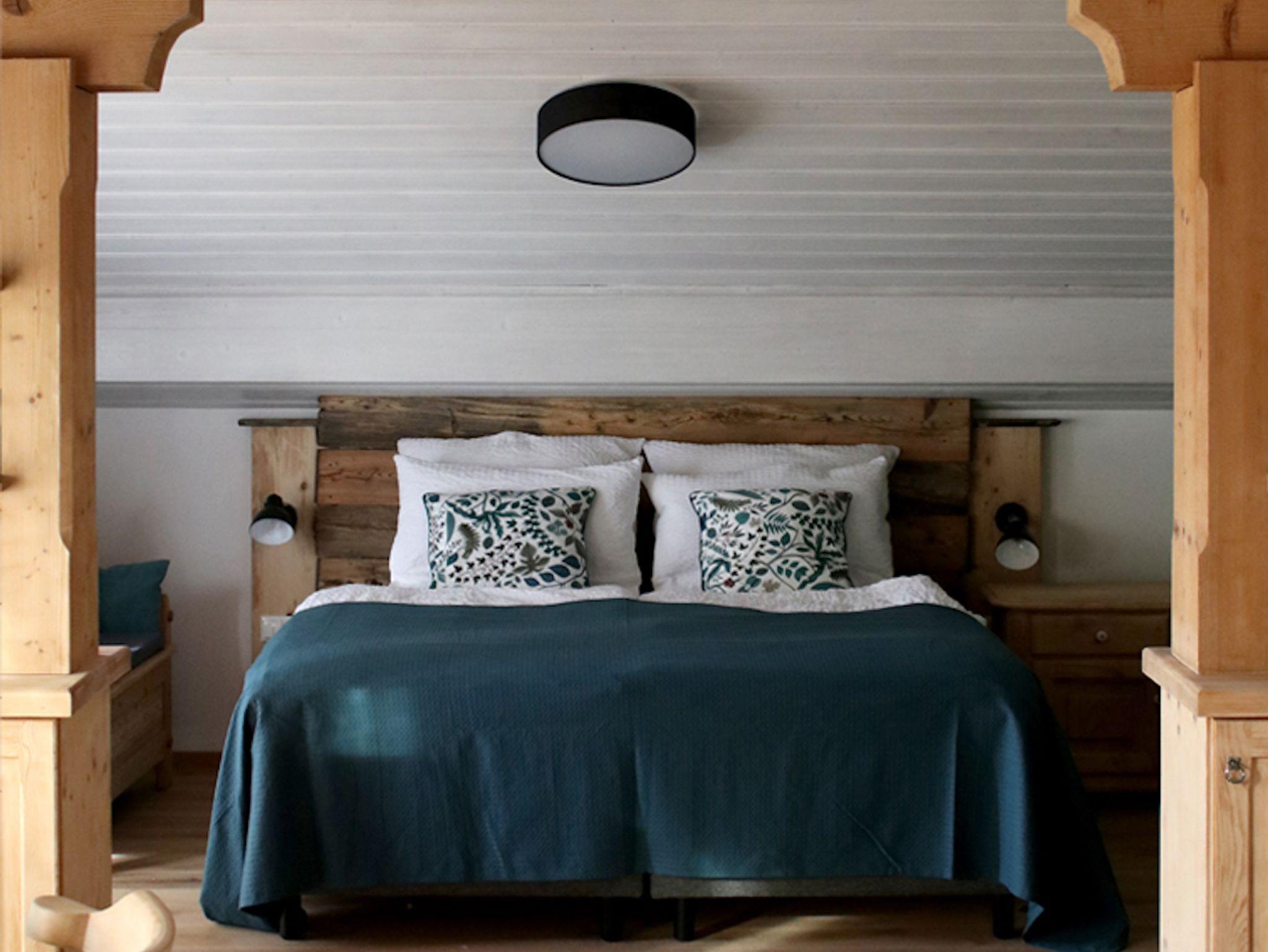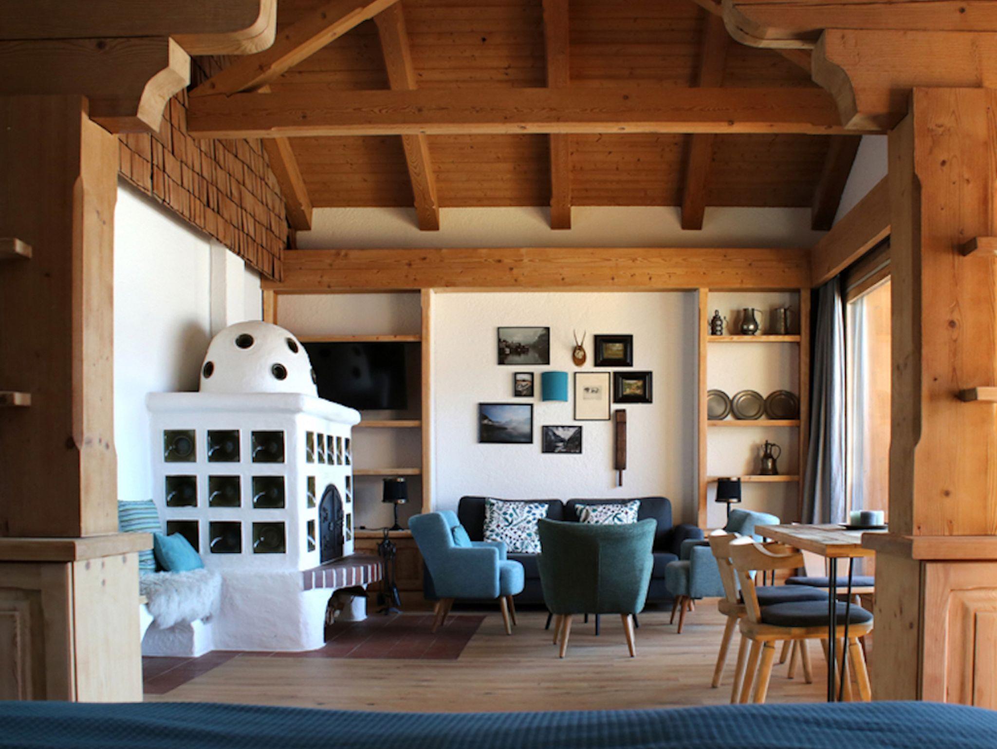 Das 2. „Himmelstürmer-Quartier“ im Dachgeschoss mit Blick auf den imposanten Gosaukamm. Dieser schöne Sonnenplatz hat sich als erstes in unser Herz geschlichen und uns letztendlich dazu bewegt, das Dachstein7 zu realisieren. Der Kachelofen und der urige, offene Dachstuhl runden das Wohlfühlerlebnis ab. Aus dem Bett blickt man direkt auf unseren Lieblingsberg. Um den Raum luftig und offen zu halten, trennen wir den Schlafbereich lediglich mit einem Vorhang ab.