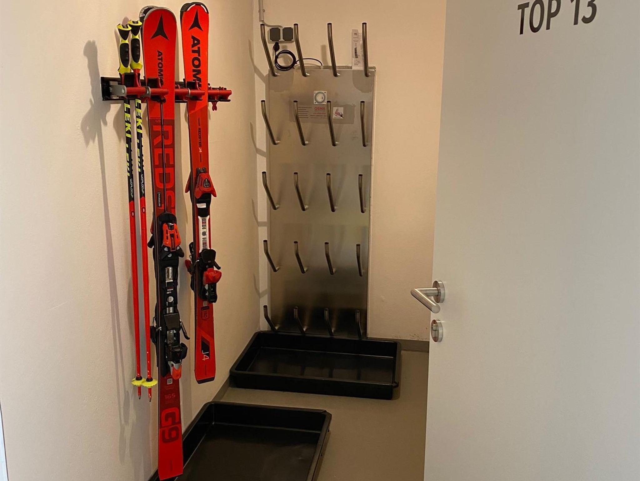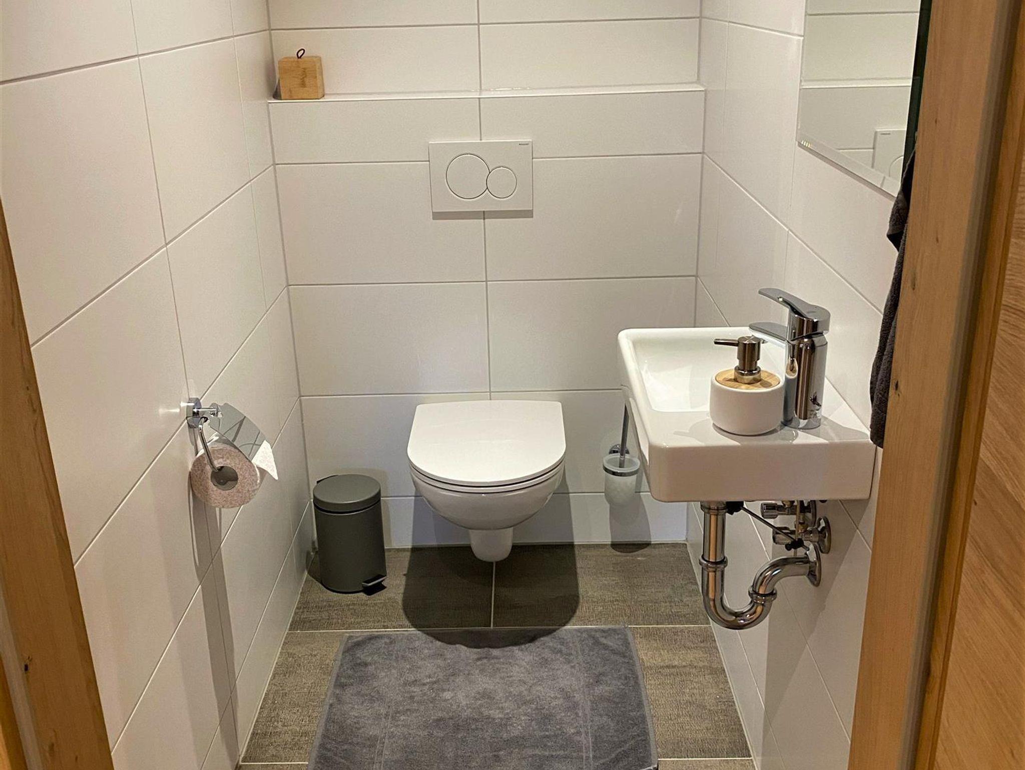 Das Bad ist ausgestattet mit einer großzügigen Dusche, ein Doppelwaschbecken, Waschmaschine und Trockner sind ebenfalls vorhanden. Handtücher und Bettwäsche stehen zur Verfügung. Im Keller befindet sich der eigene Skiraum inkl. Skiaufbewahrung und Skischutrockner.