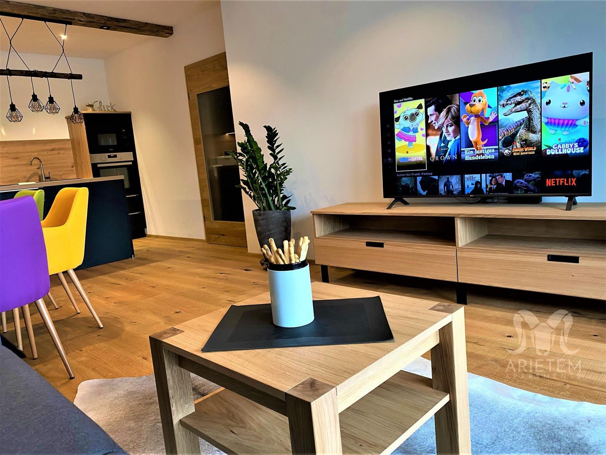 Das hochwertig eingerichtete Arietem Apartment vom myNests im Herzen Gröbming bietet Platz für bis zu 6 Personen. Mit seinem rustikal modernen Charme biete das Apartment eine gemütliche entspannende Atmosphäre mit 2 Schlafzimmern (Doppelbetten) und einem Schlafsofa im Wohnbereich. Einen wunderschönen Ausblick auf die Berge haben sie auf der großzügigen Terrasse wo sie laue Sommerabende bei einer Grillerei ausklingen lassen können. Das Apartment verfügt über zwei Schlafzimmer und eine vollausgestattete Küche mit Geschirrspüler, Backofen, Kaffeemaschine und Mikrowelle. Ein Flat-TV inkl. Netflix und Canal+ ist vorhanden.