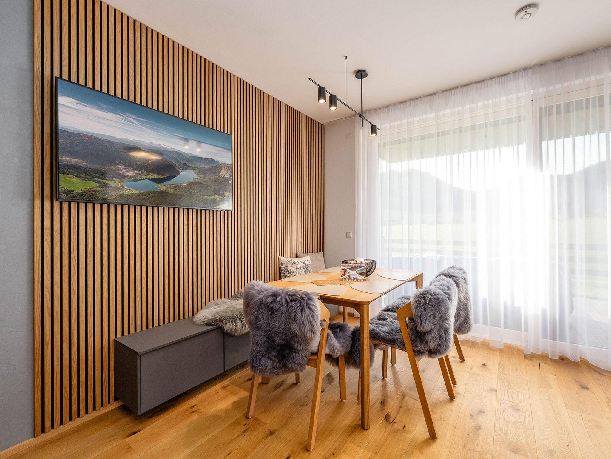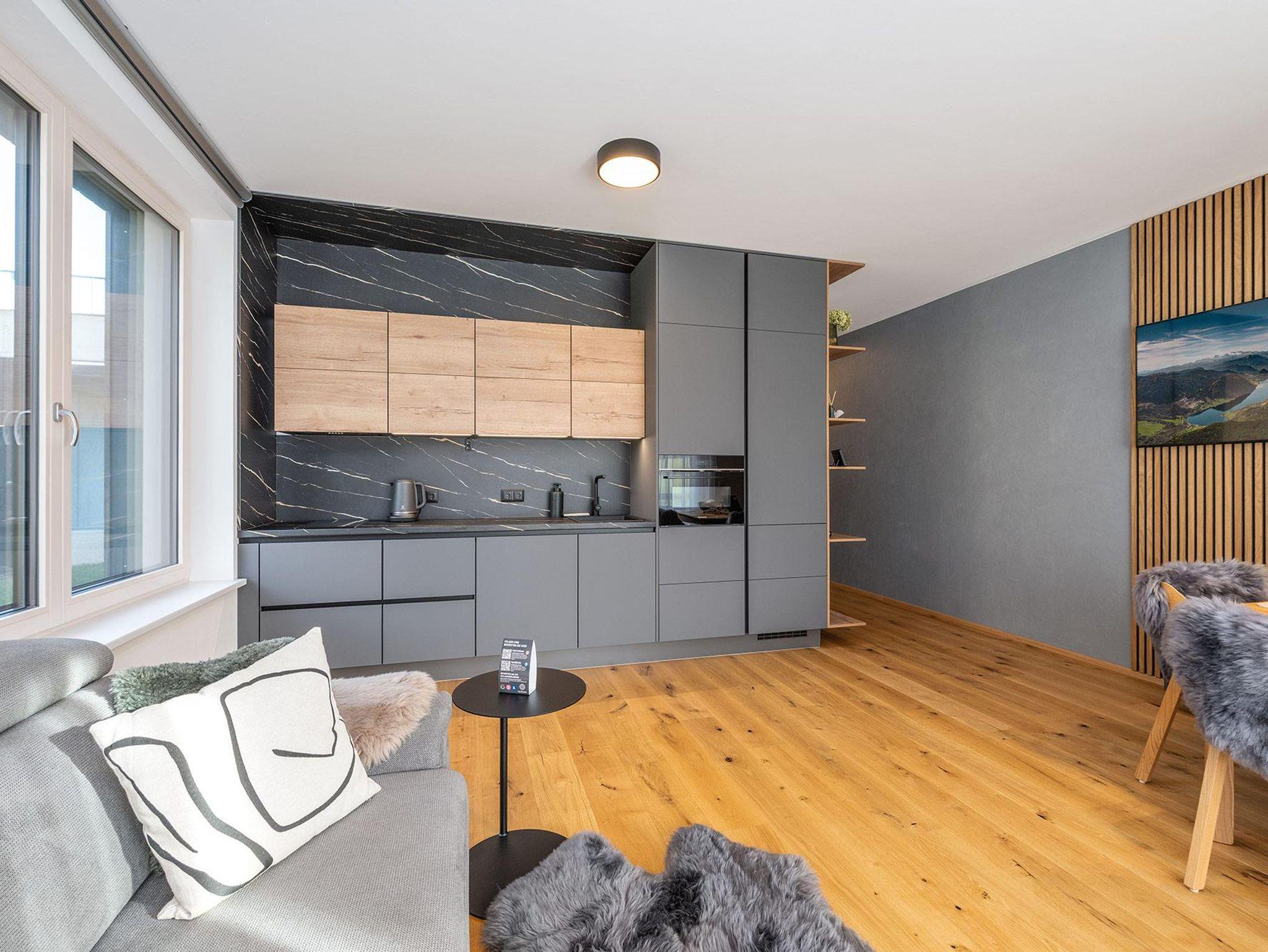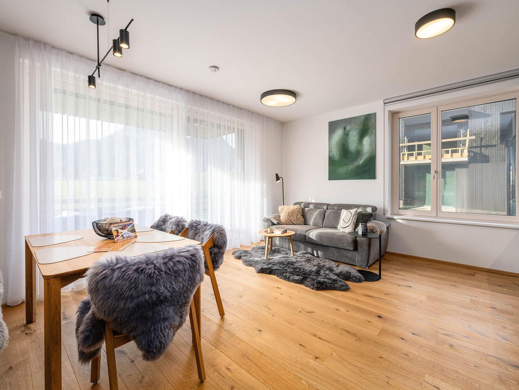 Das Schlafzimmer verfügt über ein großzügiges 180-cm-Doppelbett, im Wohnbereich bietet ein hochwertiges Schlafsofa zusätzlichen Platz. Die Westterrasse lässt Sie die Nachmittagssonne genießen – mit einem beeindruckenden Panorama auf Stoderzinken und Kammspitz, das seinesgleichen sucht.