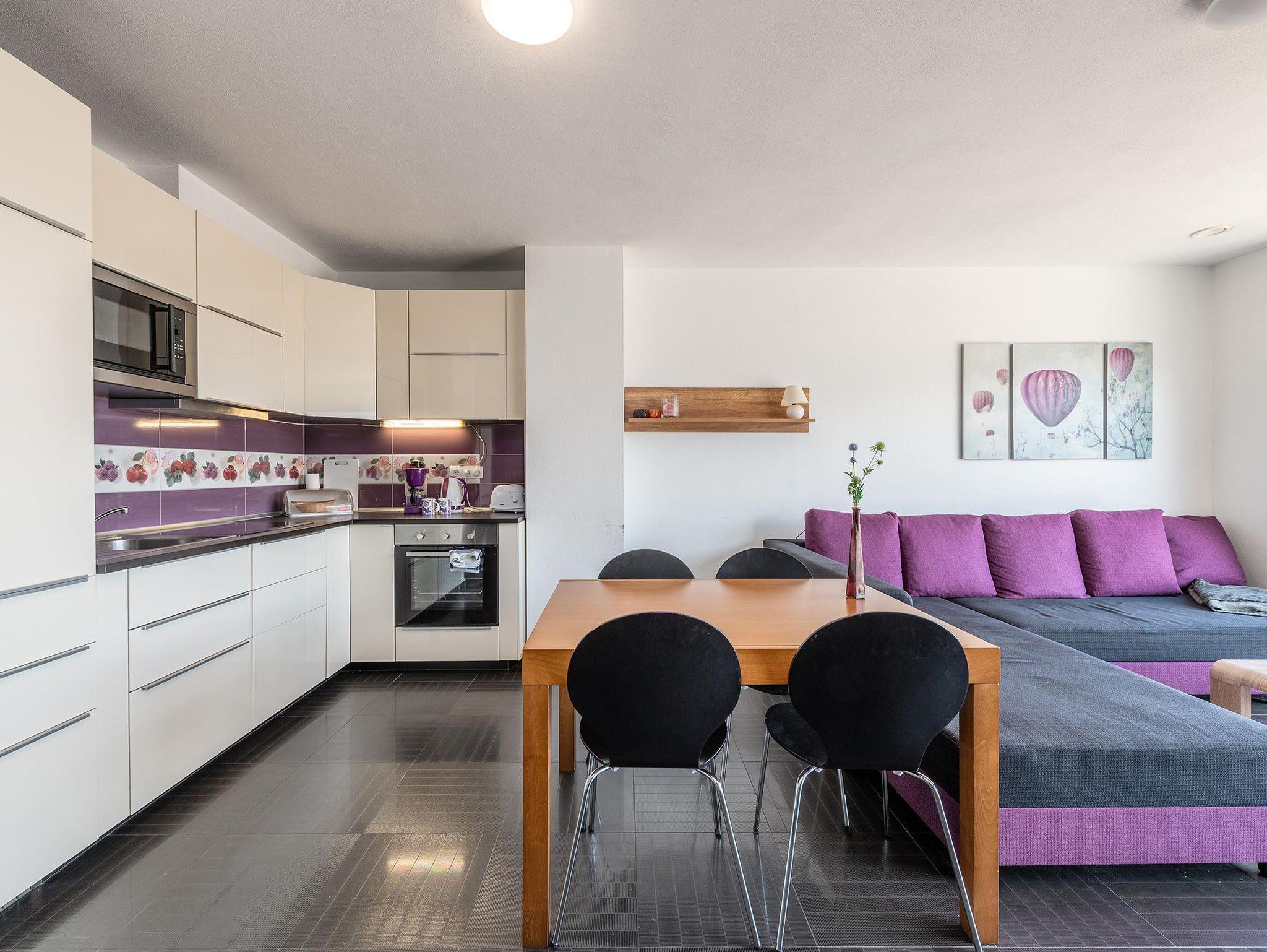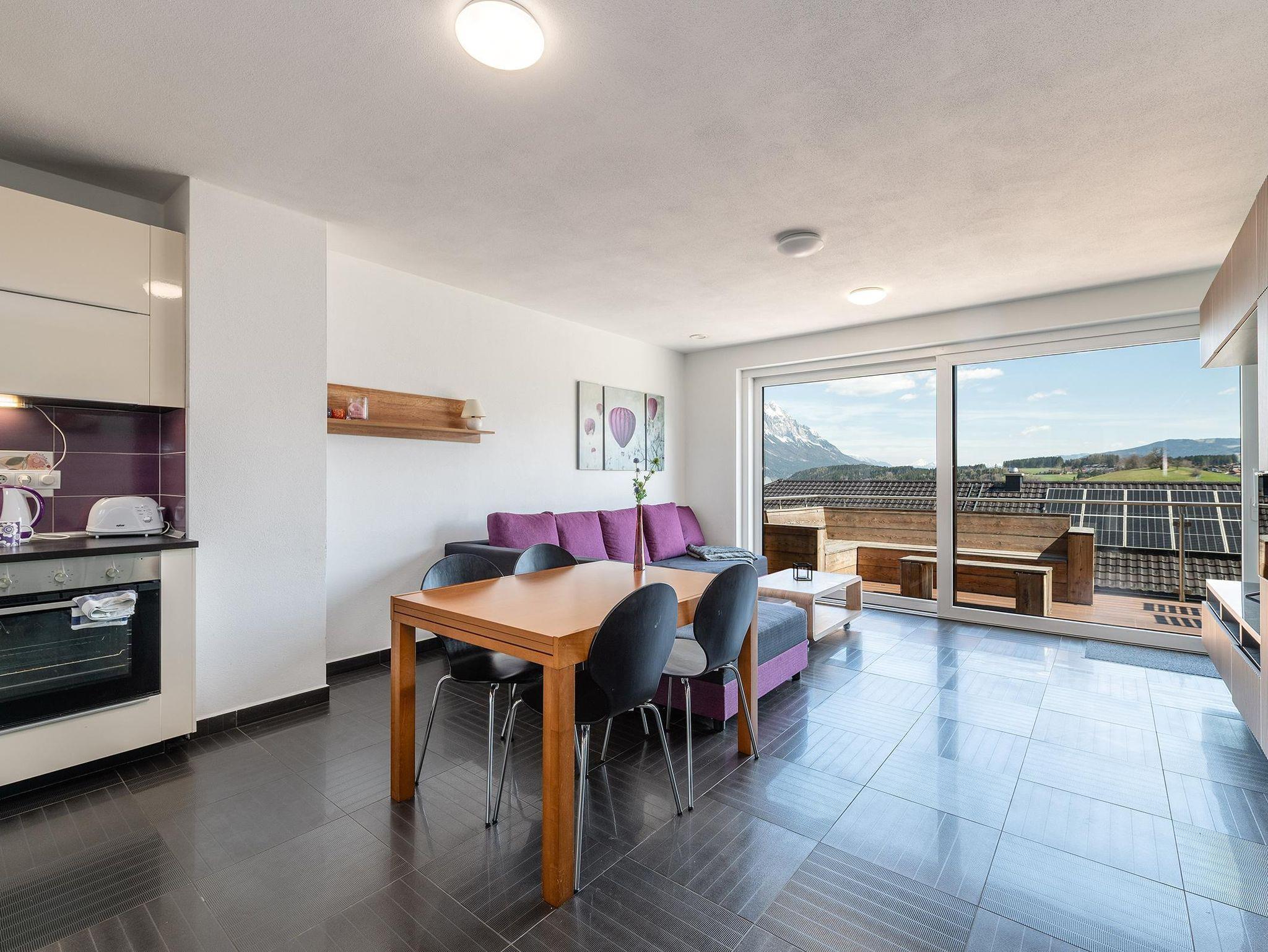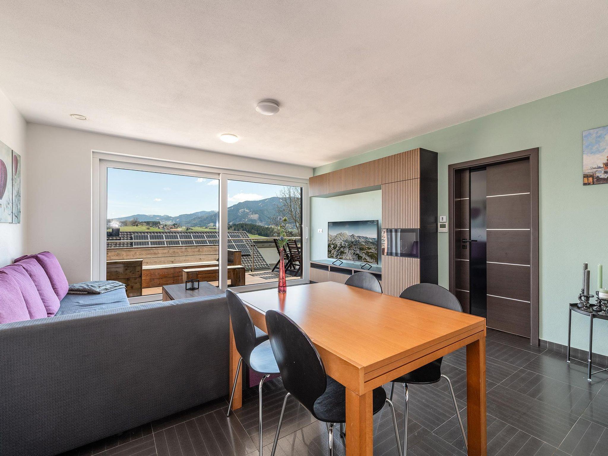 Das Apartment punktet mit einer voll ausgestatteten Küche. Die großzügige Terrasse lädt zum Entspannen ein. Genießen Sie das schöne Wetter auf den bequemen Gartenmöbeln oder machen Sie es sich auf den Liegen gemütlich und lassen Sie die Seele baumeln. Von der Terrasse aus haben Sie einen Panoramablick auf die Umgebung – der perfekte Ort, um den Tag ausklingen zu lassen. Ein wundervoller Ausblick auf die Berge.