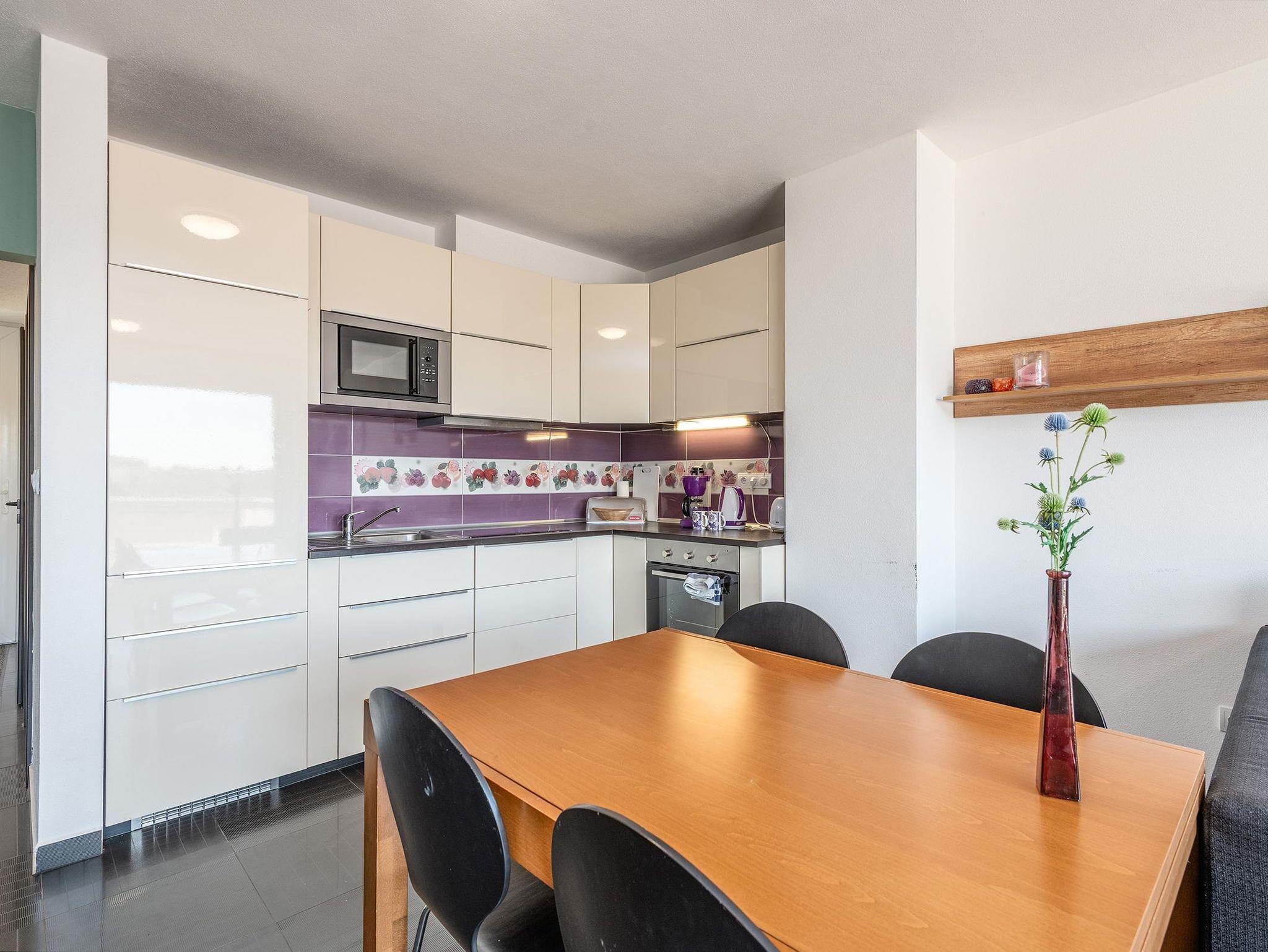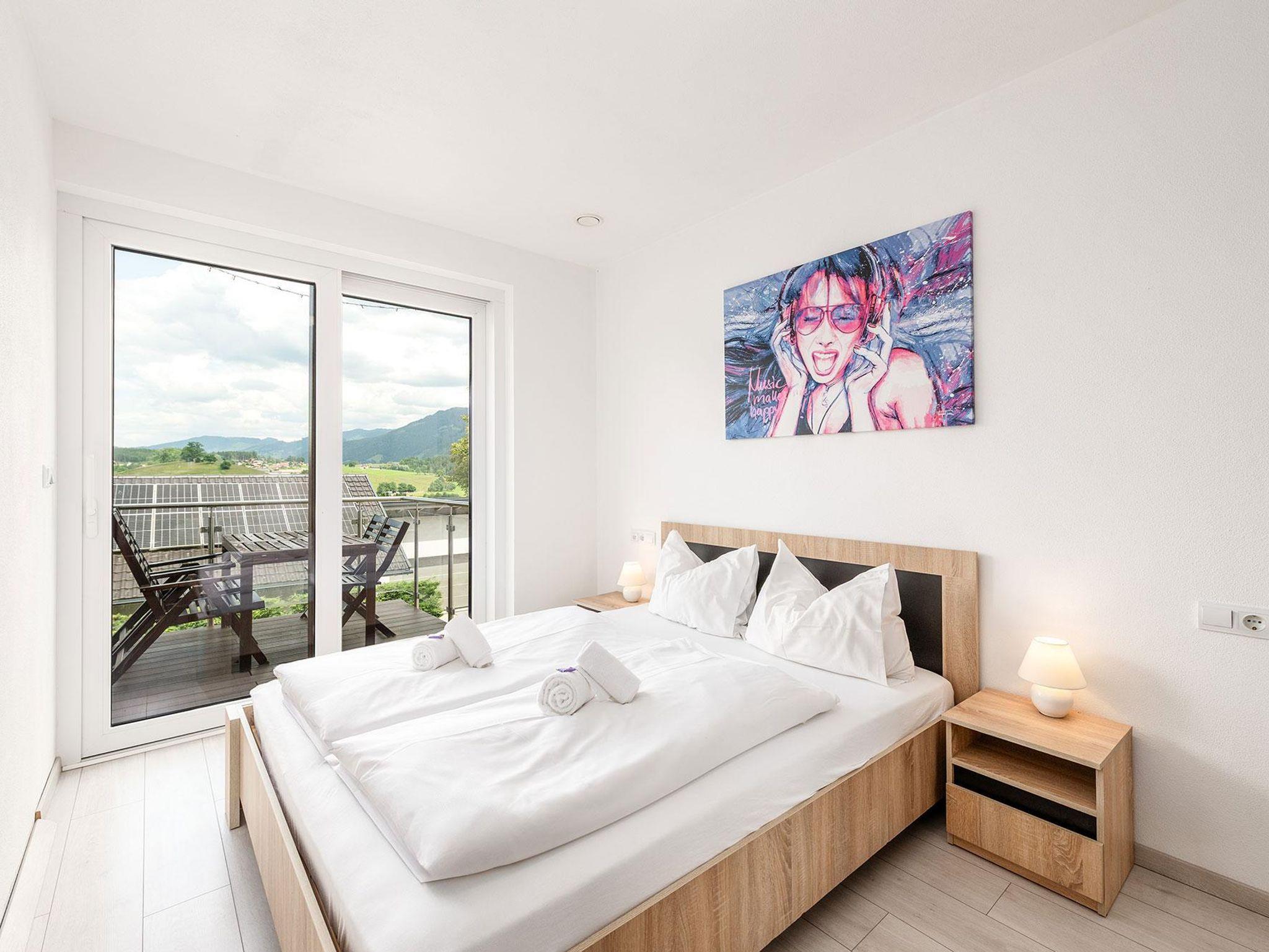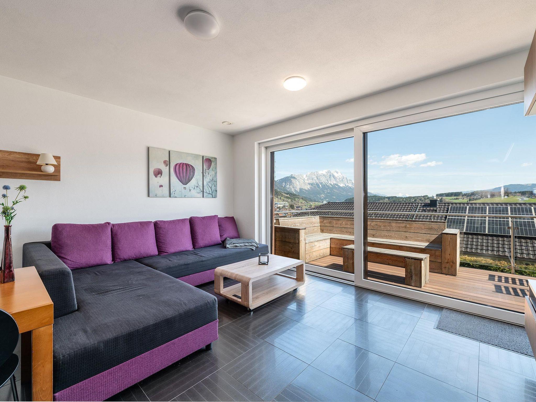Das Apartment punktet mit einer voll ausgestatteten Küche. Die großzügige Terrasse lädt zum Entspannen ein. Genießen Sie das schöne Wetter auf den bequemen Gartenmöbeln oder machen Sie es sich auf den Liegen gemütlich und lassen Sie die Seele baumeln. Von der Terrasse aus haben Sie einen Panoramablick auf die Umgebung – der perfekte Ort, um den Tag ausklingen zu lassen. Ein wundervoller Ausblick auf die Berge.