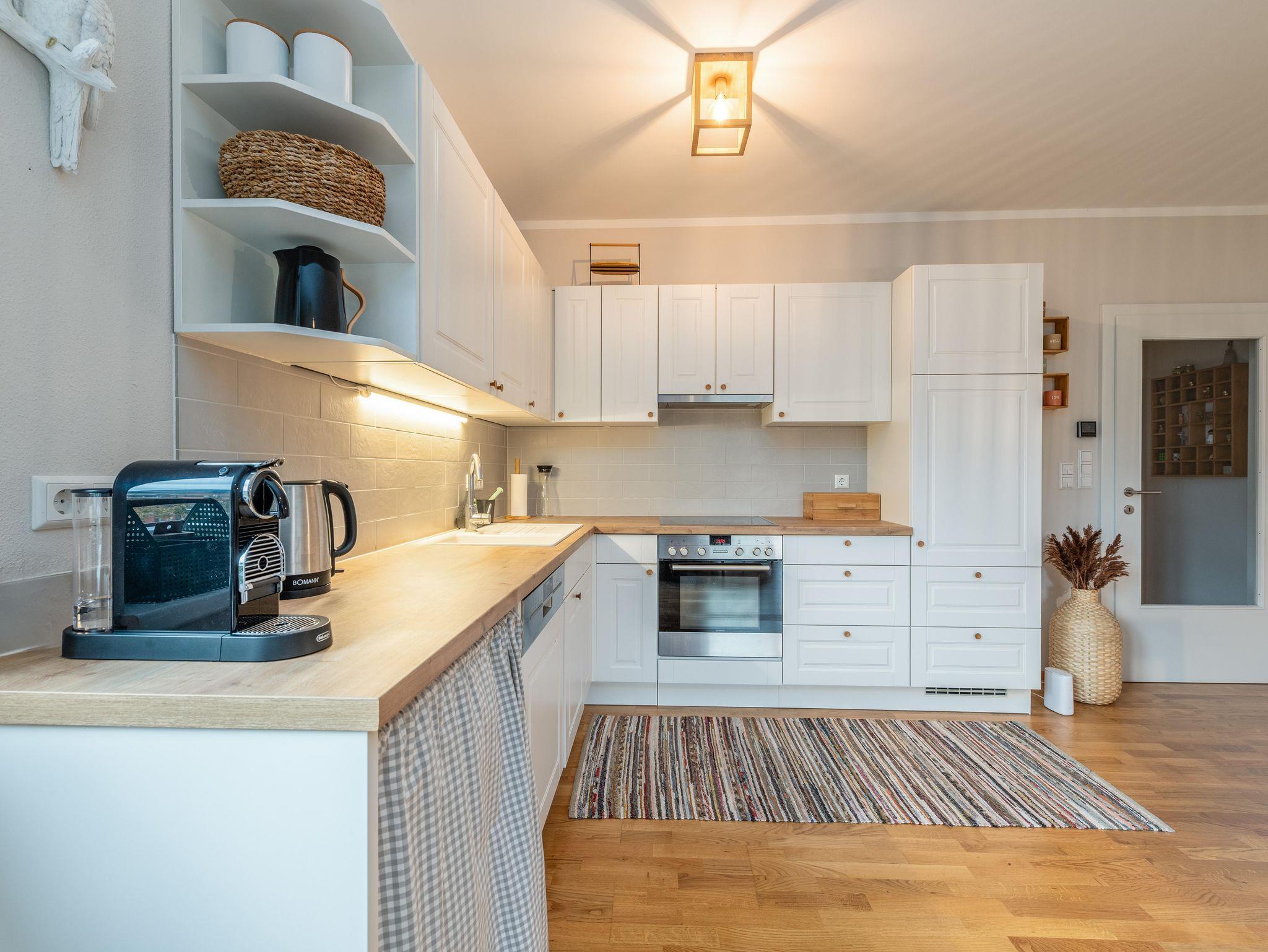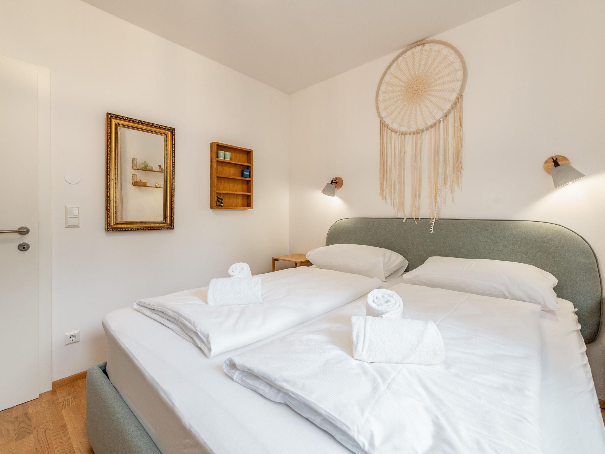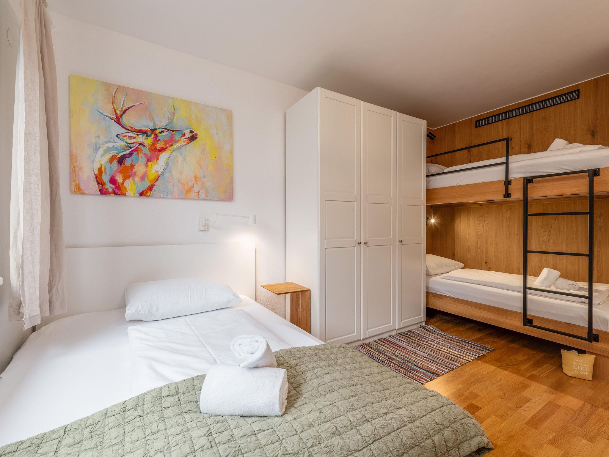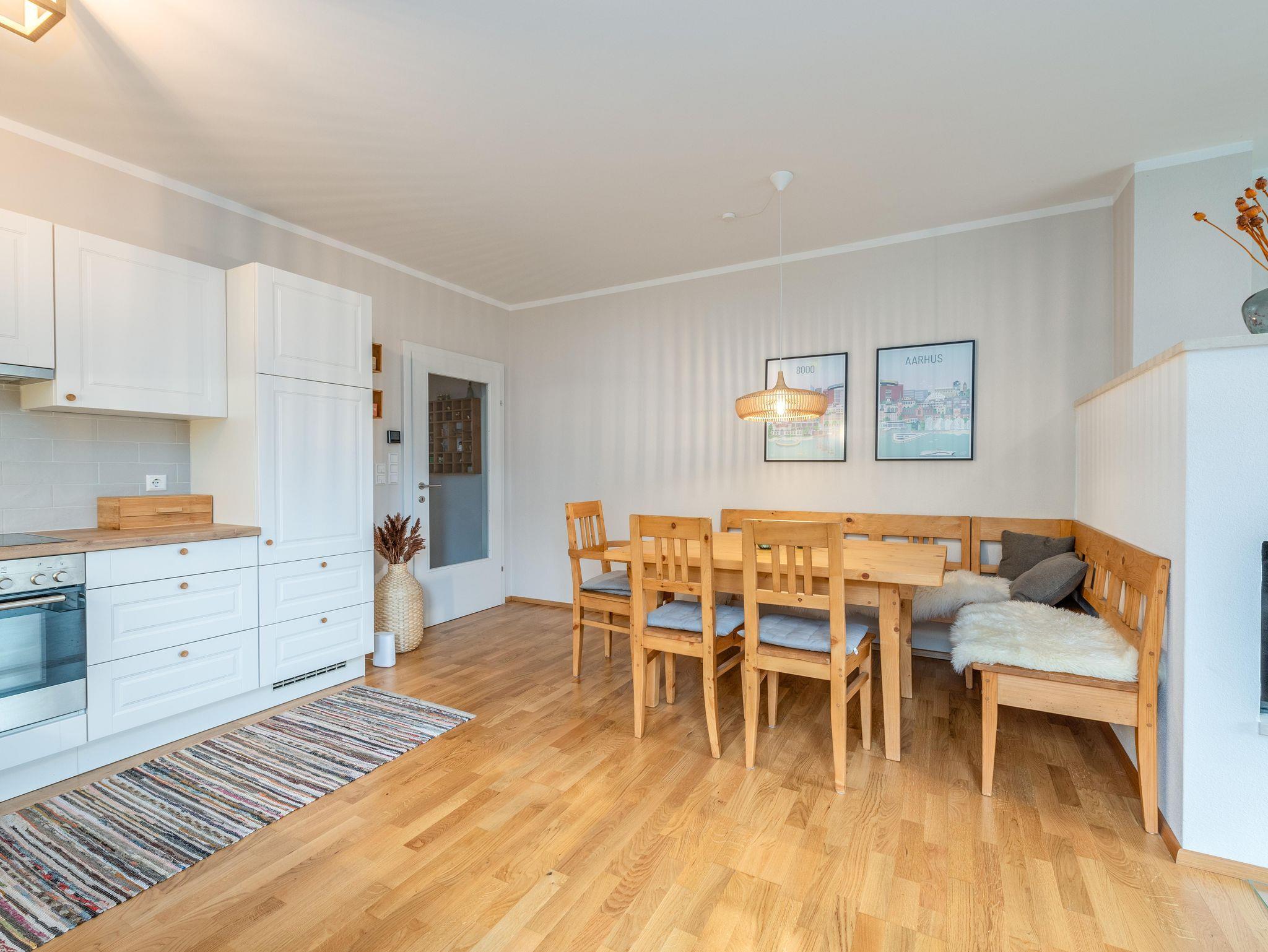 Das Apartment bietet mit 2 Schlafzimmern (1x mit Doppelbett u. 1x mit Doppelbett + Etagenbett) Platz für bis zu 6 Personen. Ein heller Wohnraum mit Couch, Essbereich und Zugang auf den Balkon, sowie eine voll ausgestattete Küche bieten einen komfortablen Aufenthalt. Das Apartment verfügt außerdem über ein großes Badezimmer mit barrierefreier Dusche und Badewanne sowie einer separaten Toilette. Ebenfalls steht ein großer Abstellraum zur Verfügung.