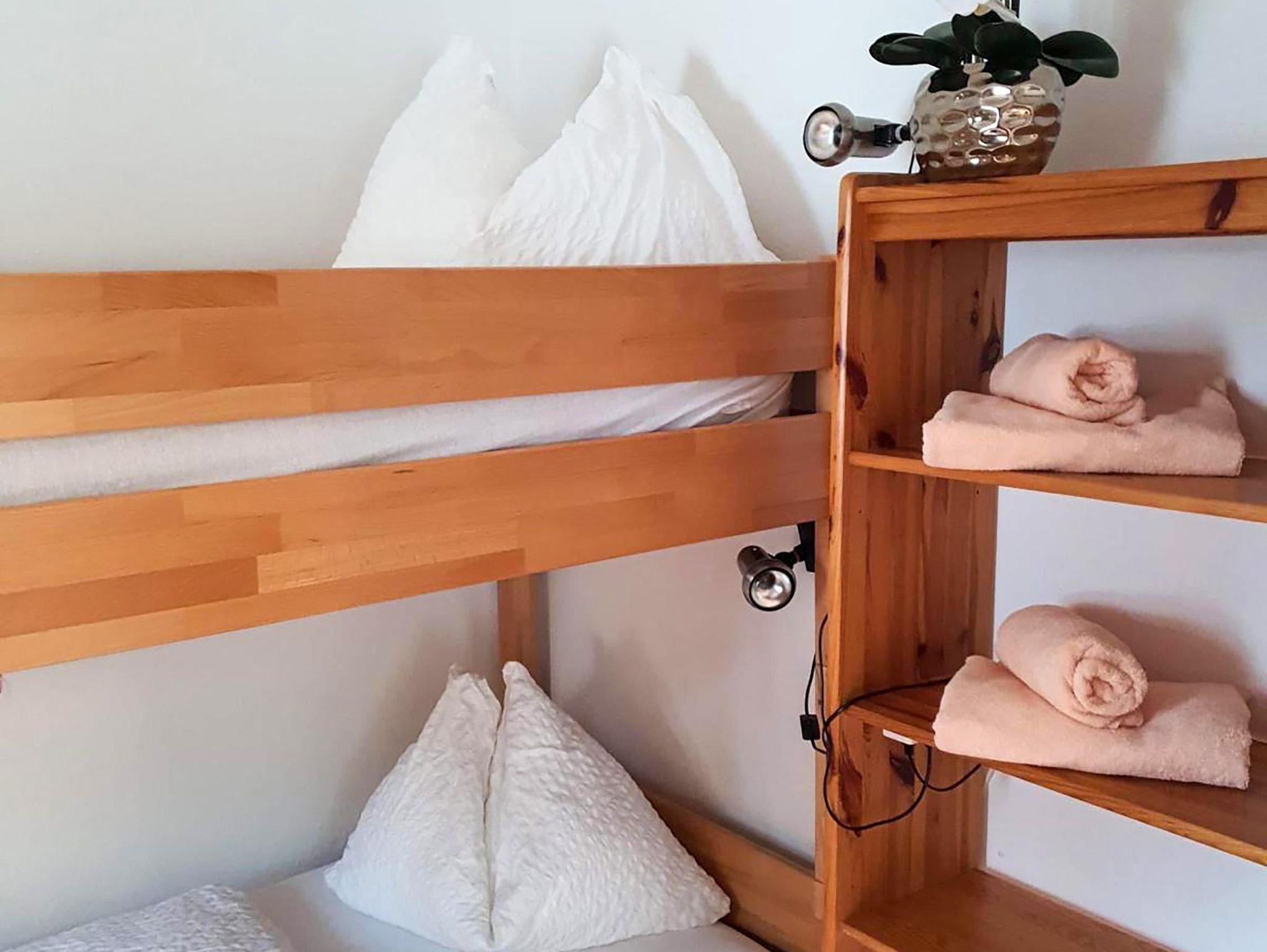 Das Apartment Julius bietet ebenfalls Platz für bis zu 6 Personen, hat 2 Schlafzimmer (1x mit Doppelbett, 1x mit Etagenbett) sowie ein Schlafsofa für zwei weitere Gäste. Das Badezimmer beinhaltet Dusche und Badewanne, das WC ist separat.