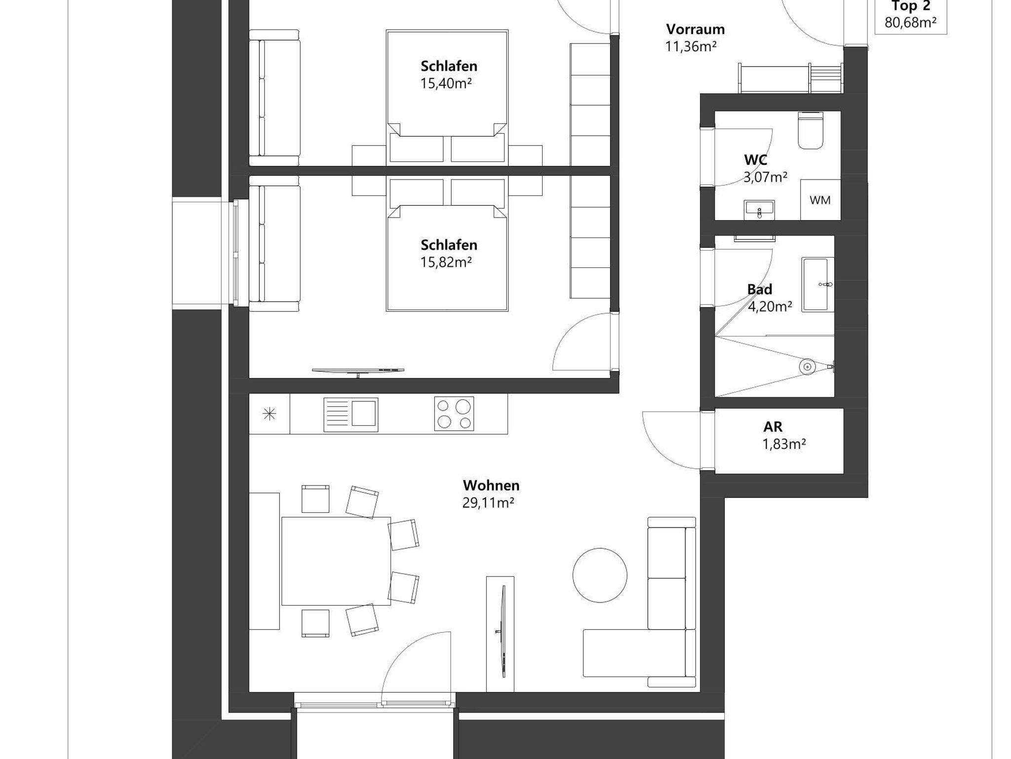 Das Apartment Maria verfügt über 2 gemütliche Schlafzimmer, 1 modernes Bad, ein separates WC sowie einen großen Wohnraum. Eine Terasse bietet zusätzlich Platz zum Entspannen. Ideal für Familien oder Gruppen, die Wert auf Raum und Komfort legen.