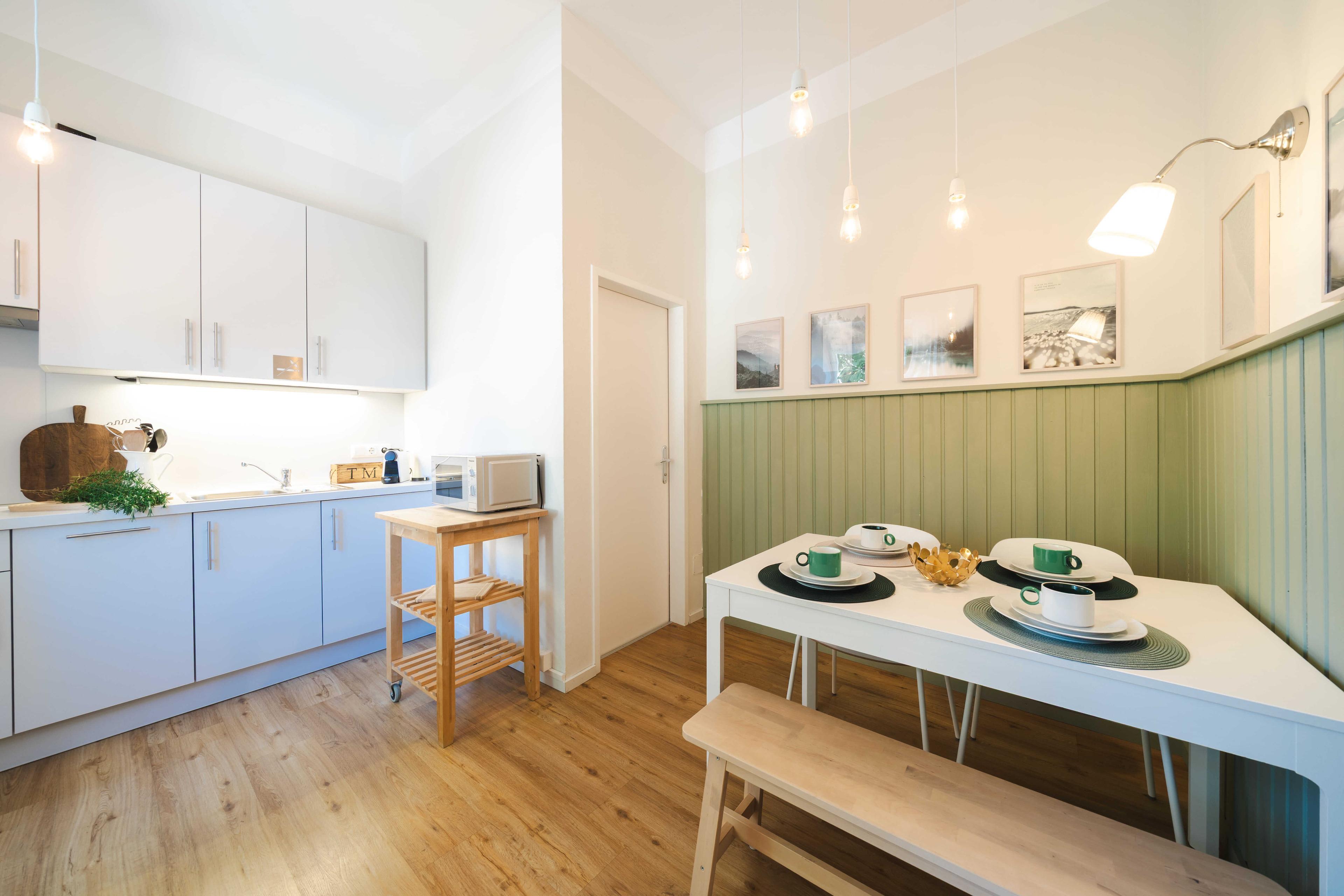 Das Appartement verfügt über eine voll eingerichtete Küche, ein Badezimmer mit Dusche und Waschmaschine, inklusive Trocknerfunktion. Unser "grünes" Wohlfühl-Apartment lädt zum Verweilen ein und zwar auch gerne für längere Zeit.