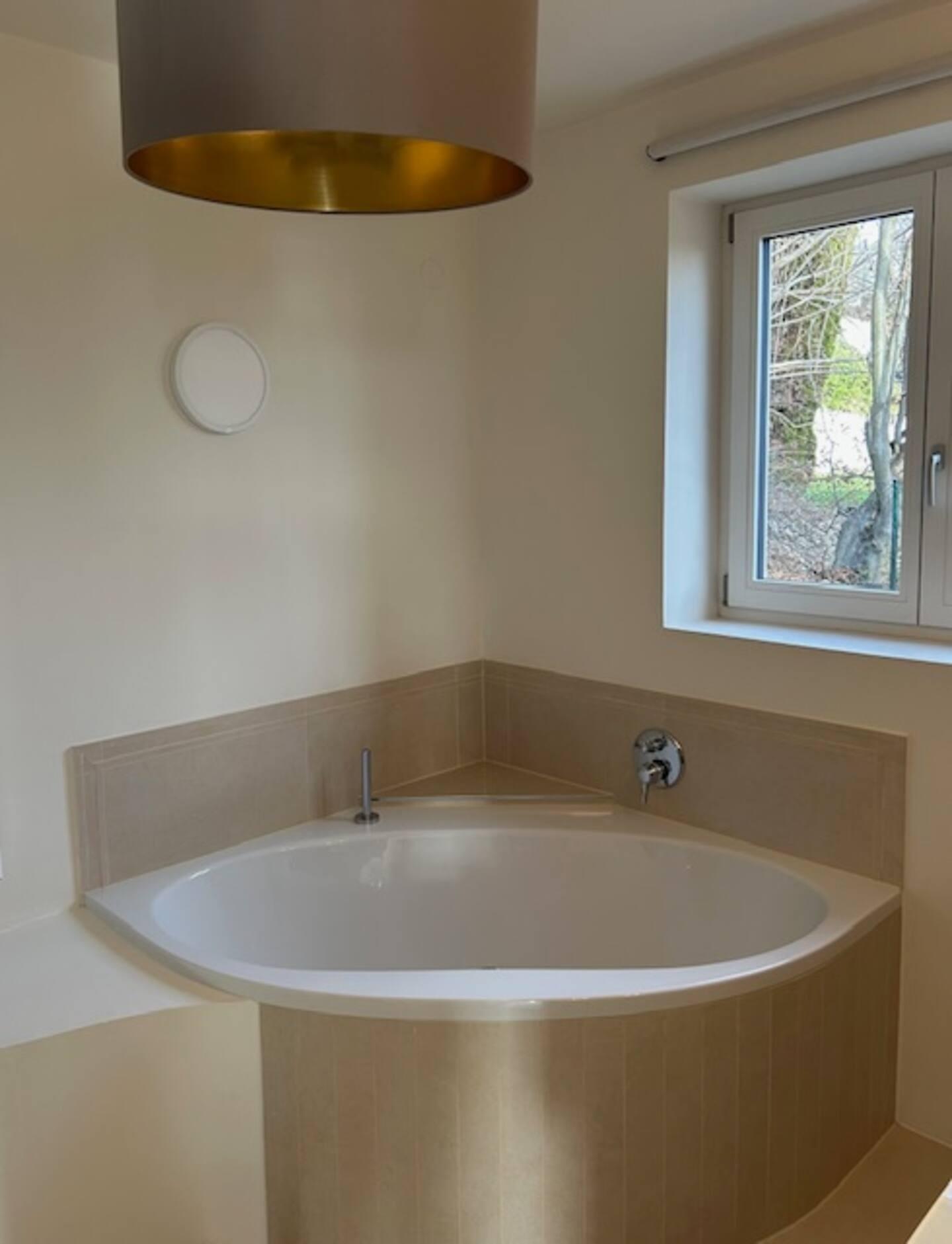 Das Bad mit seinen 2 Fenster verfügt über eine Badewanne, extra Dusche, Waschbecken und Toilette.