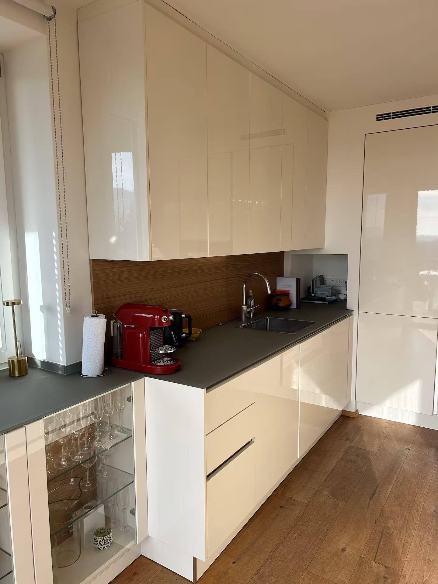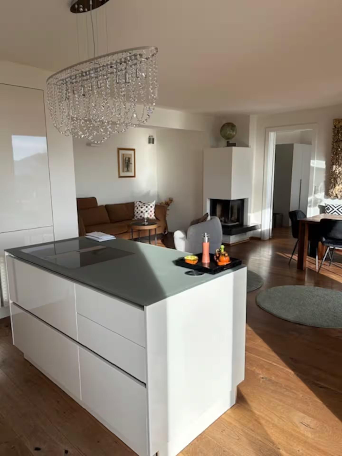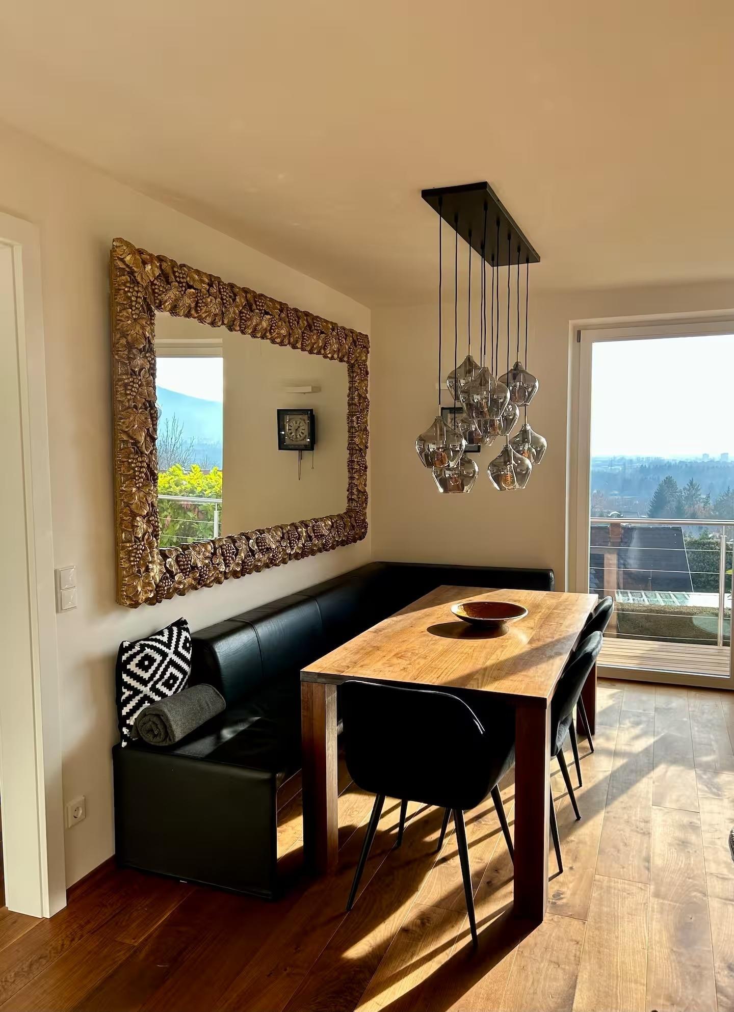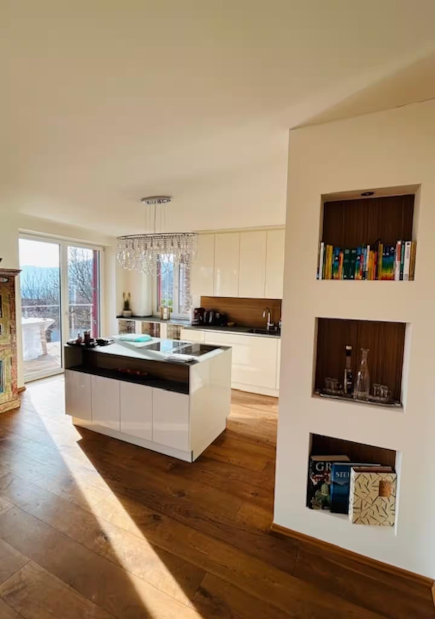 Im Eingang finden sie eine gut ausgestattete Gardeobe, weiter geht es in das gemütliche, sonnenbestrahlte Wohn- und Esszimmer mit offener und komplett ausgestatteter Küche und einer angrenzenden Terrasse -wo man mit Blick auf die Stadt und Umgebung seinen ersten Frühstückscafe oder Tee geniessen kann.