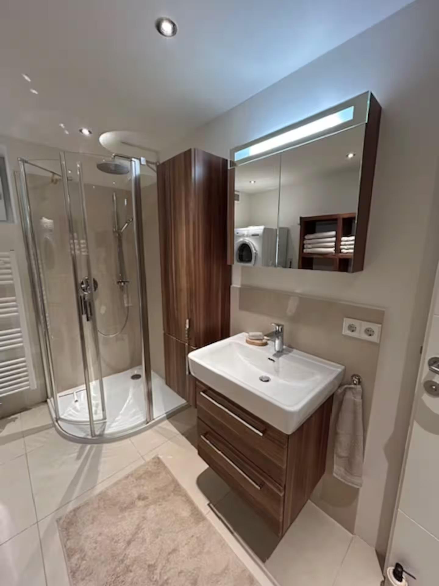 Das zweite Badezimmer angrenzend zu den Schlafzimmern hat eine Dusche, Waschbecken und eine Toilette.
