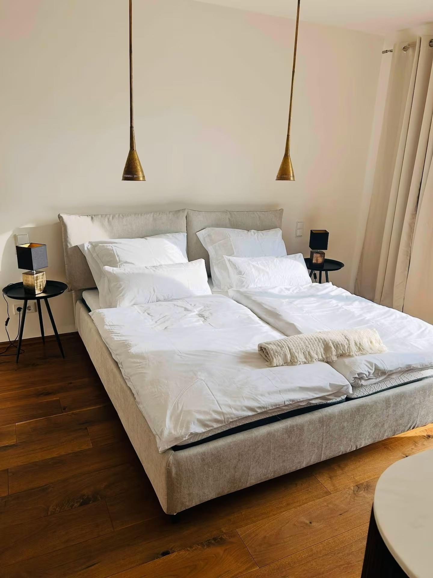 Angrenzend an das Wohnzimmer der erste Schlafbereich mit geräumigen Kleiderschrank und direktem Zugang zum Badezimmer.
