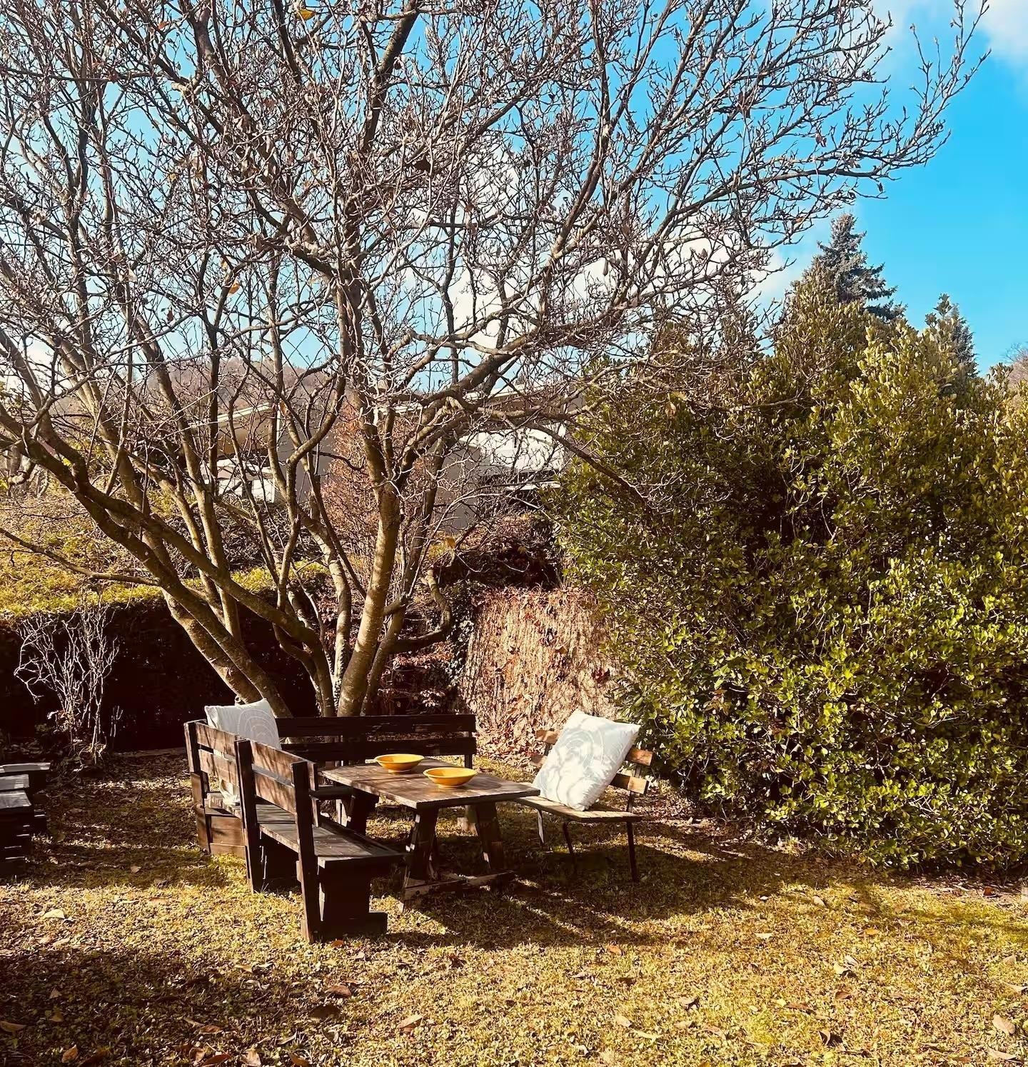 Im Garten gibt es gemütliche Ess- und Rückzugsorte.