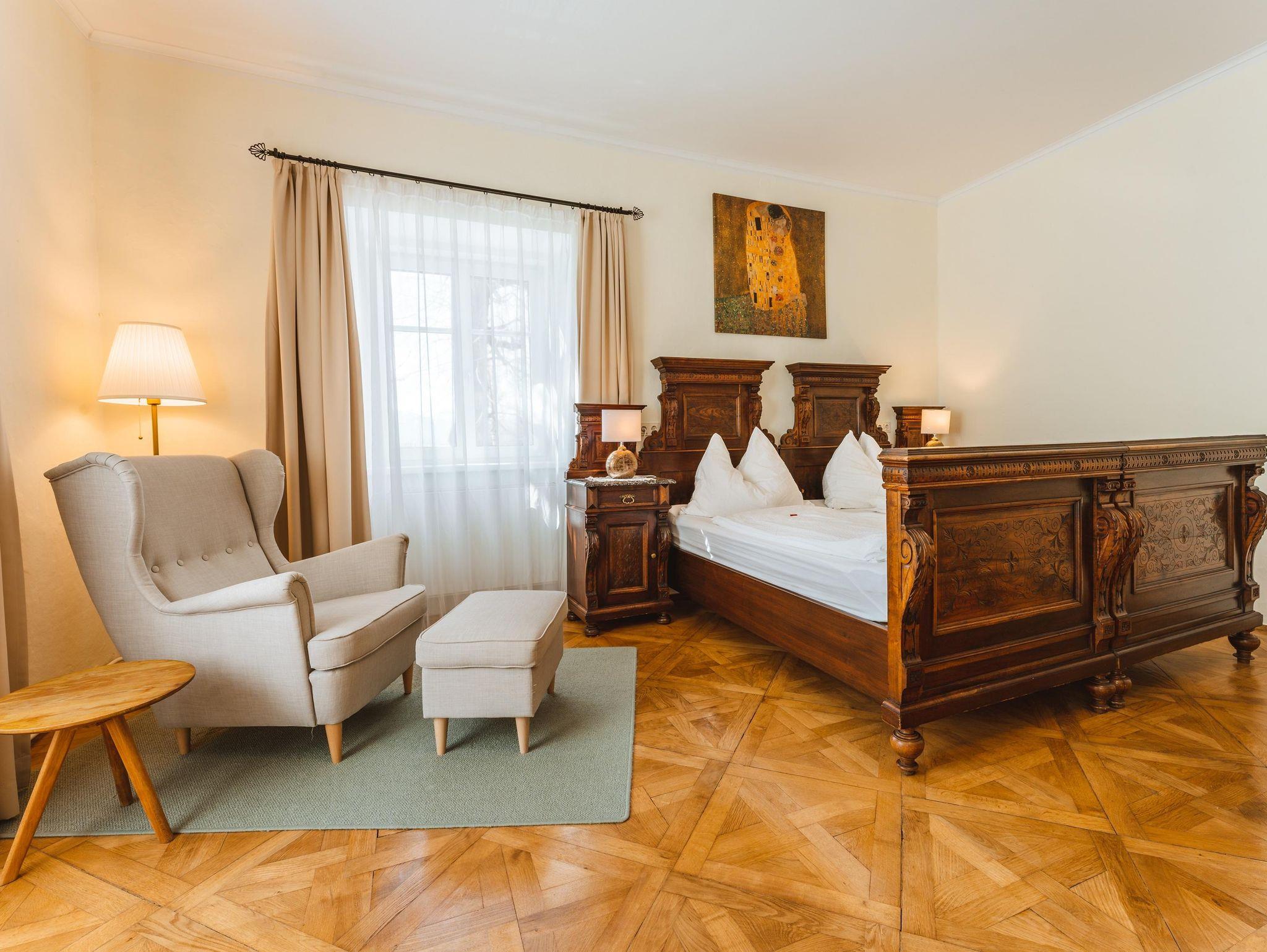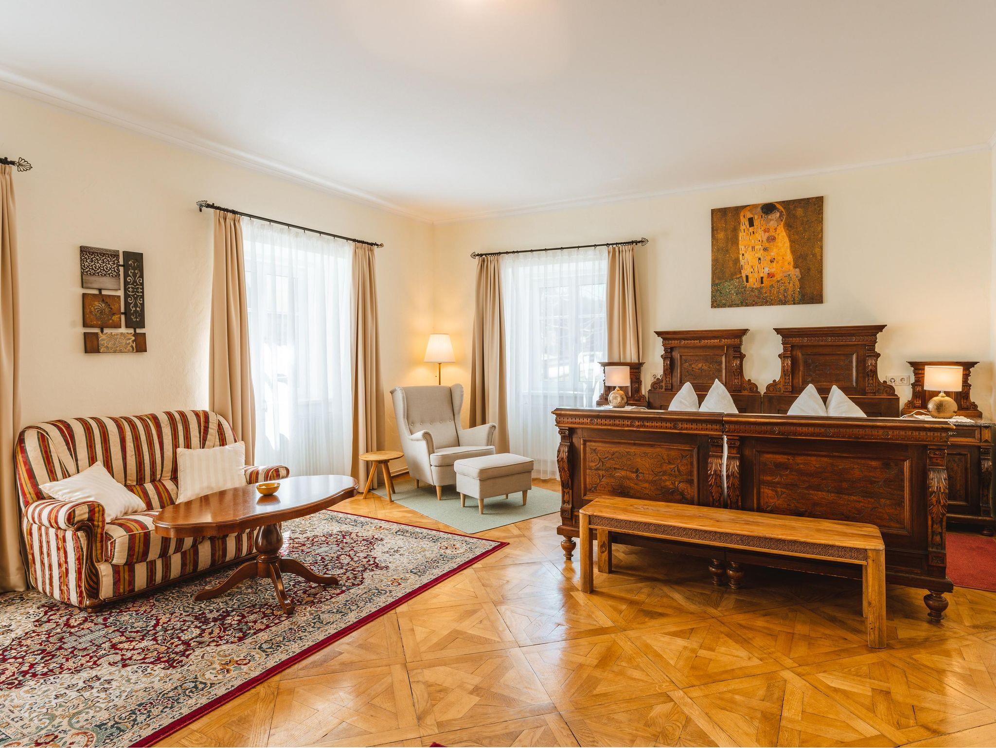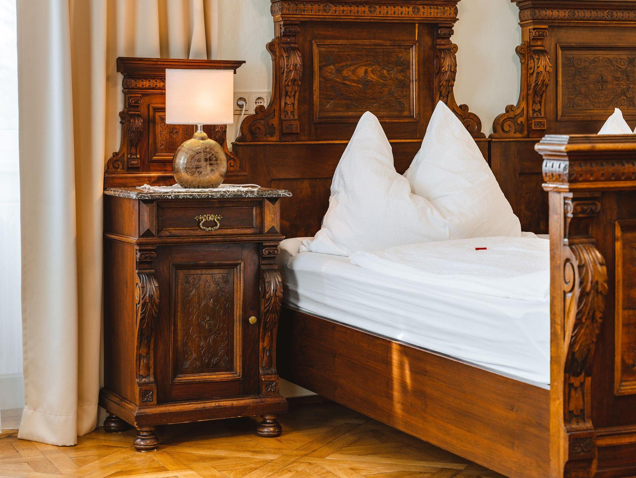 Geräumiges Zimmer im antiken Stil. Zusatzbett möglich.
