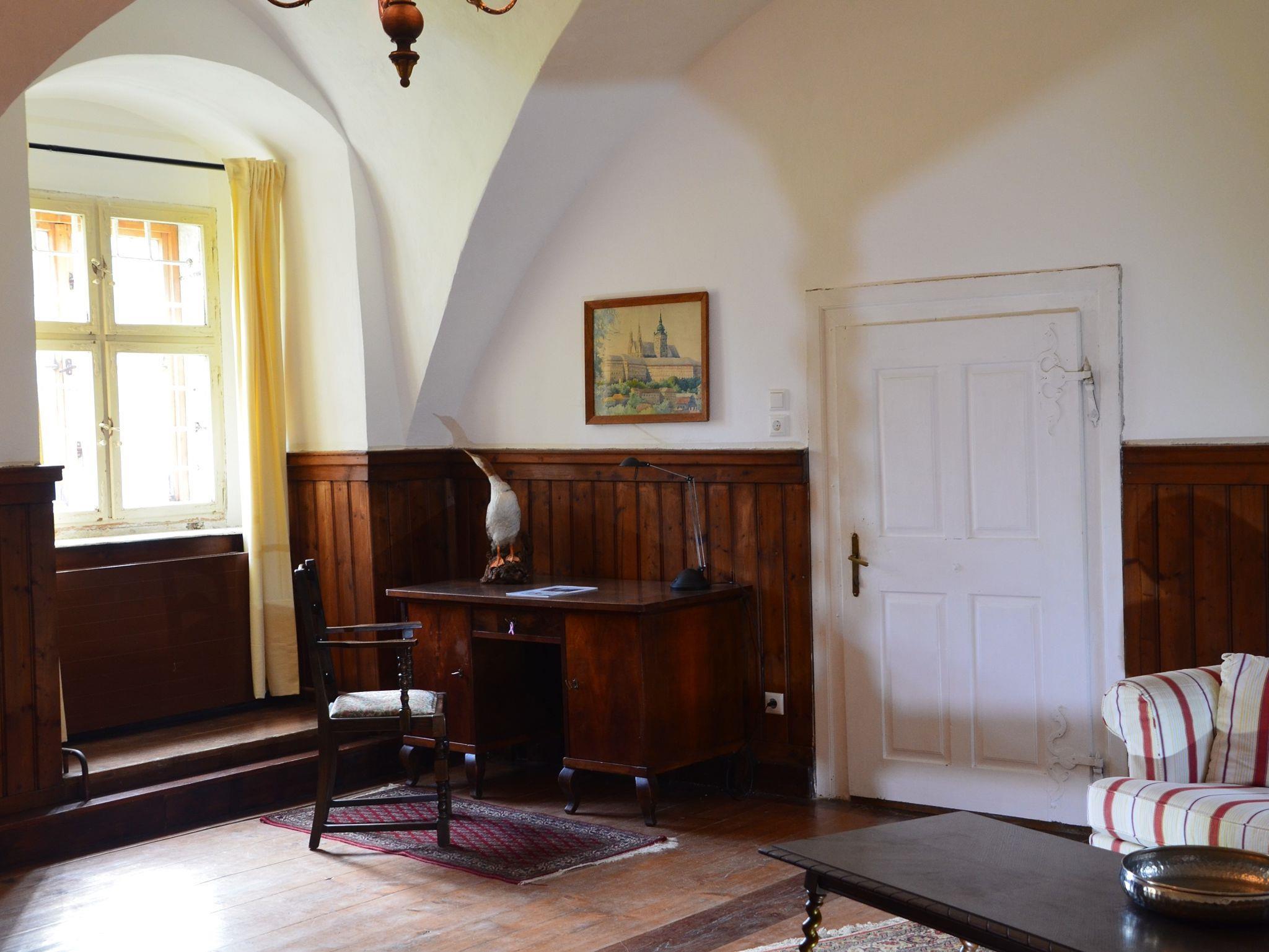 Die ehemalige Wohnung unseres Burgvogts und Richter, bietet Platz für zwei Person, ein elegantes Wohnzimmer mit Küchenzeile lädt zu erholsamen Tagen ein! Die großzügigen gewölbten Räume bieten ein gemütliches Flair. Fenster nach beiden Seiten öffnen den Blick in die Gärten und auf das Schloss.
