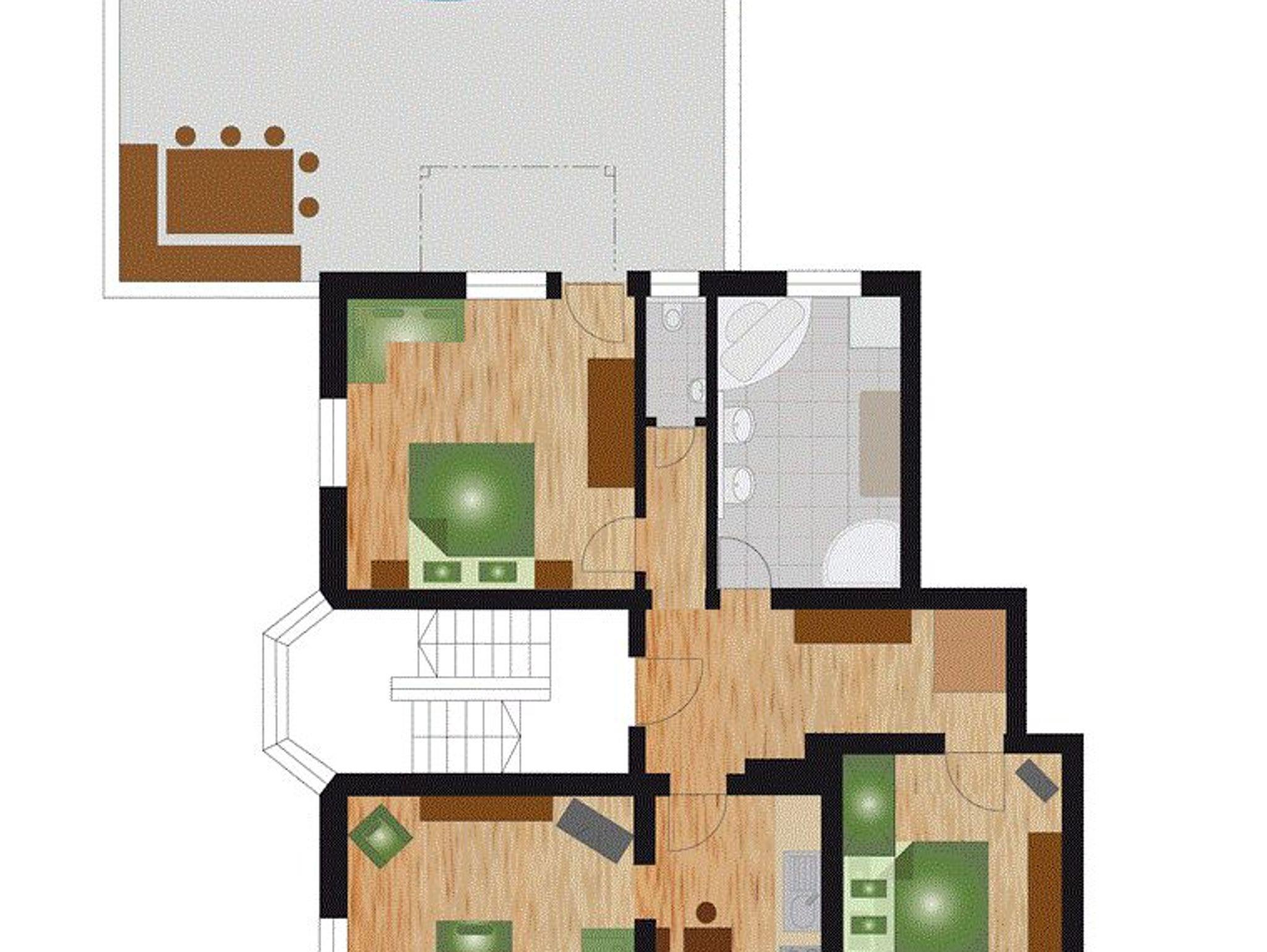 -SZ Doppel- 2 Hochbetten Balkon SAT-TV -SZ Boxspringbett Doppelschlafcouch Terrasse -Wohnküche -WZ Couchen SAT-TV Balkon -Whirlpool Dampfdusche Doppelwaschtisch Waschmaschine -Diele Infrarotkabine WC -3 WCs im Allgemeinbereich