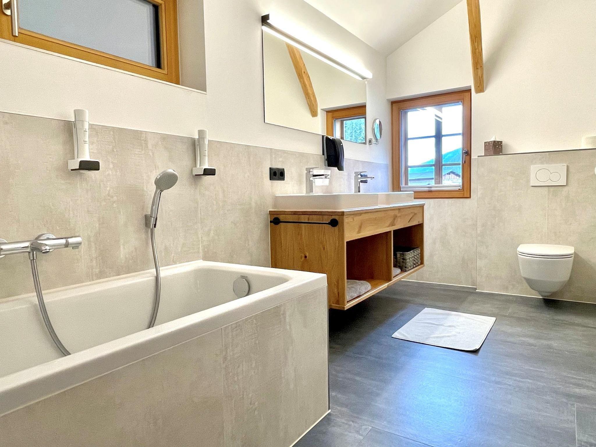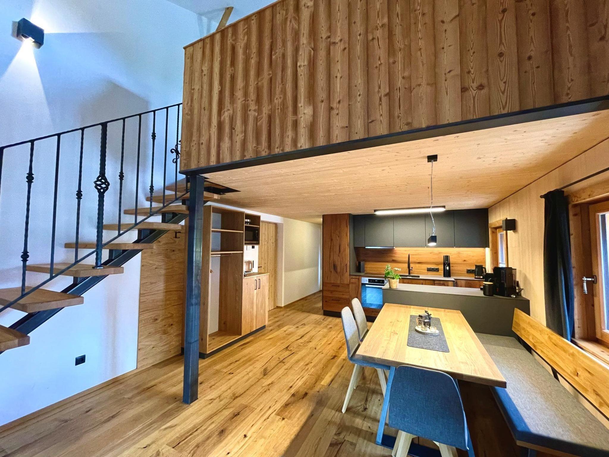 Ein drittes 75 m² großes Appartement für 4 bis 6 Personen im ersten Stock verfügt über zwei Schlafzimmer mit Boxspringbett, eine Schlafcouch, einem offenen Wohn-, Koch-und Essbereich und zwei Badezimmer mit Dusche/Badewanne und WC.