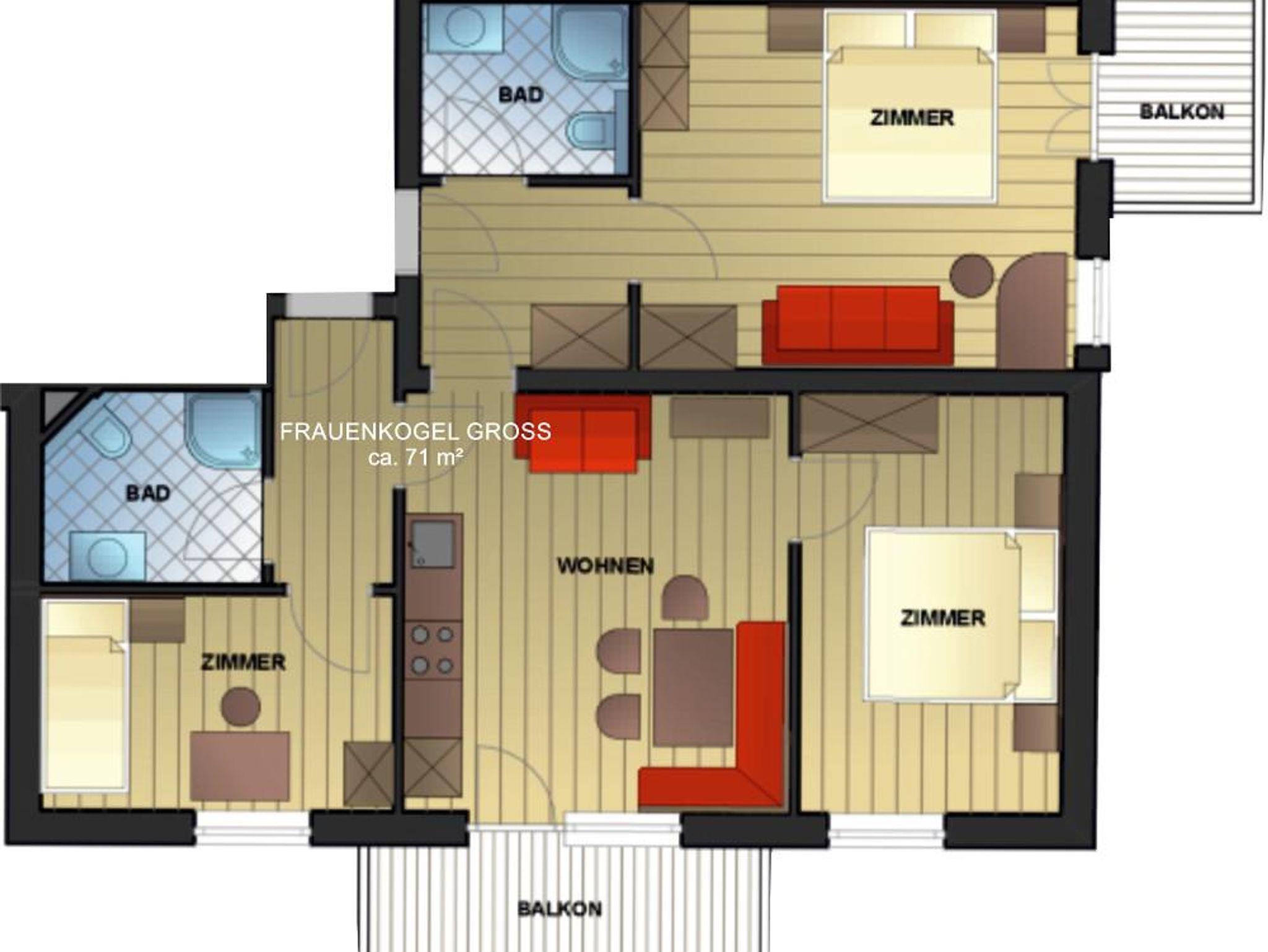 Das Appartement Frauenkogel groß bietet Platz für 5 bis 8 Personen. Es ist östlich ausgerichtet und die Einrichtung ist im alpinen Stil.