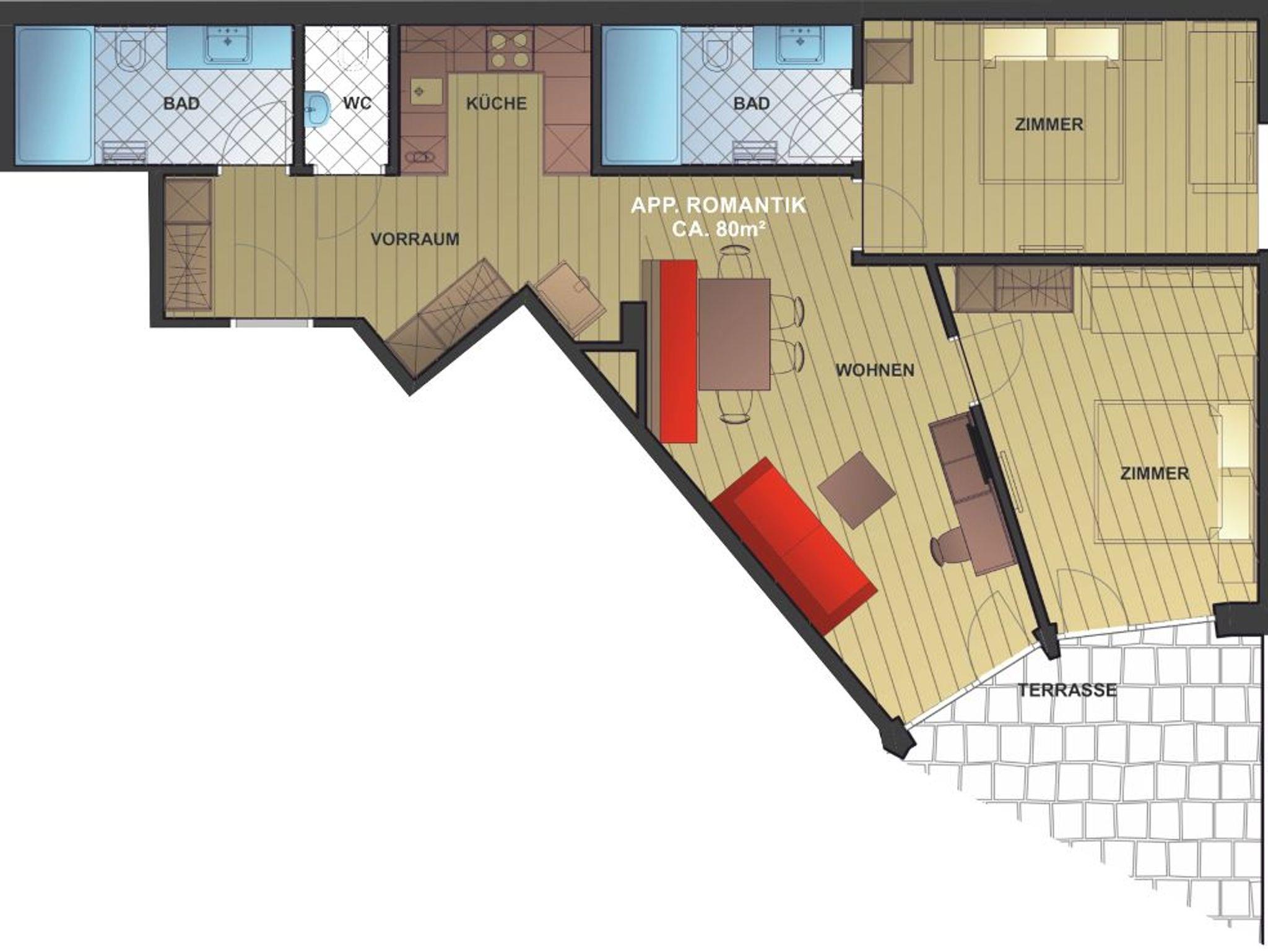 Das Appartement Romantik ist ca. 80 m2 groß. Hier finden 4 bis 8 Leute ausreichend Platz. 2 getrennte Schlafzimmer, 2 getrennte Sanitäreinrichtungen und 1 zusätzliches Bad sorgen für noch mehr Komfort. Die große Terrasse lädt zum Verweilen ein.