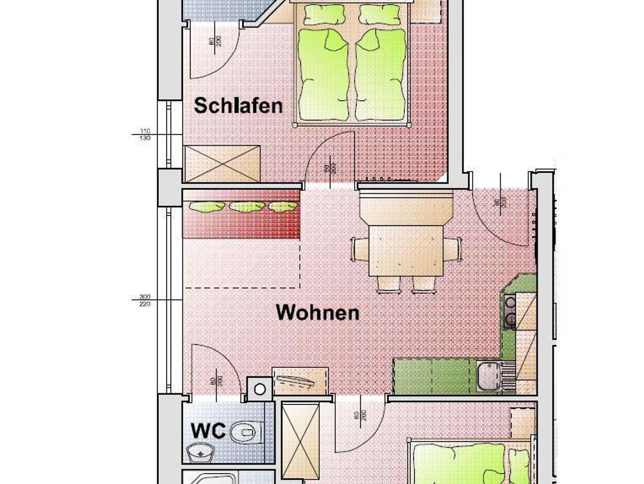 ca. 50 m² grosses Appartement im Dachgeschoss mit 2 Schlafzimmer (Doppelbetten), 2 Badezimmer und ein extra WC. Südseitiger Balkon und grosse westseitige Terrasse; Doppelcouch im Wohnzimmer; für bis zu 6 Personen. Bei 2 Personen steht Ihnen 1 Schlafzimmer pro Ferienwohnung zur Verfügung.