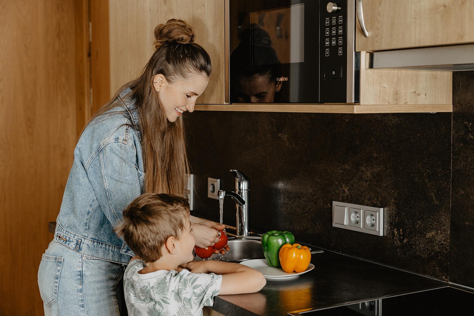 -Komplettausstattung der Küche (Backrohr, E-Herd mit Cerankochfeld, Geschirrspüler, Wasserkocher, Kaffeemaschine, Kühlschrank mit Gefrierfach)