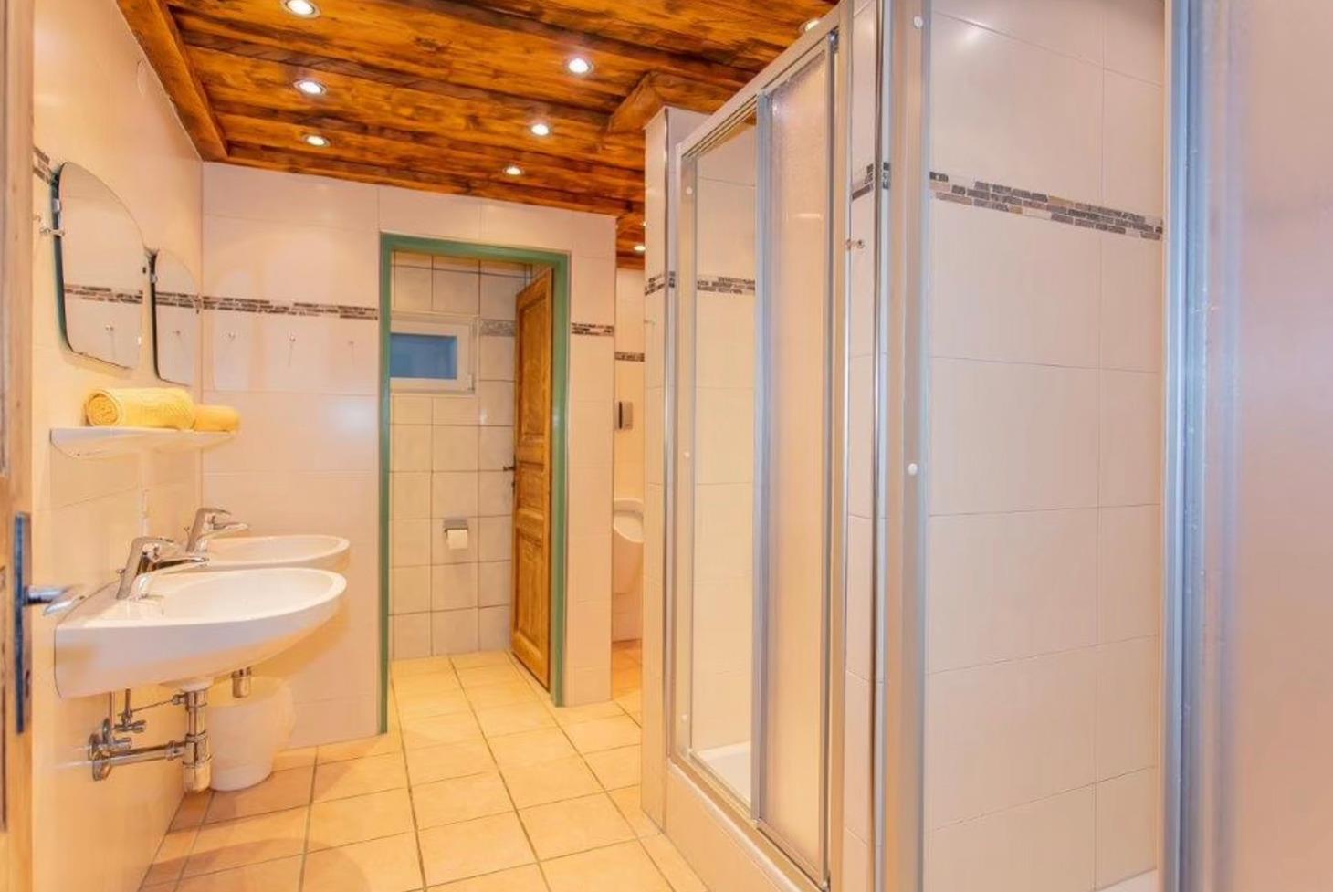 1 Badezimmer mit 2 Duschen, Doppelwaschbecken, und Toilette