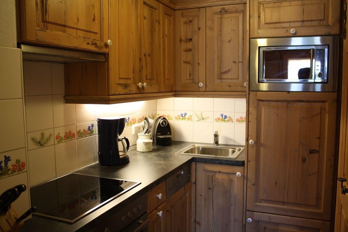 Voll ausgestattete Küche mit E-Herd, Backofen, Holzherd, Kühlschrank mit Gefrierfach, Geschirrspüler, Kaffeemaschine, Toaster und Wasserkocher