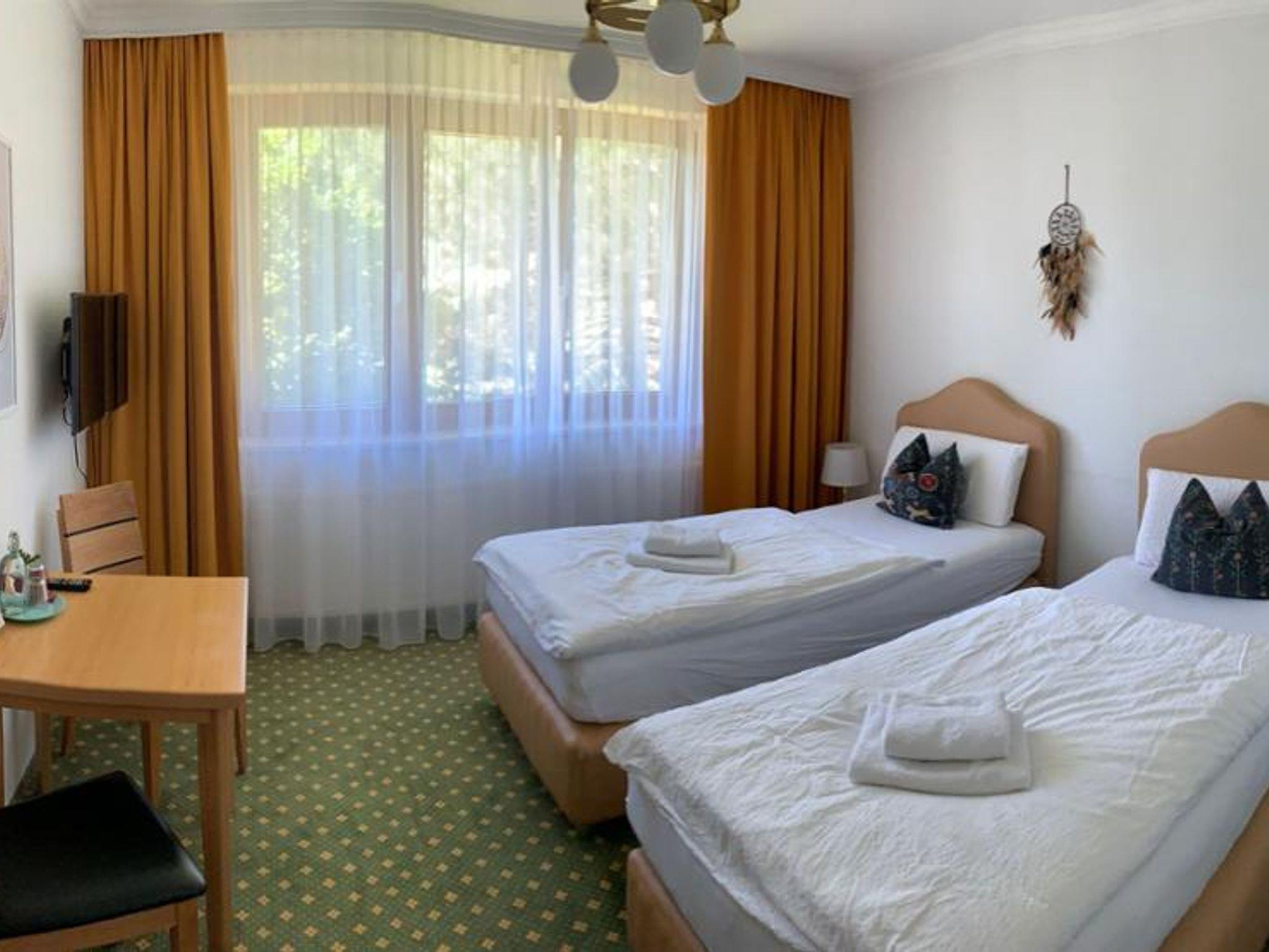 Das Doppelzimmer (19qm) verfügt über ein hochwertiges Boxspringbetten mit (eher weicher) Matratze. Auf dem Balkon stehen 1 Tisch 2 Stühle mit Polster zum Verweilen bereit. Die Betten können teils auseinander gestellt werden zu separaten Einzelbetten. Extra Badezimmer mit Dusche und WC, Sat-TV und WLAN. Inklusive 1 Flasche Quellwasser bei Ankunft.