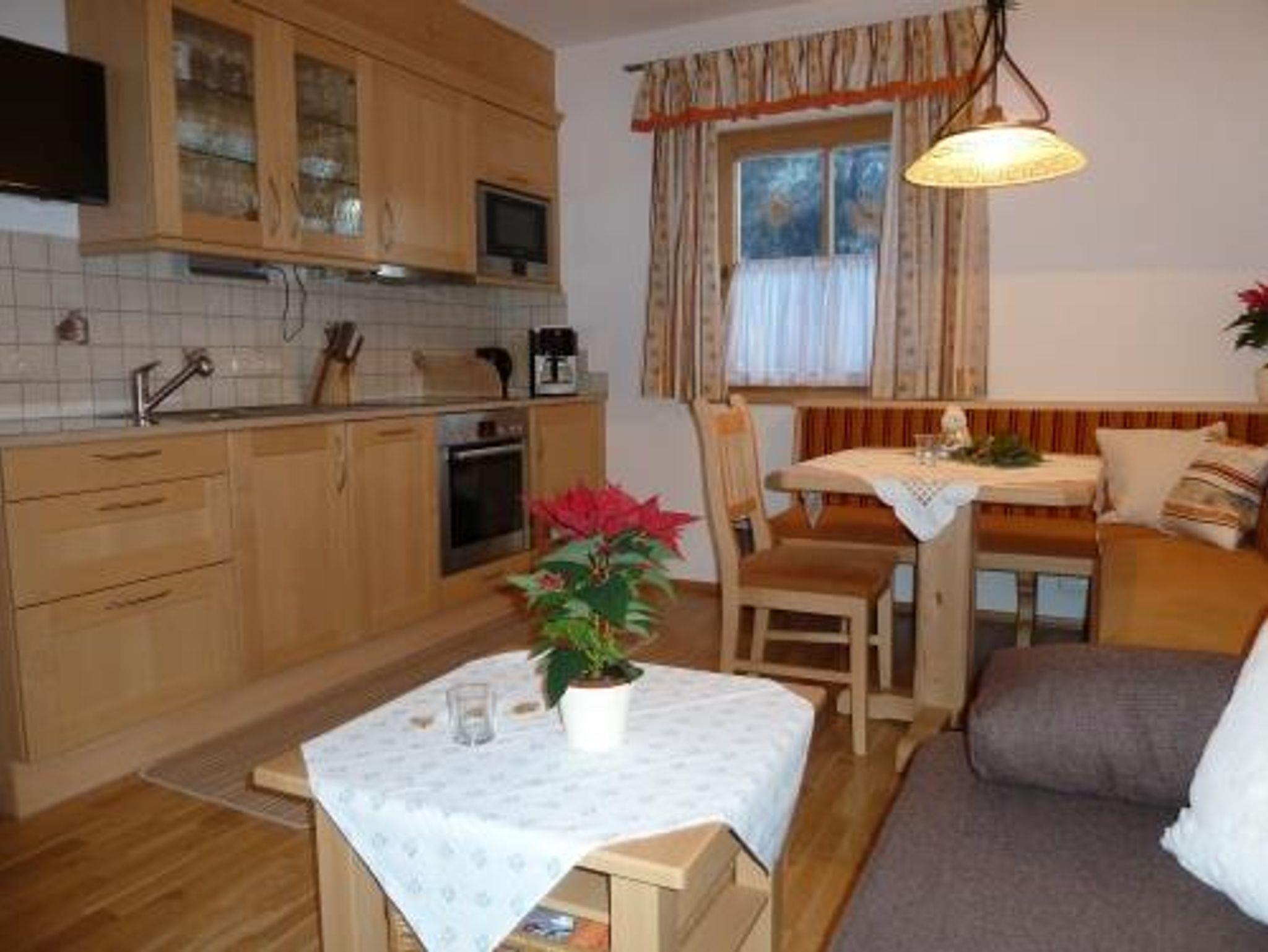 für Allergiker geeignet, Parkettböden, Fußbodenheizung, helle Möbel und Vorhänge, komplett ausgestatte Küche, 1 Schlafzimmer für 2-3 Personen, gemütlicher Wohnraum mit ausziehbarer Doppelcouch. Ausgang in den Garten, direkter Blick auf die Hüttschlager Kletterwand und das Tal, Platz für Gitter- oder Kinderbett. Vorraum und im Ergedschoß Garderobenschrank mit Abteilungen für Wander- bzw. Schibekleidung und Schuhtrockner.