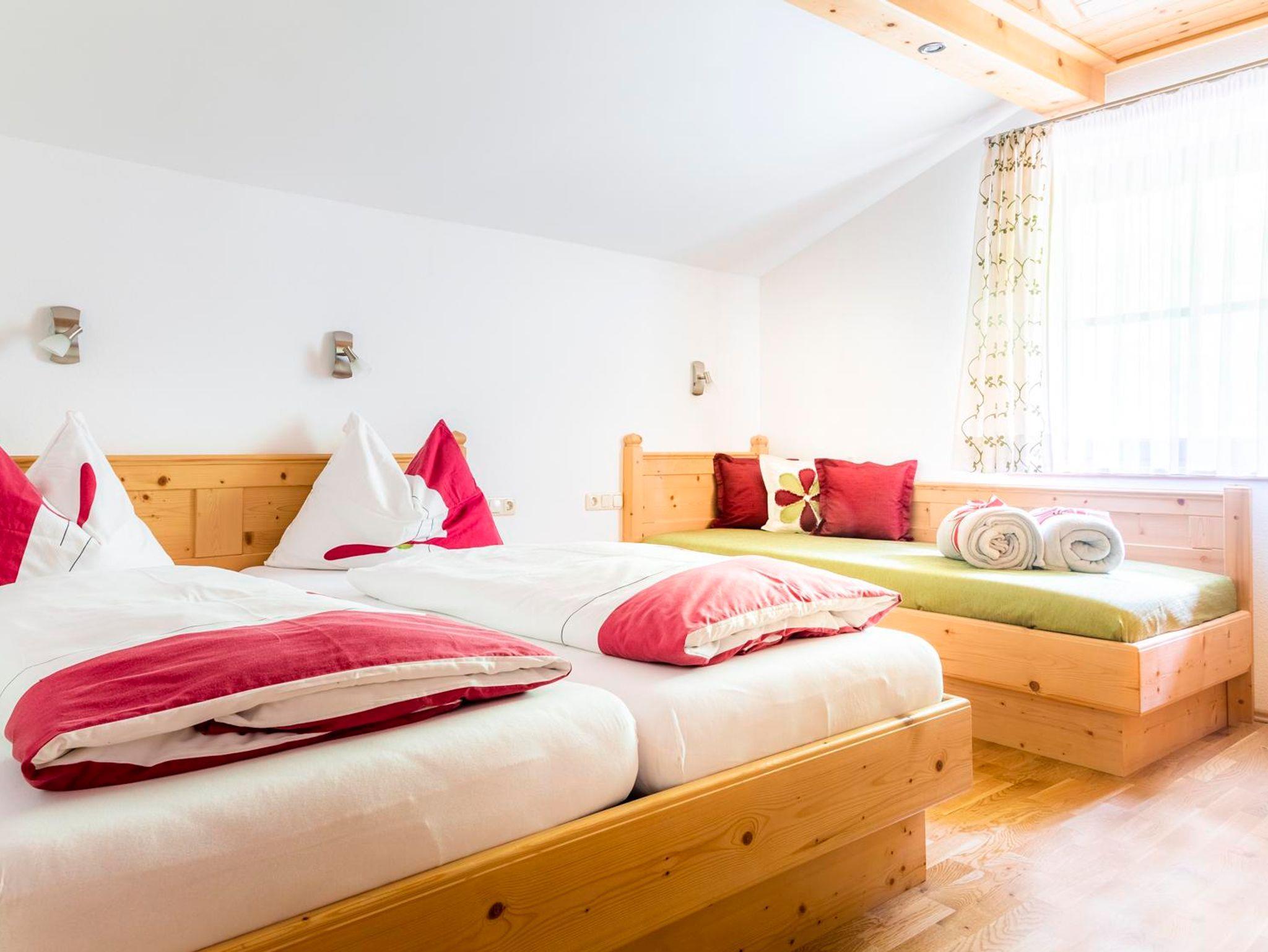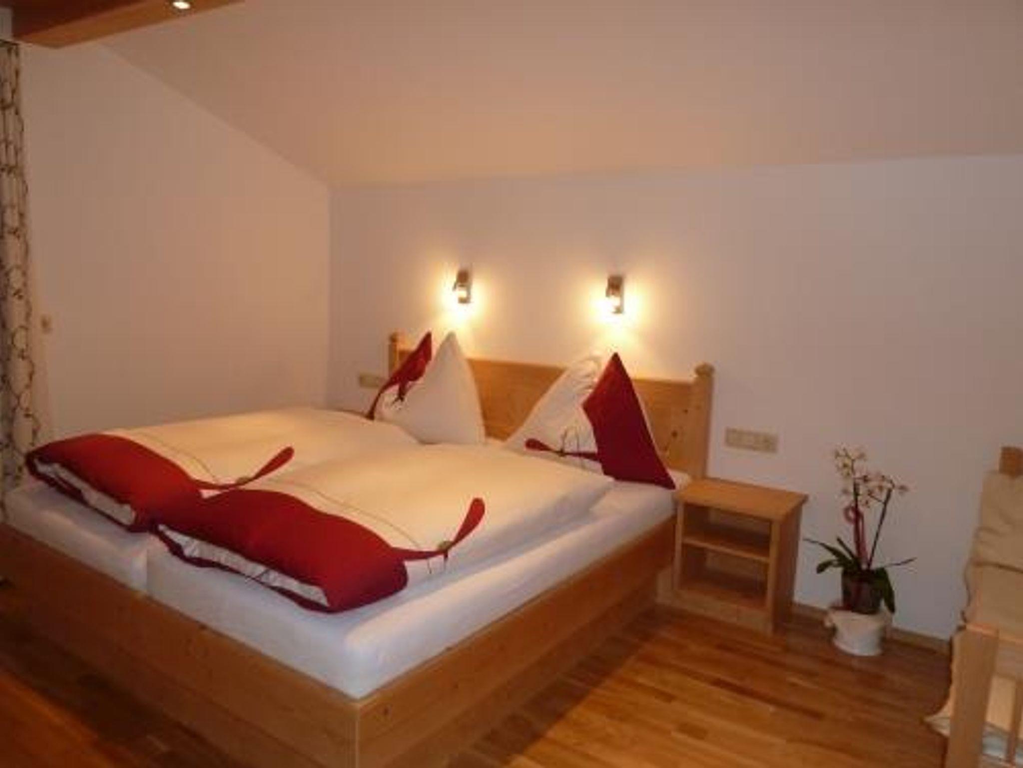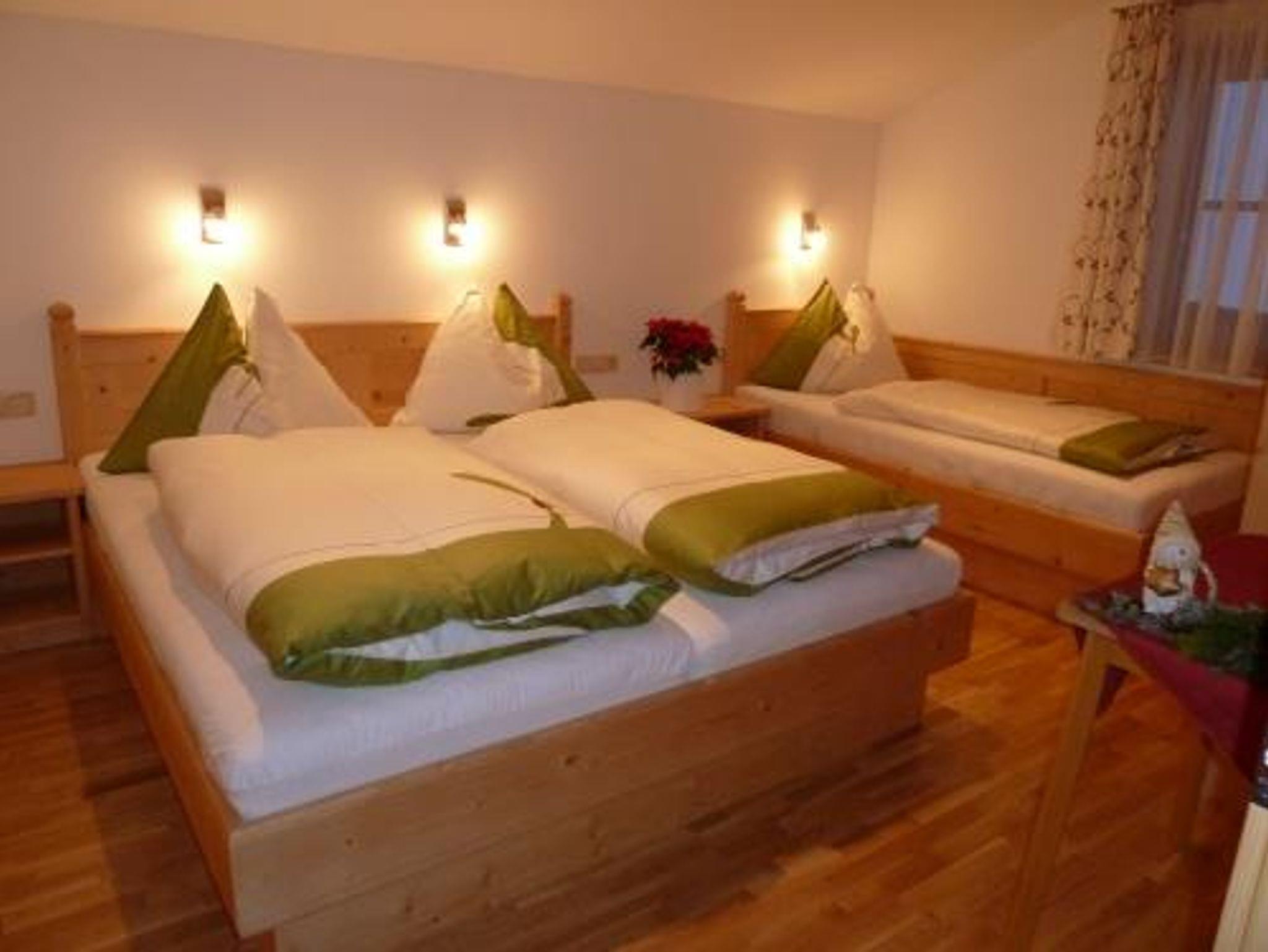 für Allergiker geeignet, Parkettböden, Fußbodenheizung, helles Mobilar, komplett ausgestattete Wohnküche mit SAT-TV, 1 Doppelzimmer und 1 Dreibettzimmer jeweils mit Dusche/WC und SAT-TV, Balkon mit Tal- und Bergblick, GRATIS W-Lan, Platz für Gitter- oder Kinderbett. Vorraum und im Ergedschoß Garderobenschrank mit Abteilungen für Wander- bzw. Schibekleidung und Schuhtrockner.