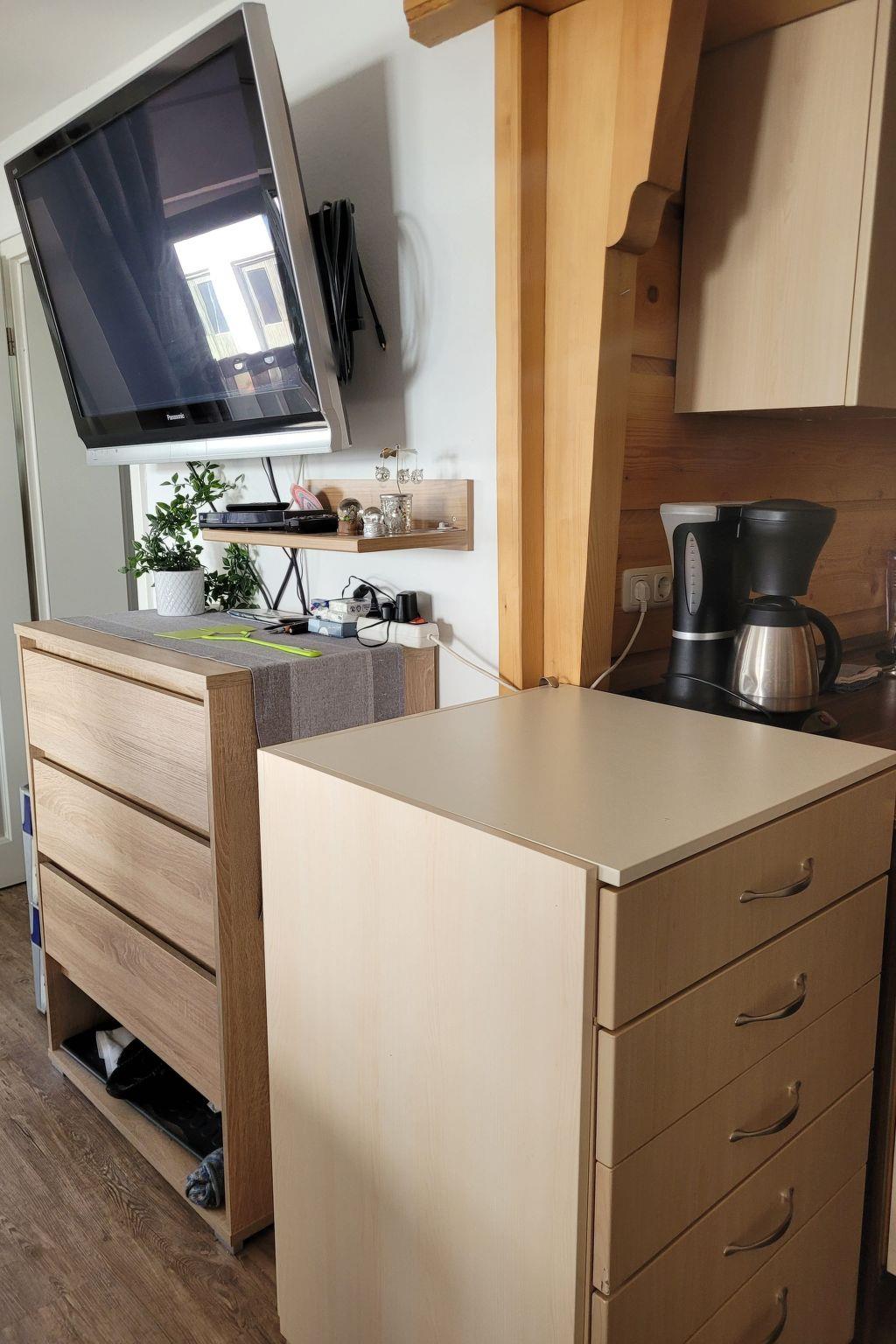 The interior of the holiday flat is functional and inviting. In the bedroom you will find a comfortable double bed as well as a bunk bed, which is accessible via a steep staircase, which will certainly appeal to little adventurers. A sofa bed in the living area provides additional sleeping accommodation. The shared facilities, such as a washing machine, provide additional comfort during your stay. A filter coffee machine is available for coffee lovers, and the dishwasher and kettle make everyday kitchen life easier.