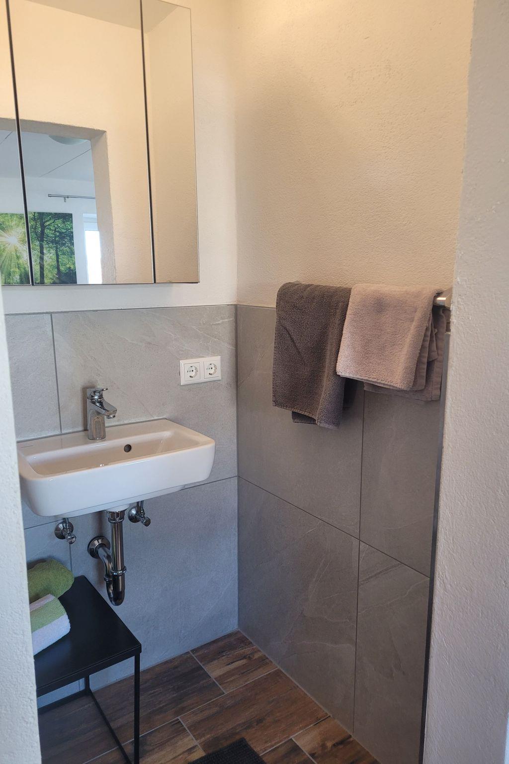Inside, you will find a well-thought-out layout with three bedrooms, each with its own shower and washbasin, so that privacy and comfort are paramount. A fully equipped eat-in kitchen with ceramic hob, dishwasher, filter coffee machine and kettle offers everything you need to prepare delicious meals. There is also a washing machine and tumble dryer for communal use in the building, ensuring a carefree stay.