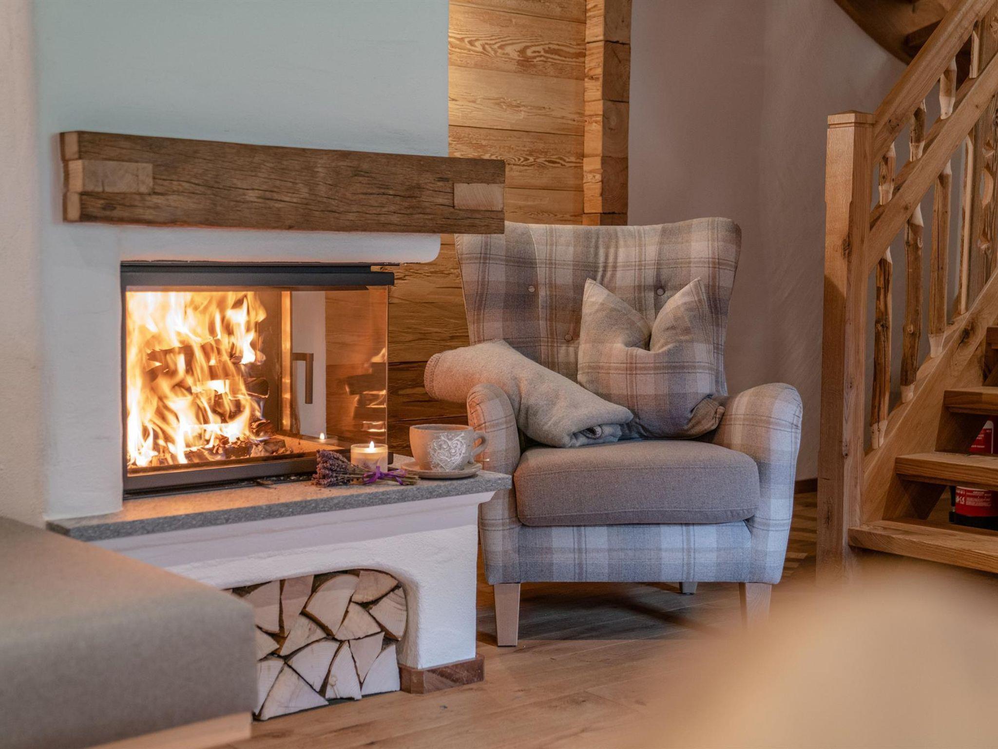 - Gemütlicher Wohnraum mit einem großen Kachelofen, moderne Sitzmöbel zum Lesen, in die Berge schauen und entspannen.