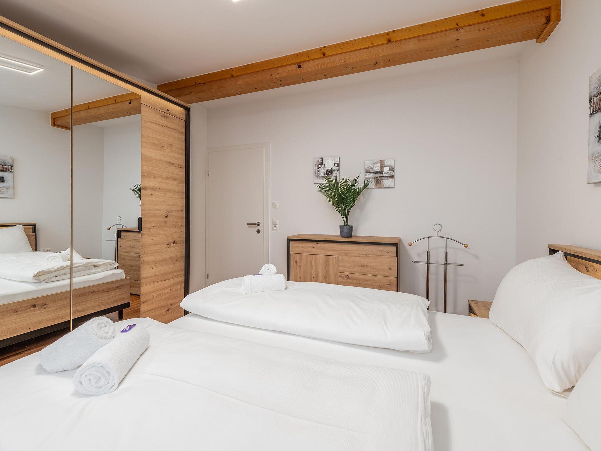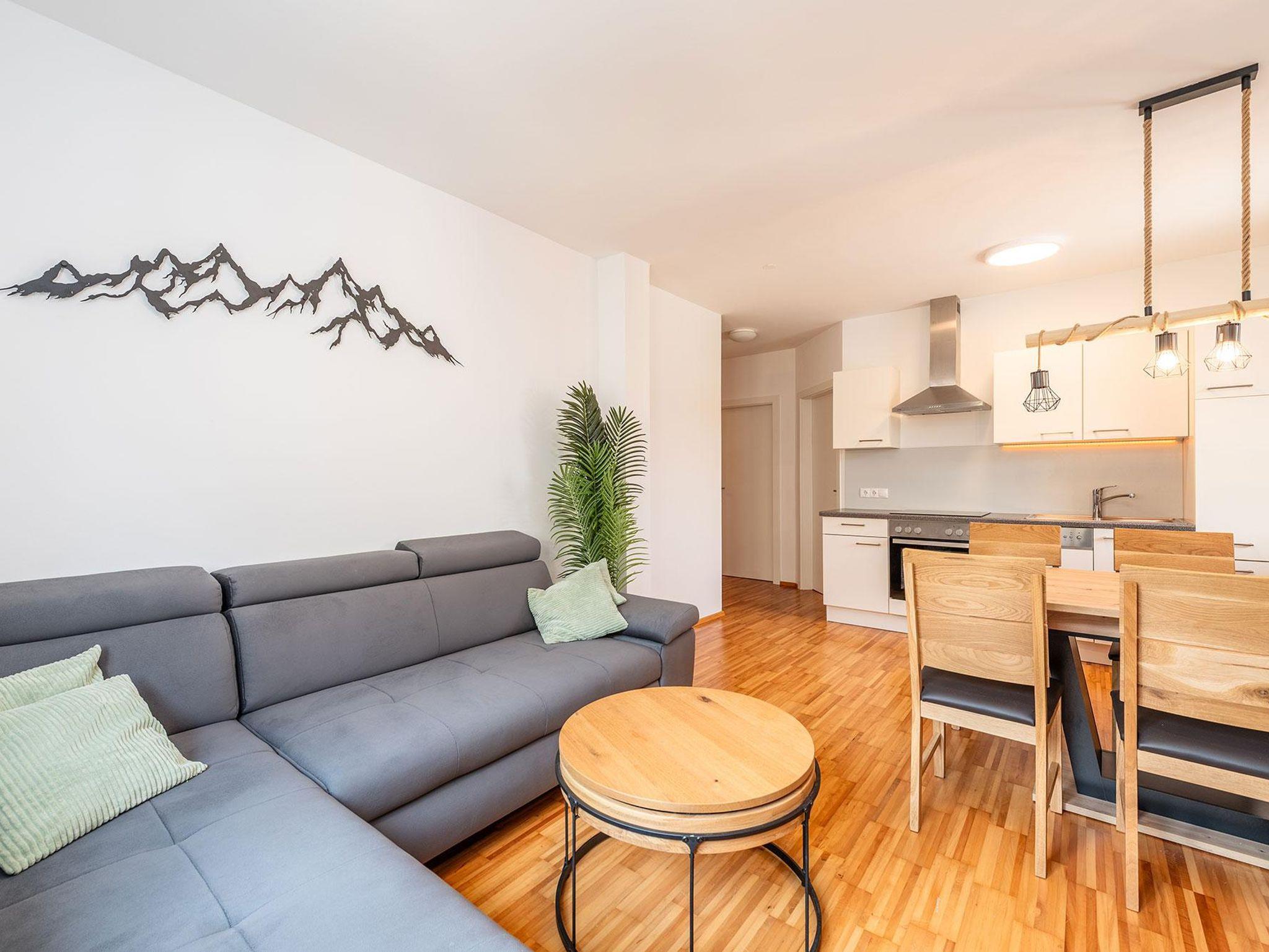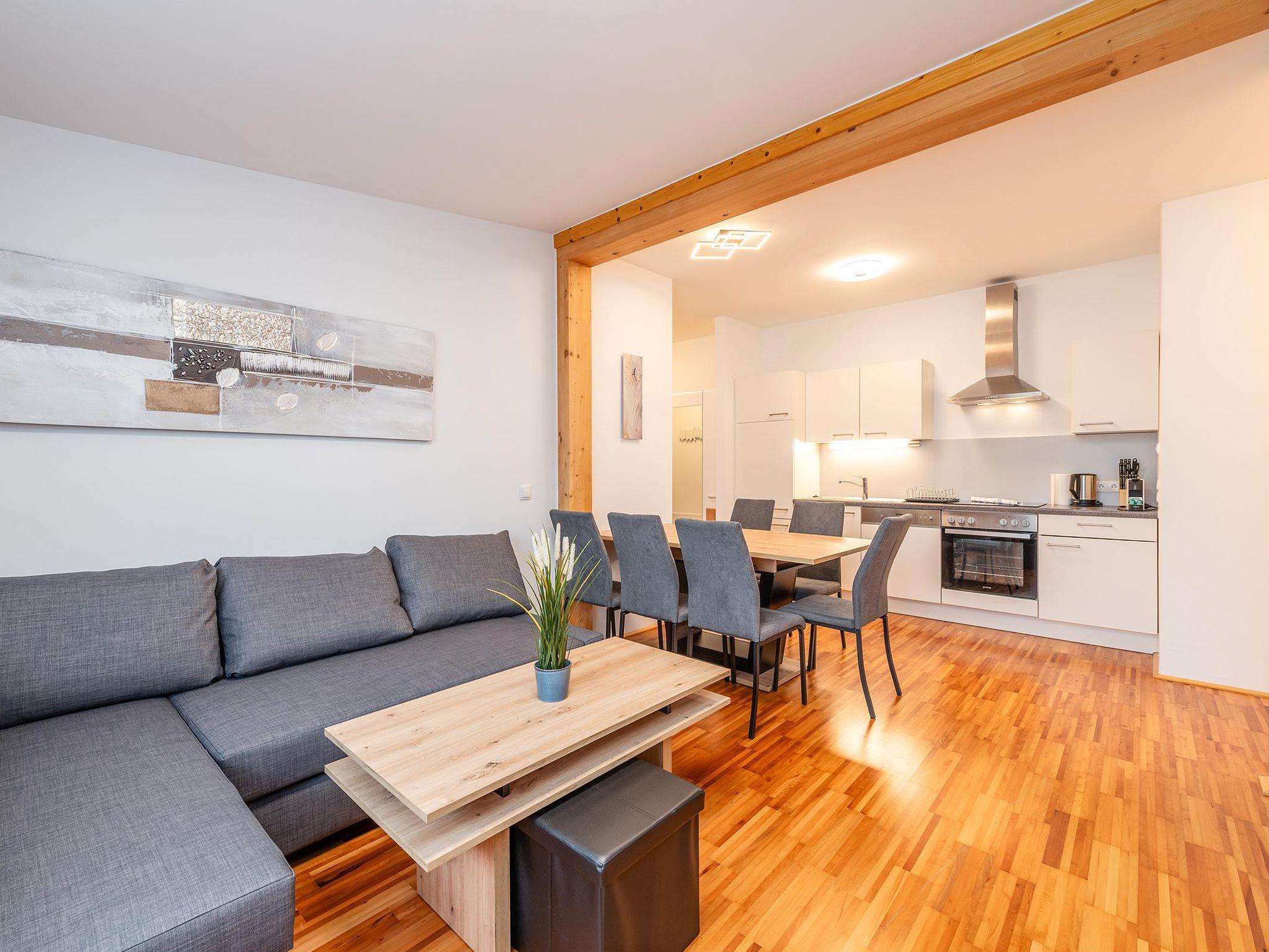 2 Schlafzimmer mit je einem Doppelbett sowie eine Schlafcouch für 2 weitere Personen im Wohnzimmer bieten insgesamt Platz für 6 Personen. Die voll ausgestattete Küche lädt zum gemeinsamen Kochen ein. Ein modernes Badezimmer mit Dusche sowie ein separates WC sorgen für zusätzlichen Komfort. Kostenfreie Parkmöglichkeiten stehen direkt beim Apartment zur Verfügung.