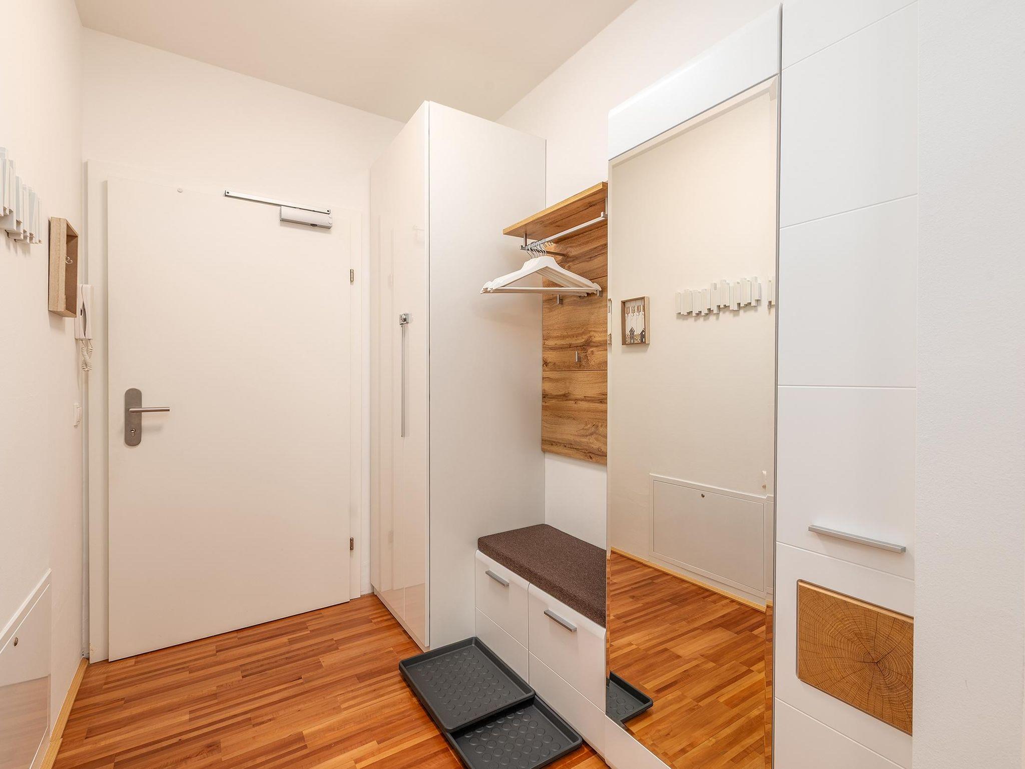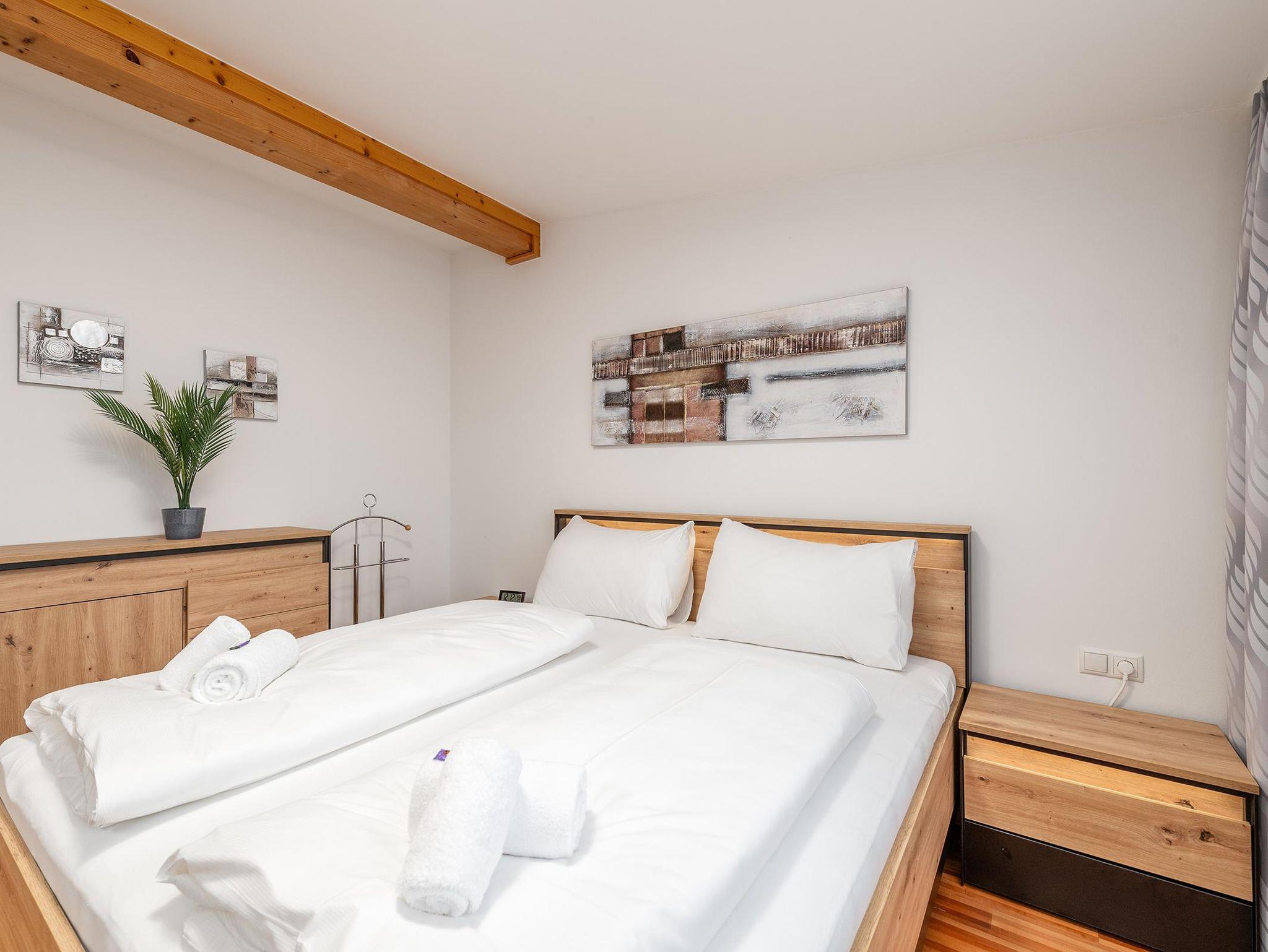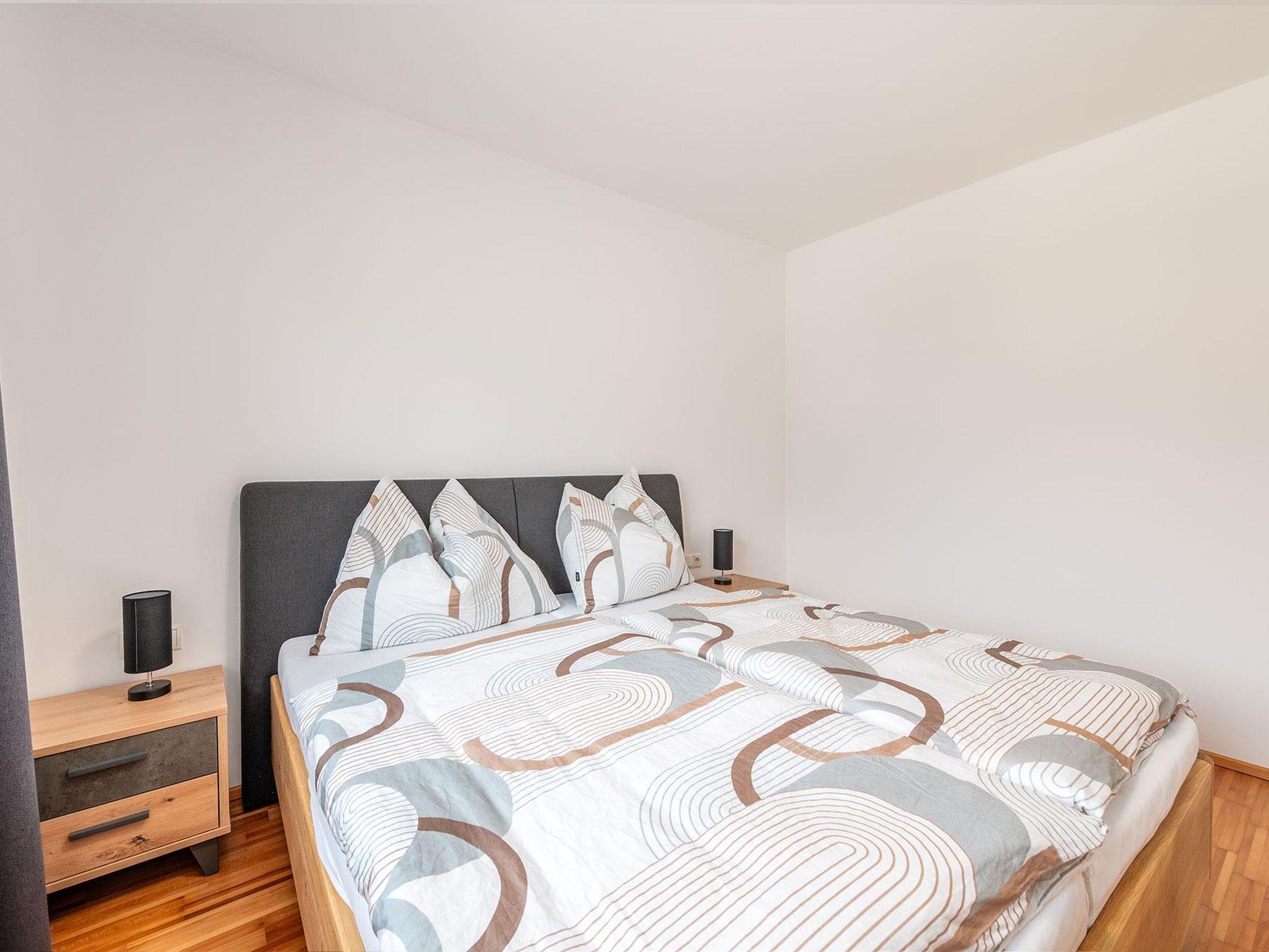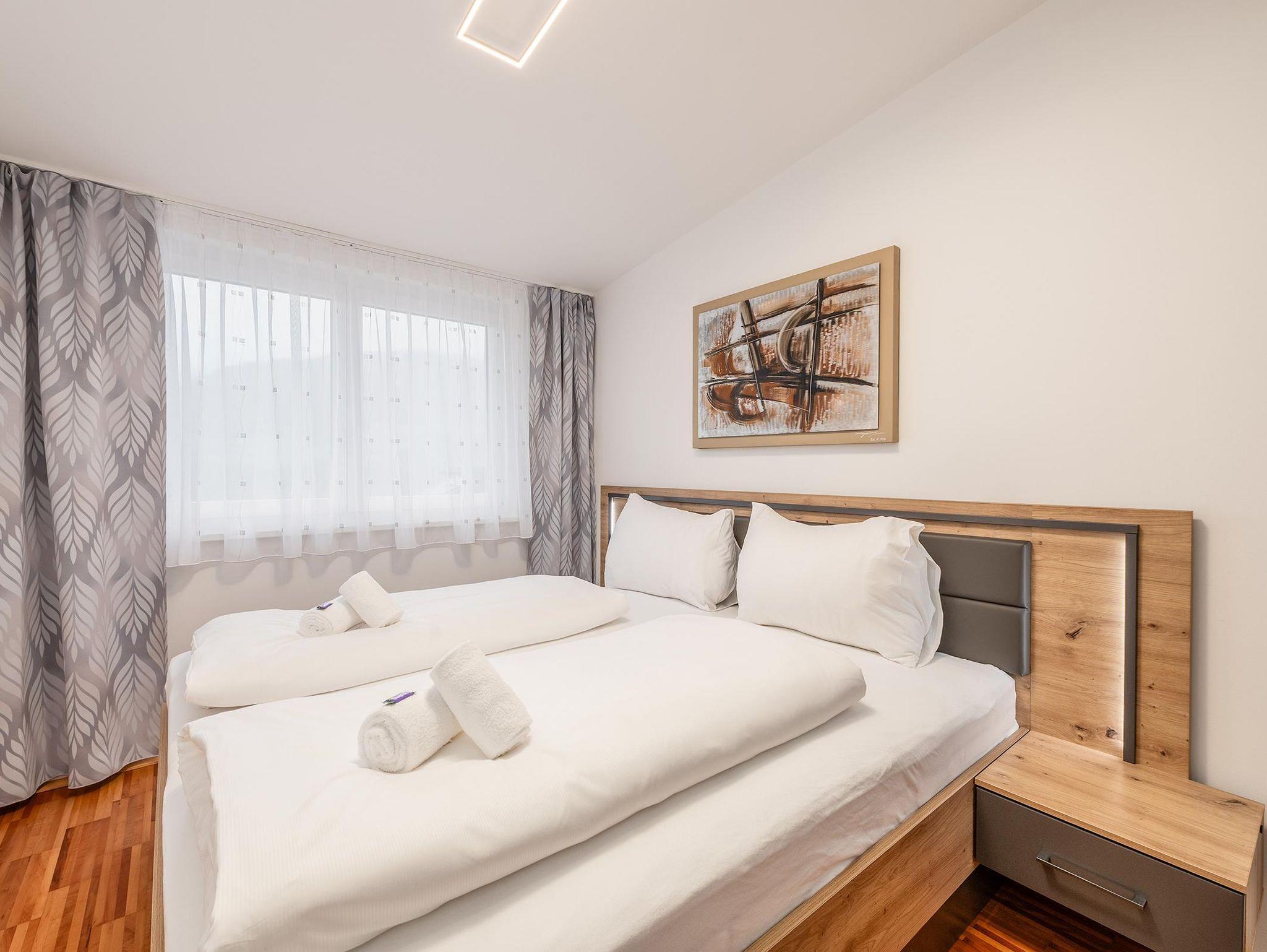 2 Schlafzimmer mit je einem Doppelbett sowie eine Schlafcouch für 2 weitere Personen im Wohnzimmer bieten insgesamt Platz für 6 Personen. Die voll ausgestattete Küche lädt zum gemeinsamen Kochen ein. Ein modernes Badezimmer mit Dusche sowie ein separates WC sorgen für zusätzlichen Komfort. Kostenfreie Parkmöglichkeiten stehen direkt beim Apartment zur Verfügung.
