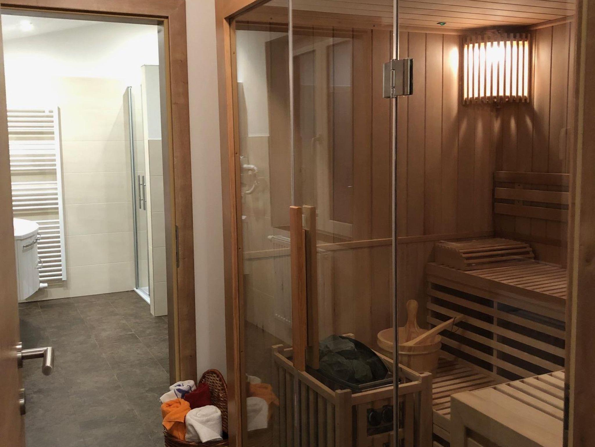 Die zweite Ferienwohnung bietet Platz für 4 bis 6 Personen. Sie verfügt über 2 getrennte Schlafzimmer, (1 Doppelzimmer, 1 Dreibettzimmer - drittes Bett 140cm breit) wobei auch hier jedes Zimmer über ein eigenes Bad verfügt. Eine gemütliche und voll ausgestattete Küche lässt keine Wünsche offen. Als Highlight gibt es auch eine eigene Sauna.