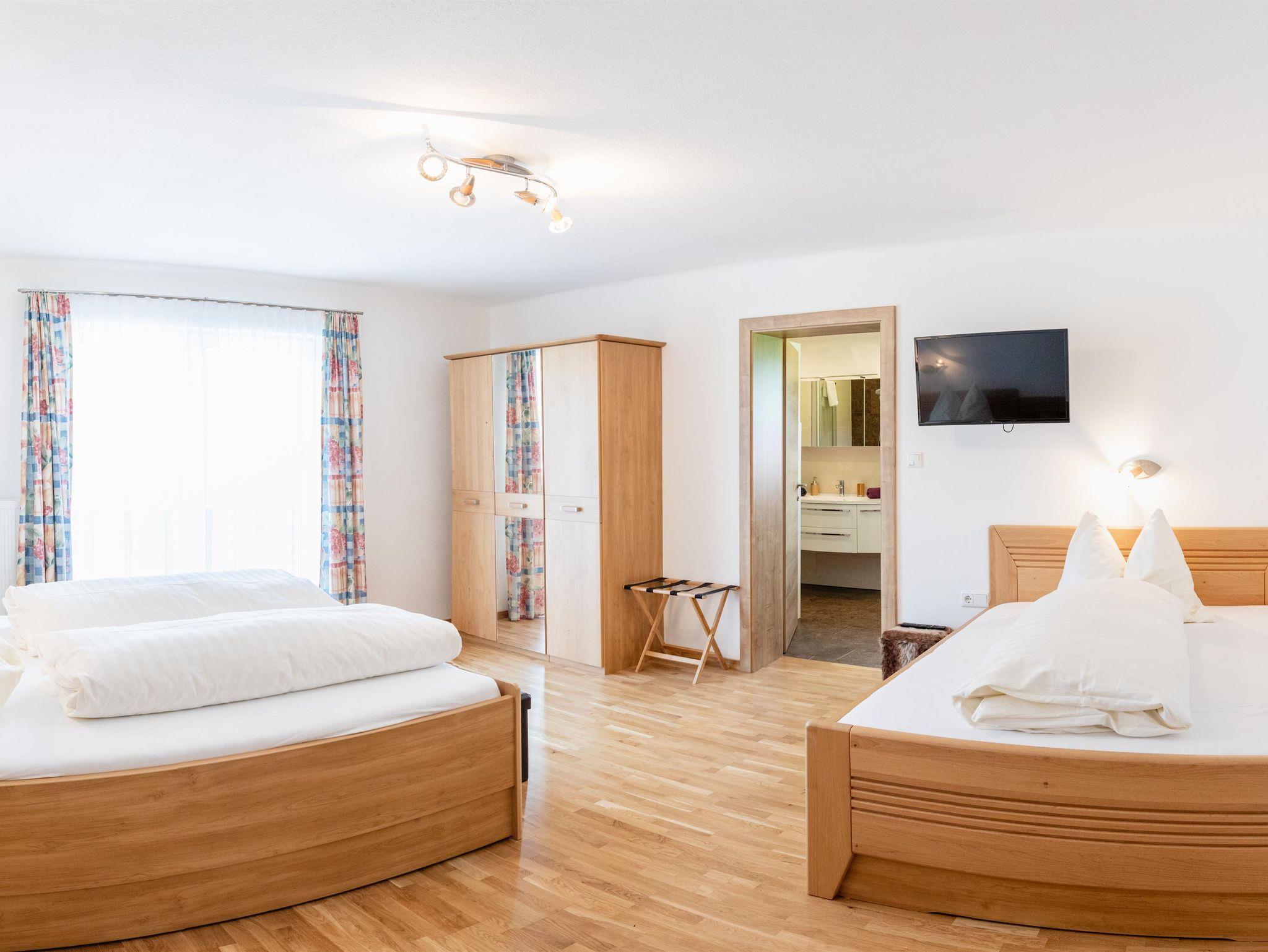 Appartement mit 1 Doppelzimmer und 1 Dreibettzimmer (mit Doppelbett und 1,40 m Bett). Jedes Zimmer verfügt über ein eigenes Bad mit Dusche/WC. Die gemeinsame Sauna ist von beiden Zimmer zugänglich. Für das gemütliche Zusammensein eignet sich die Küche mit Sitzecke. Gratis W-Lan.