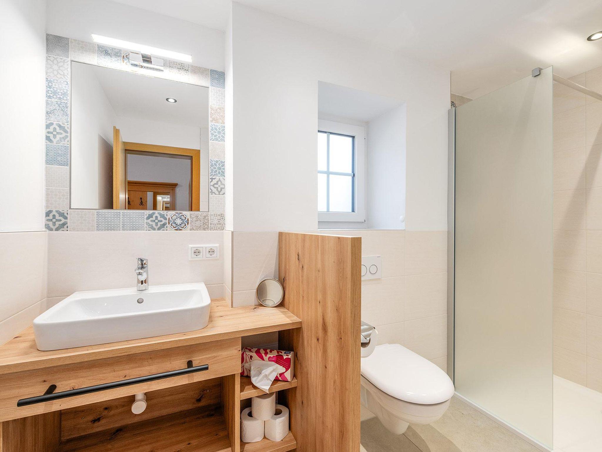 Ein besonderes Highlight ist das Altholz aus dem ehemaligen Dachstuhl, das behutsam aufgearbeitet und in den maßgefertigten Möbeln wiederverwendet wurde. Dieses historische Holz verleiht dem Apartment seine unverwechselbare Atmosphäre und verbindet jahrzehntealte Substanz mit modernem Wohnkomfort.