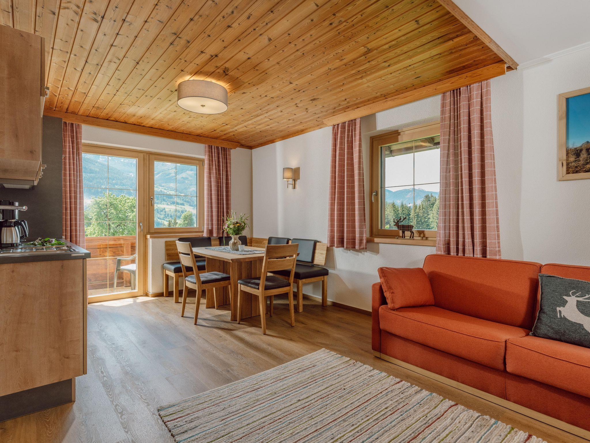 Appartement C - Balkon mit toller Aussicht, ein Schlafzimmer (optional weiteres Schlafzimmer mit eigenem Bad zubuchbar), Schlafcouch für 2 Personen, Fernseher in Schlafzimmer und Küche, Dusche, WC und W-LAN. Diese Wohnung bietet bis zu 4 Personen ein angenehmes Daheim in den Bergen. Ideal z.B. für eine Jungfamilie.