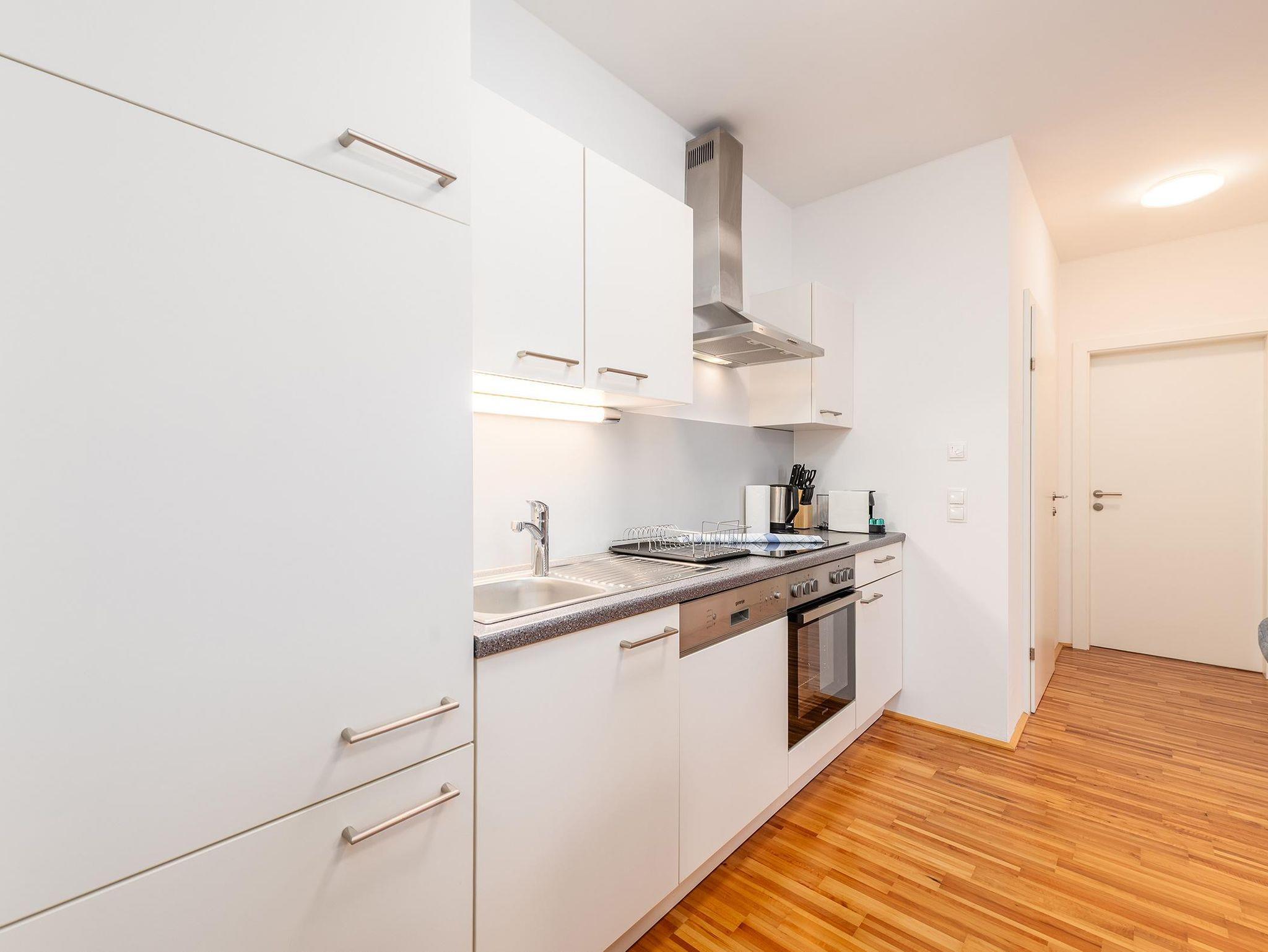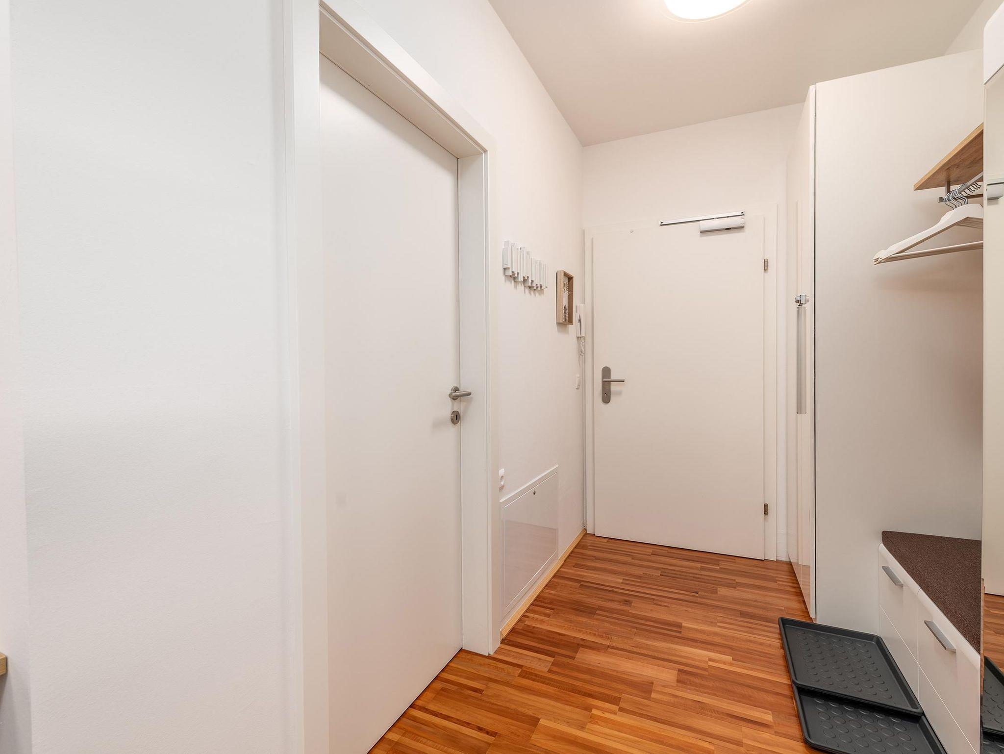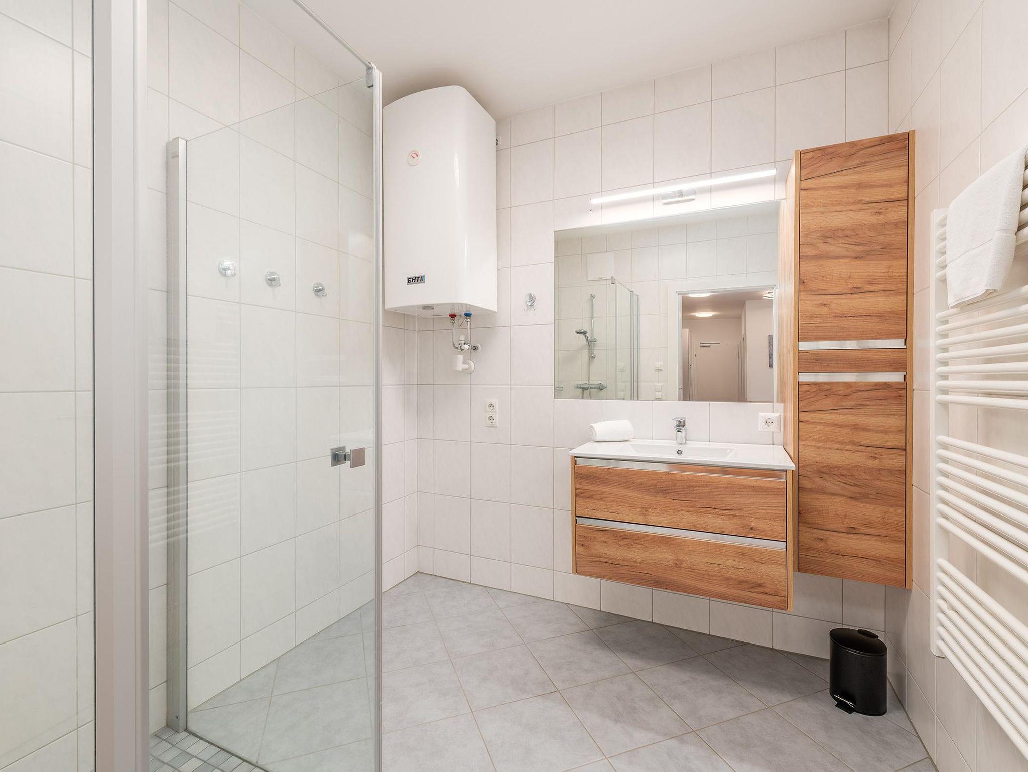Das Apartment befindet sich im Erdgeschoss und verfügt über ein Schlafzimmer mit einem komfortablen 180 cm Doppelbett sowie einem praktischen Etagenbett. Im Wohnbereich bietet eine gemütliche Schlafcouch zusätzlichen Schlafplatz. Die voll ausgestattete Küche lädt zu gemeinsamen Mahlzeiten ein, während die private Terrasse ein wunderbarer Ort für entspanntes Frühstücken oder gemütliche Abende im Freien ist.