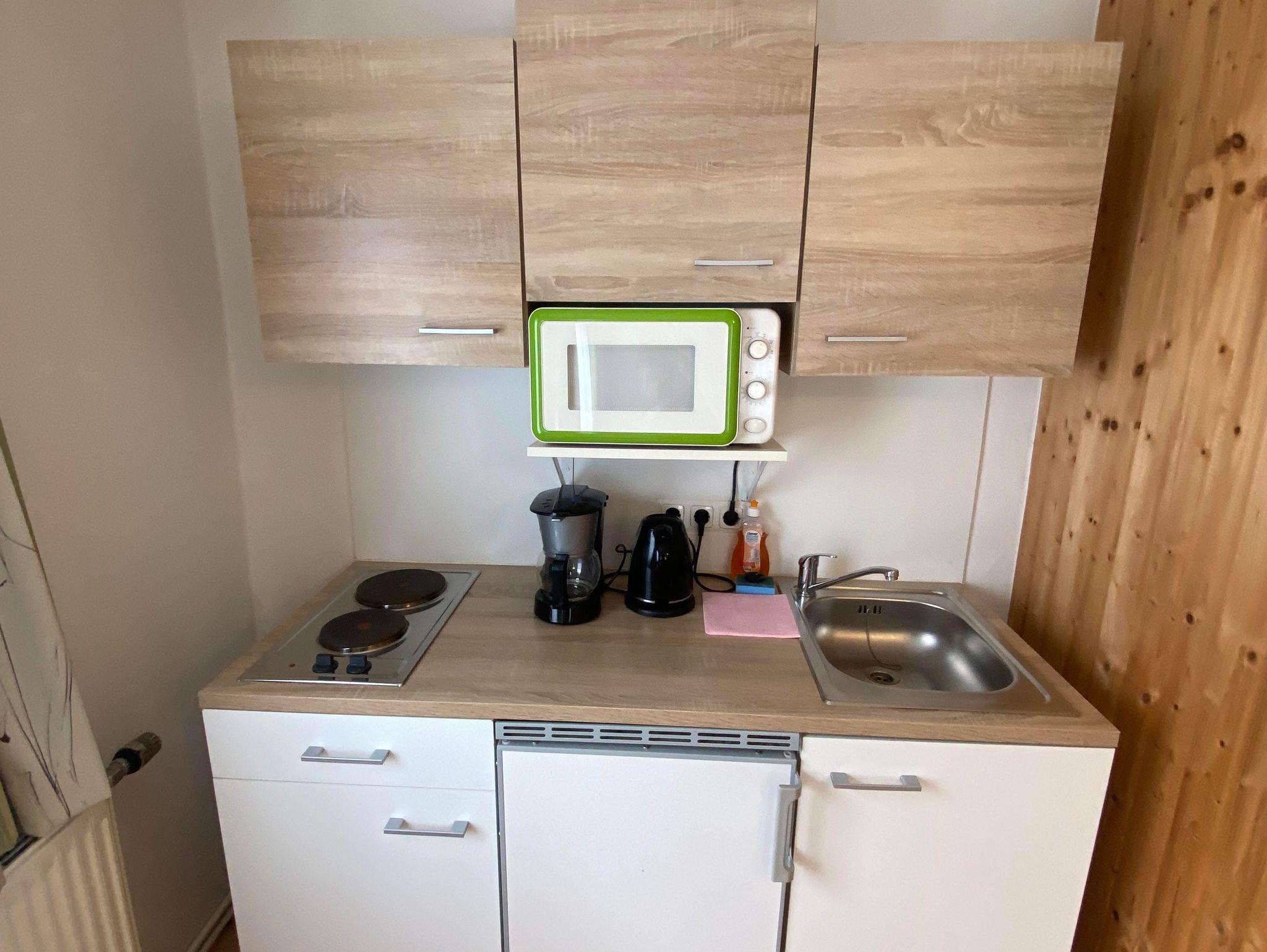 1-Raumappartement mit Doppelbett, Kochnische und Bad.