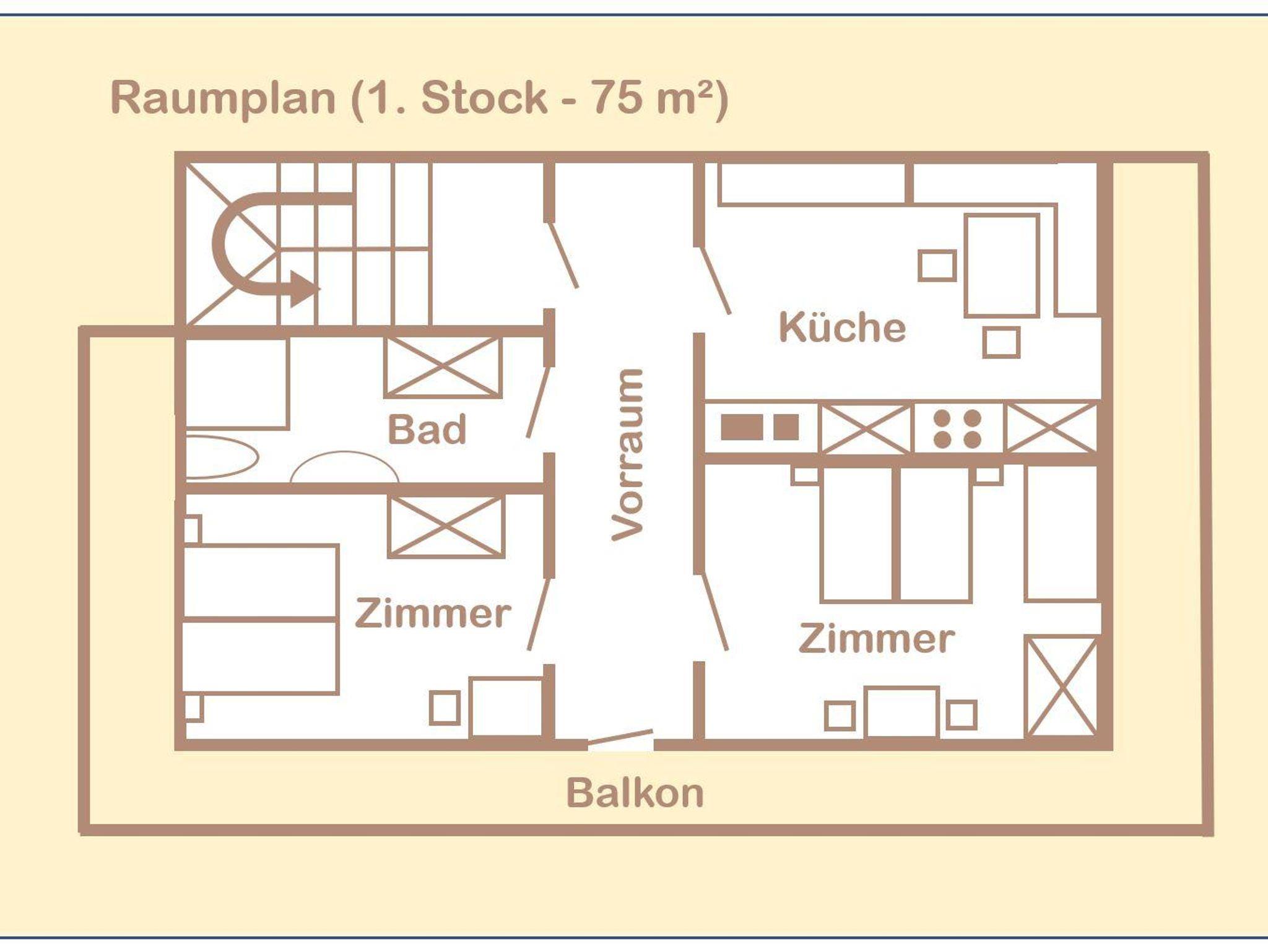 Die Ferienwohnung ist mit 75 m² äußerst geräumig. Es stehen zwei Schlafzimmer, eine große Wohnküche, ein Badezimmer sowie ein Vorraum zur Verfügung. Die Küche ist großzügig ausgestattet und verfügt über einen Kochherd, Kühlschrank, Mikrowelle, Kaffeeautomat, Geschirrspülmaschine und ausreichend Ess- und Kochgeschirr. Im Badezimmer liegen neben Dusche, WC und Waschmöglichkeit auch Handtücher sowie ein Haartrockner bereit. Die Schlafzimmer haben jeweils zwei große Doppelbetten.