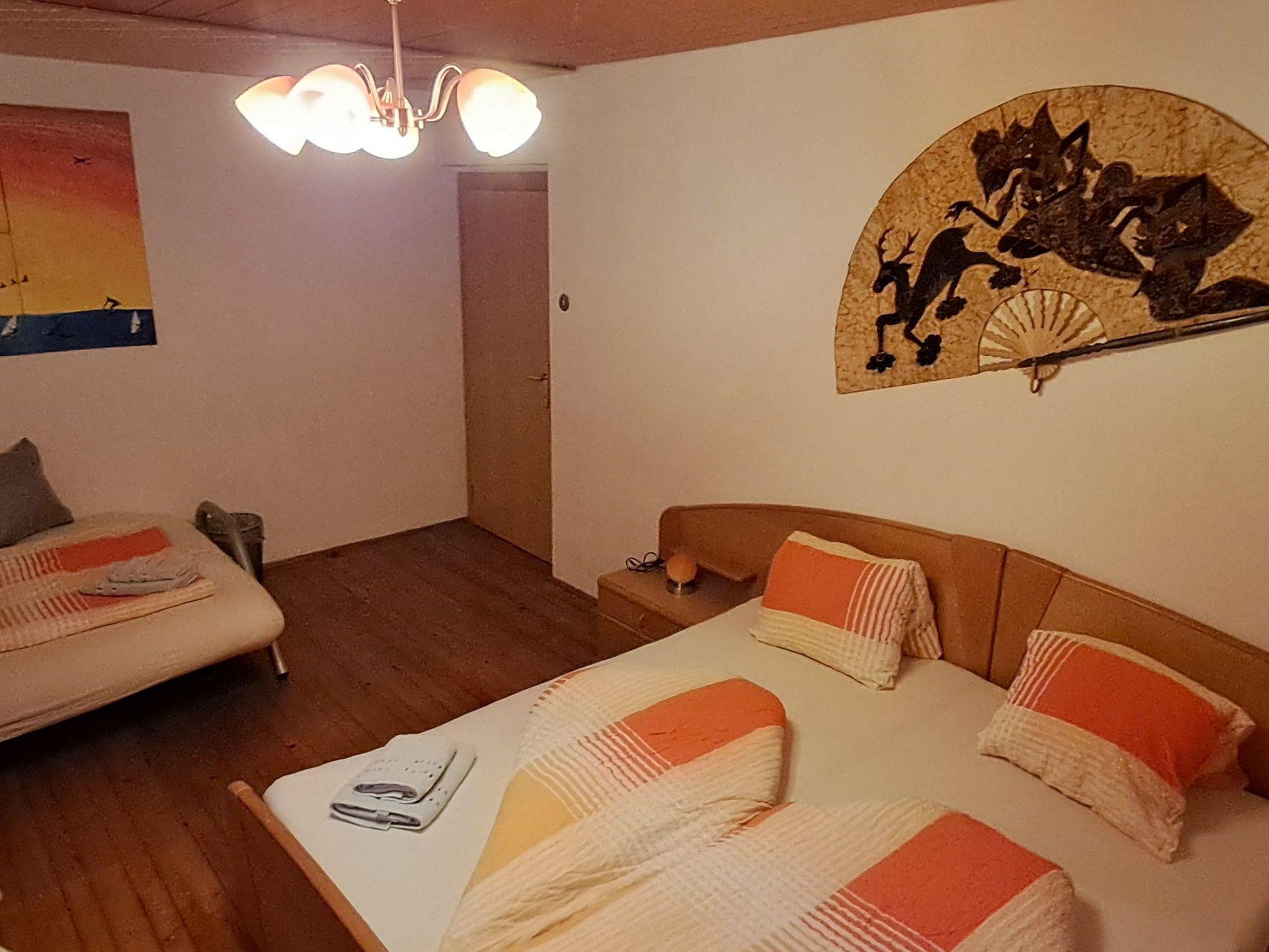 In zwei Zimmern befinden sich jeweils ein Doppelbett sowie ein Einzelbett. In beiden Zimmern sind ebenso Fernseher mit Satellitenanschluss zu finden. Im dritten Zimmer steht ein weiteres Doppelbett. In unserer Ferienwohnung gibt es auch einen schönen Vorraum mit Garderobe. Das Badezimmer verfügt über eine Dusche, ein WC und einen schönen Waschbereich. In der Küche findet man genügend Platz für bis zu 8 Personen. Mit einem großen Esstisch und einem Fernseher mit Satellitenanschluss steht auch gemütlichen Fernsehabenden nichts im Wege. Direkt von der Küche aus kommt man auf die Terasse wo sich auch der direkte Anschluss an den Garten mit Kamingrill befindet. Dort kann man gemütliche Grillabende genießen.