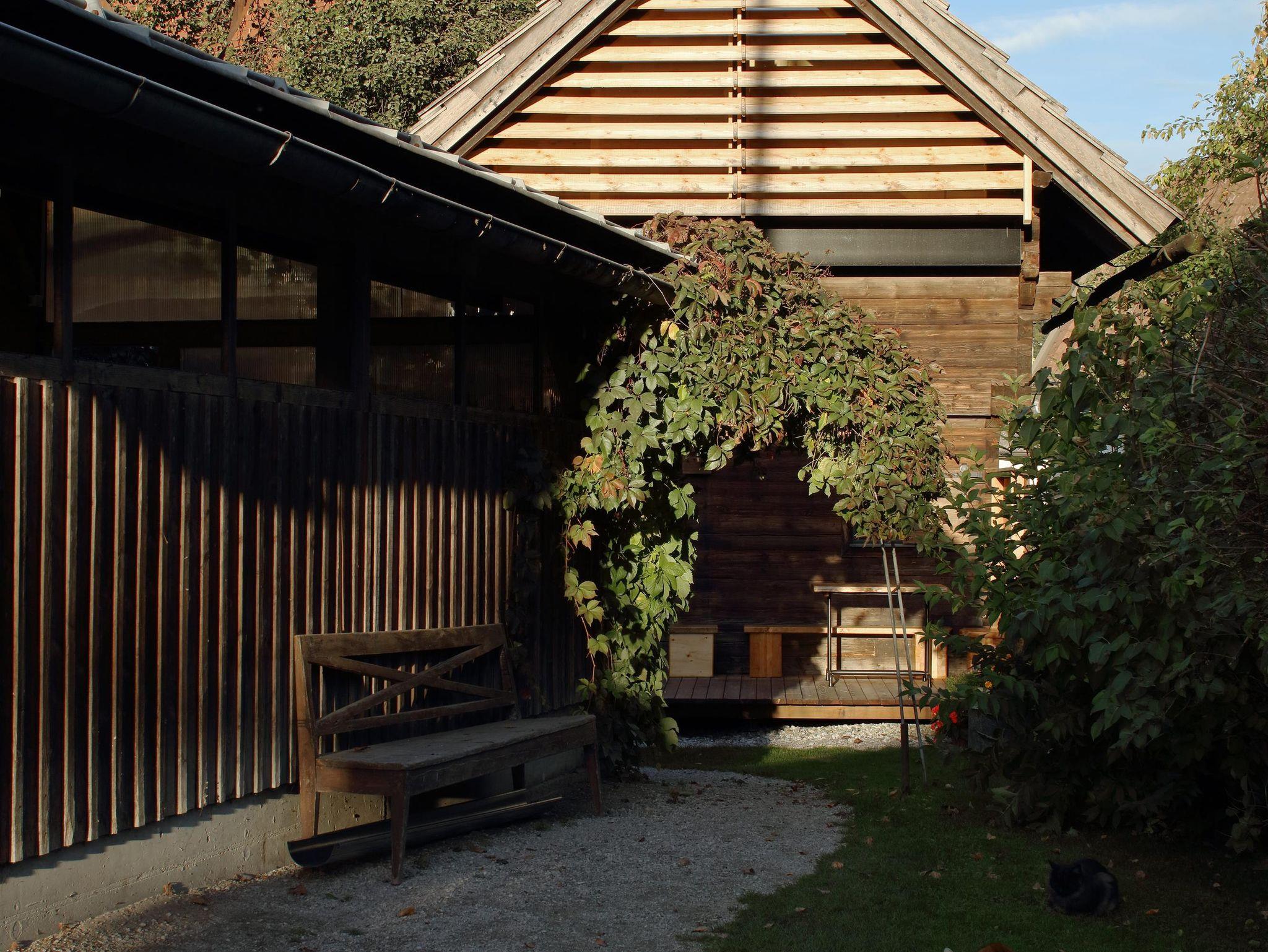 Im Erdgeschoß befindet sich der Wohnraum mit einer komplett eingerichteten Küche, Garderobe und WC. Eine lange Holzbank lädt zum Sitzen oder Entspannen ein.