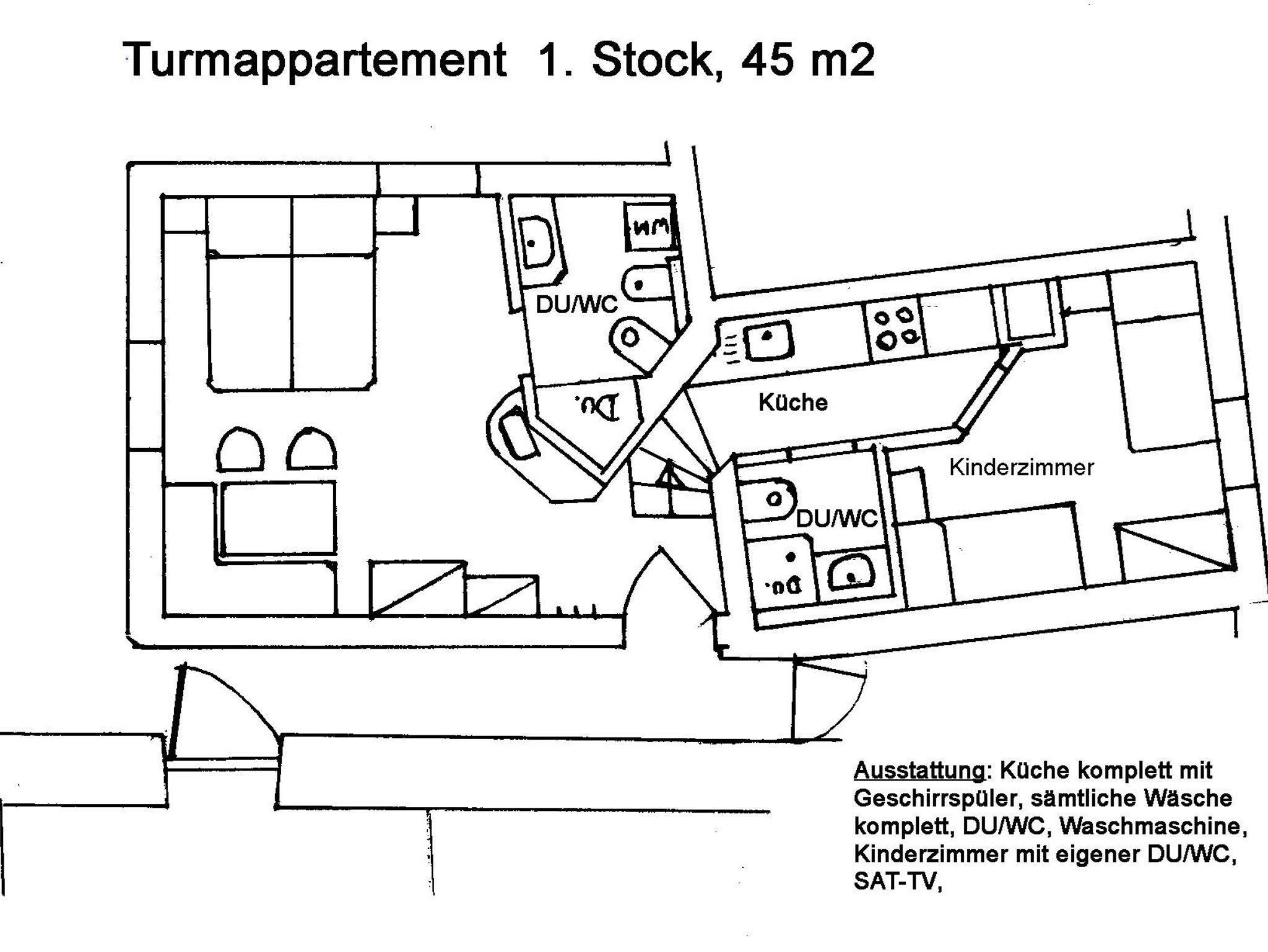 Appartement mit eigenem Kinderzimmer (Dusche und WC), Wohn-Schlafraum für Eltern (Doppelbett, DU/WC), Küche kompl. eingerichtet inkl. Geschirrspüler. Sat-TV. Zugang zur Terrasse.