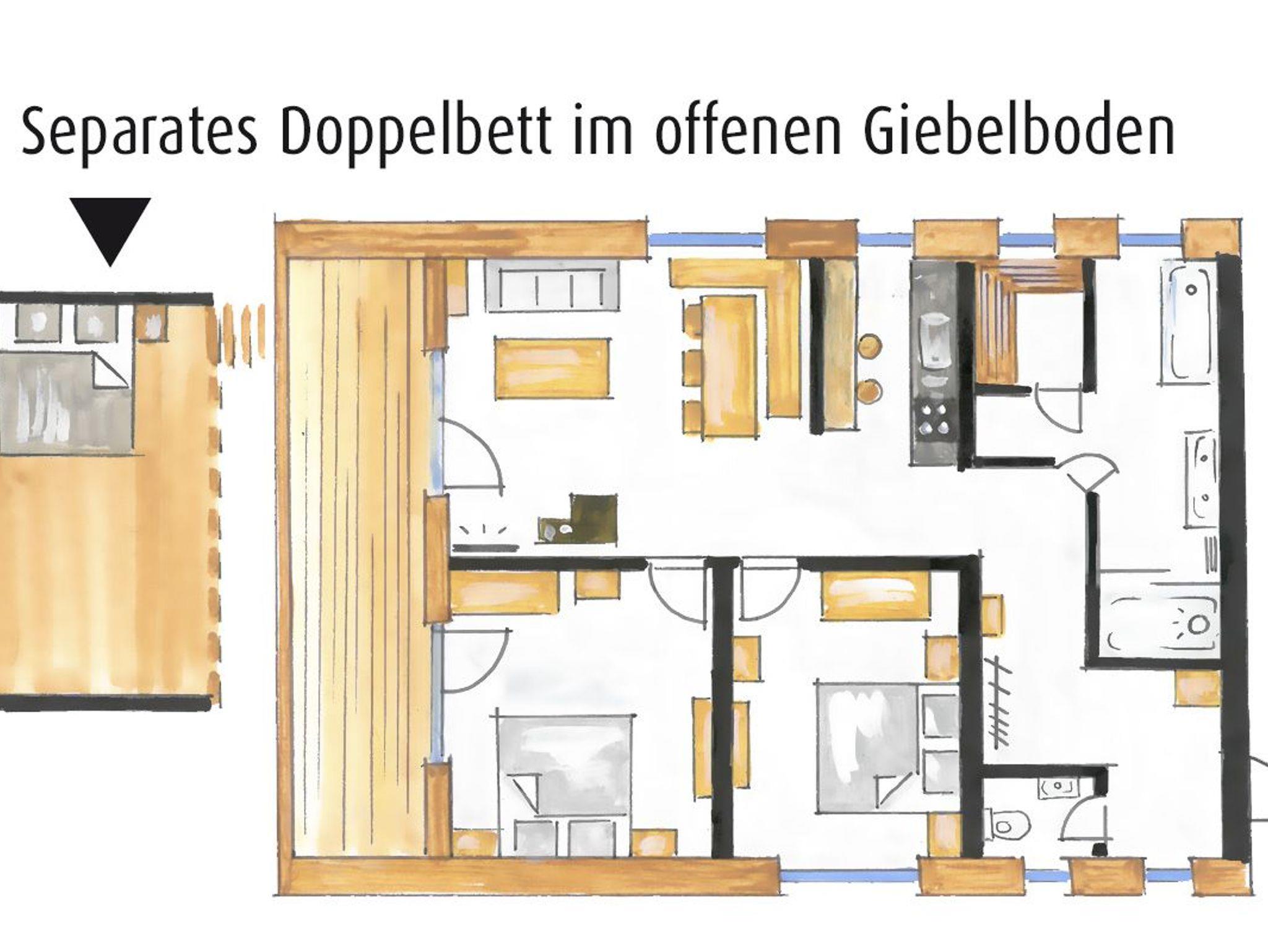 · 1 Schlafgalerie mit Doppelbett (160x200cm) im Dachboden