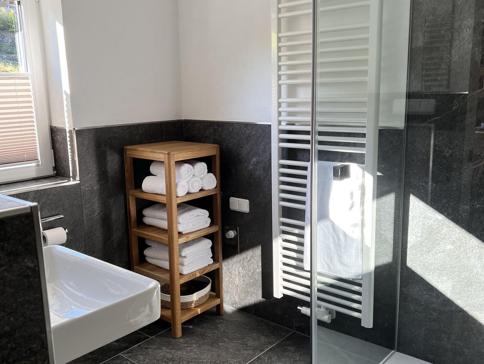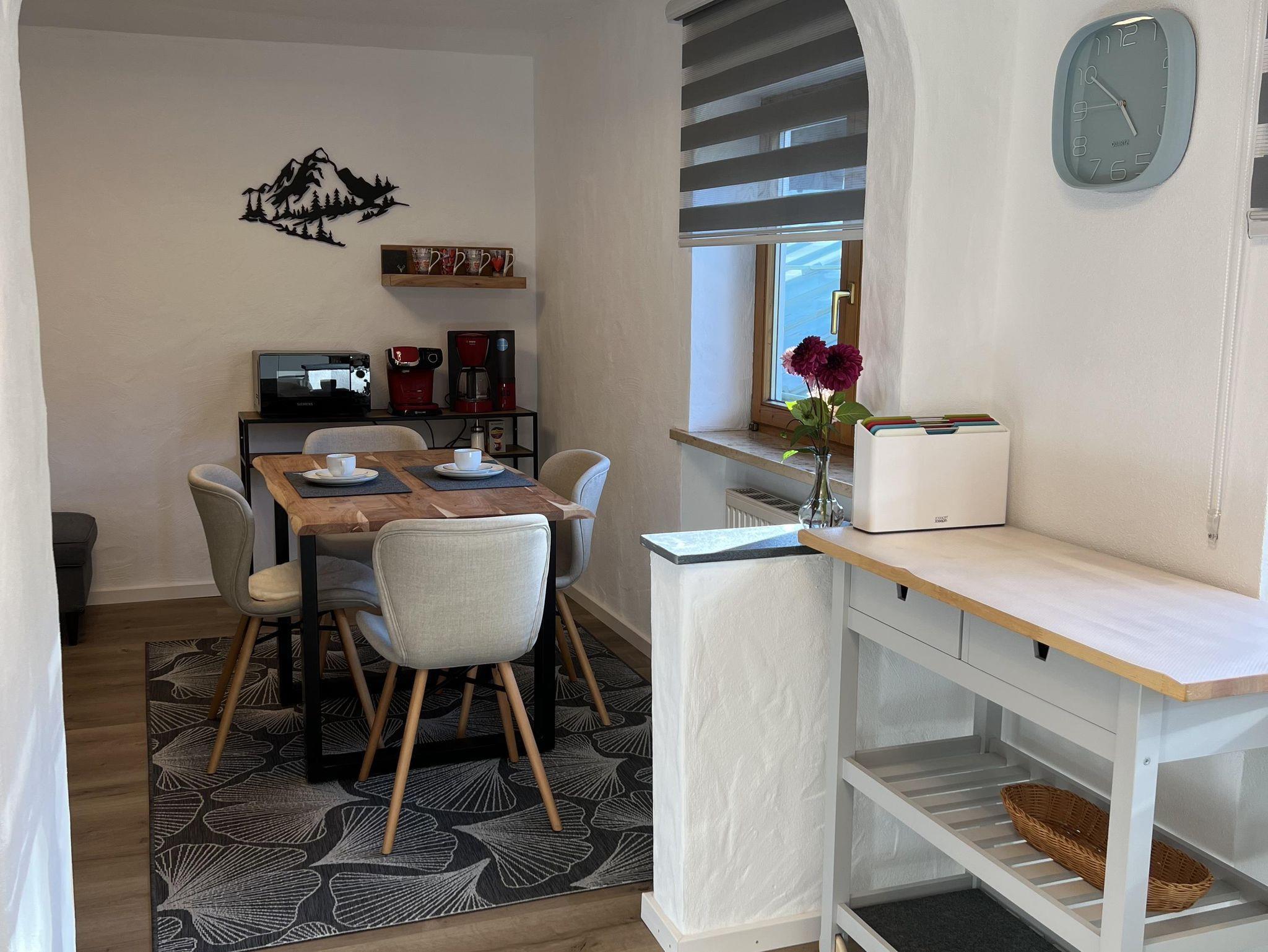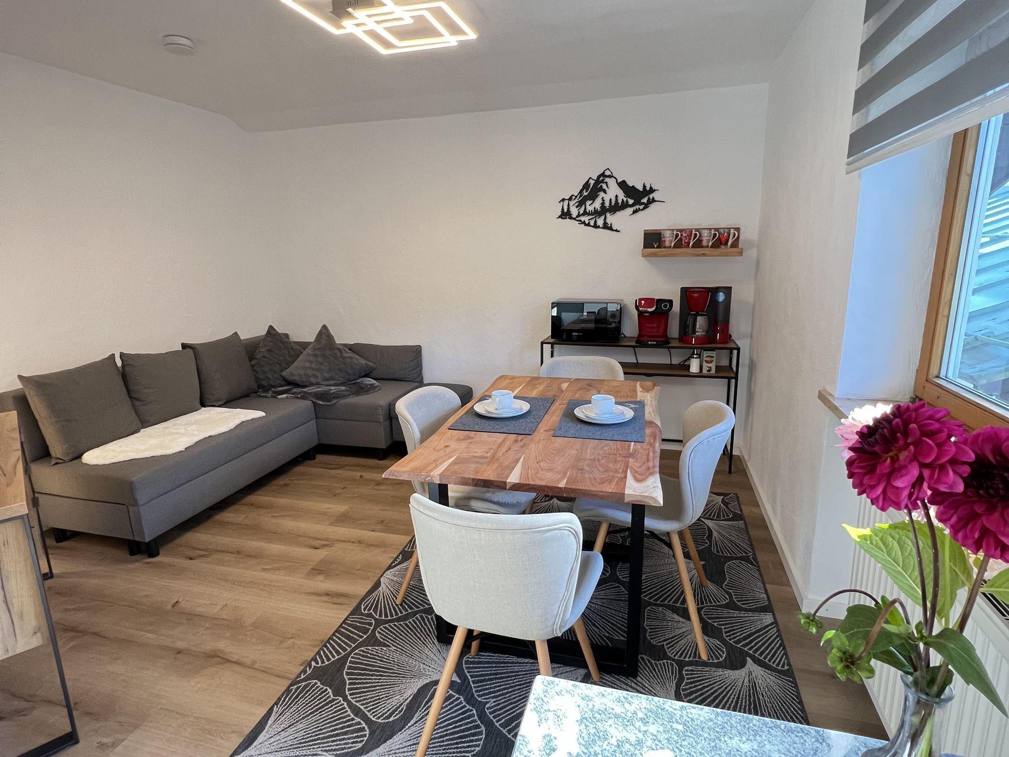 Schöne Ferienwohnung im Obergeschoss (renoviert 2022) mit Dusche/WC, Küchenzeile mit Kühlschrank/Gefrierfach, Geschirrspülmaschine, TASSIMO Kapsel-Maschine, Wasserkocher, Toaster und 2er Touch Control Cerankochfeld. Wohnbereich mit Massivholztisch, Fernseher mit A1-TV-Box und Schlafsofa. Abgetrennter Balkon am Schlafzimmer in Richtung Osten mit Klapptisch und zwei Stühlen. Eigene Terrasse im Garten mit Gartenmöbeln und tollem Ausblick in die Walser Berge.